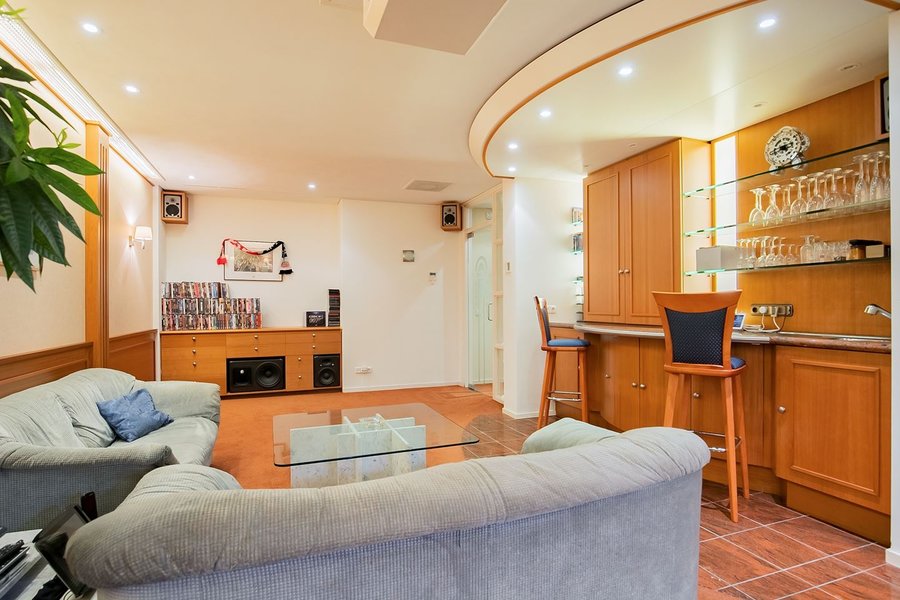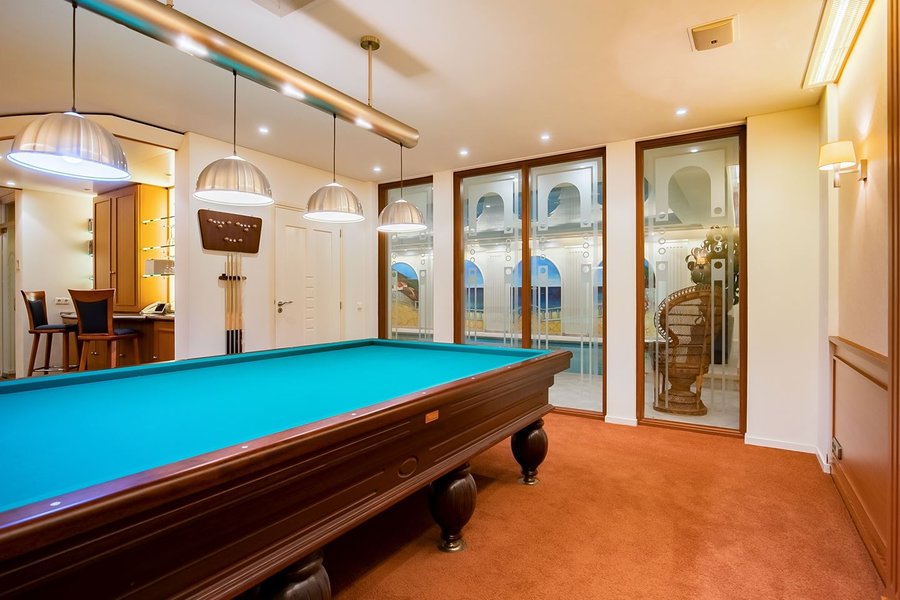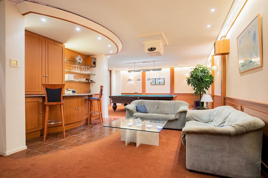 Beneden gekomen opent een automatische glazen schuifdeur de toegang tot een hal, van waaruit een grote ruimte met de bar (voorzien van Creston gestuurde bediening), de thuisbioscoop met Marantz projector en Domotica-gestuurde geluidsinstallatie en groot scherm, de binnen-berging met staande kluis en de biljartruimte, met een groot Wilhelmina biljart bereikbaar zijn. De ideale omstandigheden om met een drankje, een film te kijken en/of te biljarten in een gezellige en comfortabele ambiance.
