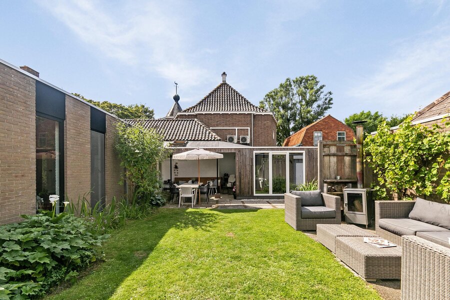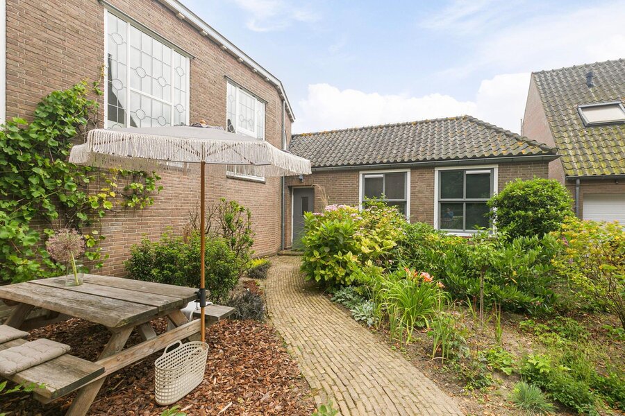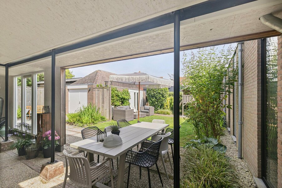 De tuin is aan de achterzijde gelegen en via achterom aan de achterzijde bereikbaar. De tuin met terras is beschut en heerlijk op zon. Aan de woning is de veranda waar u heerlijk de dag kunt starten of de dag kunt eindigen met glas wijn. Achter in de tuin staat een extra garage met berging en er is een extra berging voor de fietsen