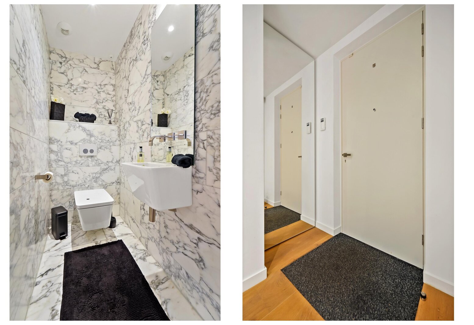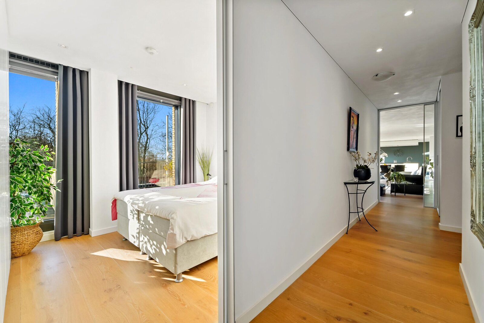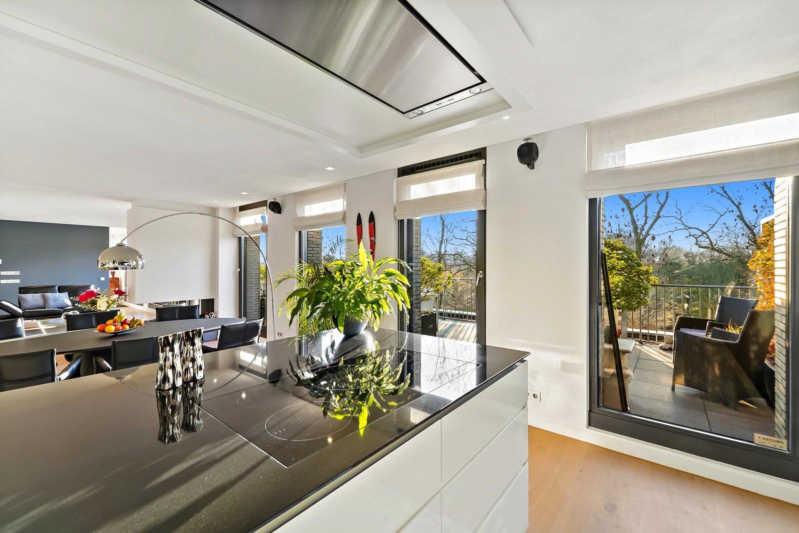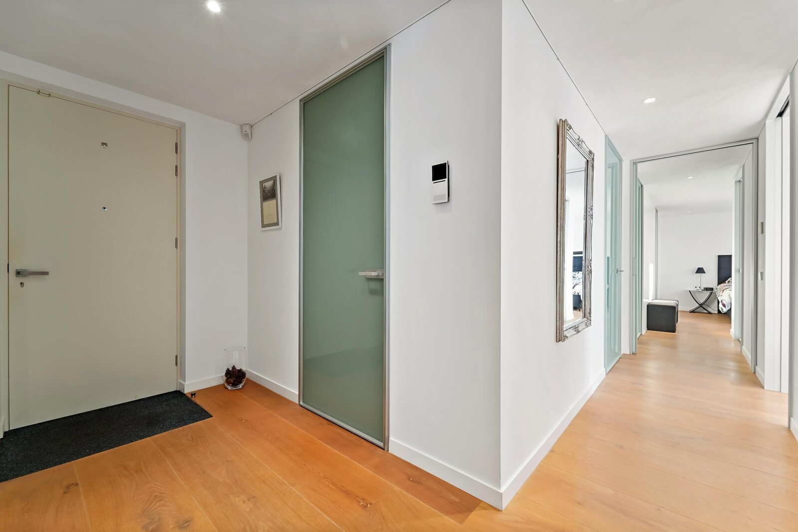 Via de stijlvolle entree met garderobe en toilet met fontein betreedt u dit exclusieve appartement. Een elegante doorloop met glazen schuifdeur leidt naar de heerlijk lichte living, voorzien van massief eiken brede vloerdelen en royale schuifpuien naar het riante terras. De zit- en eetruimte worden op natuurlijke wijze van elkaar gescheiden door de indrukwekkende, tweezijdige Boley gas-openhaard, een echte eyecatcher. De luxe keuken is een droom voor elke kookliefhebber, met een royaal kook- en spoeleiland en een volledig geïntegreerde apparatenwand, die dankzij een schuifwand desgewenst subtiel aan het zicht kan worden onttrokken. Aangrenzend bevindt zich de study, deels open verbonden met de living en eveneens direct gelegen aan het terras, de ideale plek om in alle rust te werken of te lezen. Via de gang bereikt u de privé-vertrekken. De hoofdslaapkamer is een oase van rust en luxe, met twee royale inloopkasten en een ensuite badkamer die voelt als een privéspa. Deze uitzonderlijk afgewerkte ruimte biedt een vrijstaand bad, vrijhangend toilet, royale stort- en handdouche met glazen scherm, een elegant wastafelmeubel, handdoekradiator en een raam voor daglichttoetreding vanaf het terras. De comfortabele tweede slaap-/logeerkamer beschikt over een praktische kastenwand, een stijlvolle gastenbadkamer met glazen douchewand, modern wastafelmeubel en handdoekradiator. Tevens een ruime berging met aansluitingen voor was- en droogapparatuur.