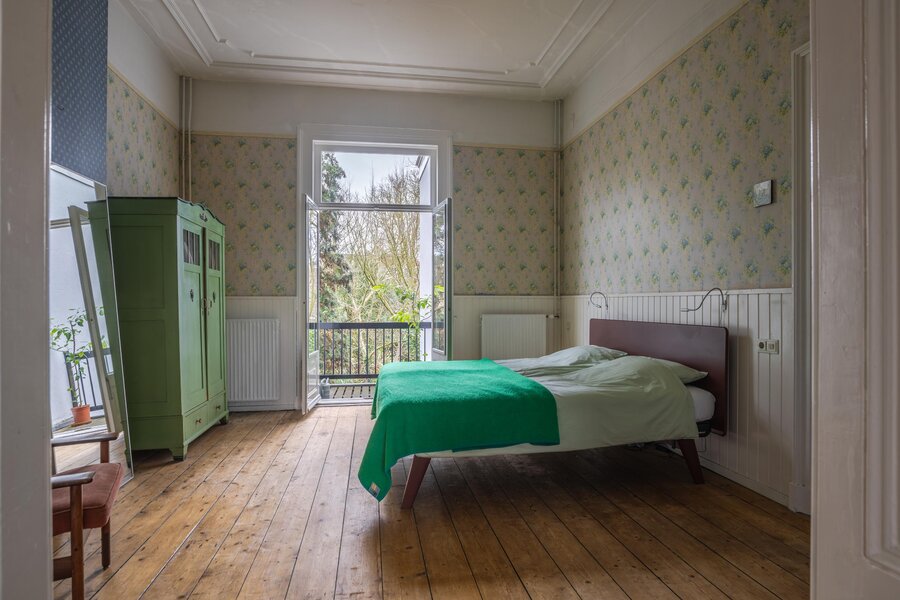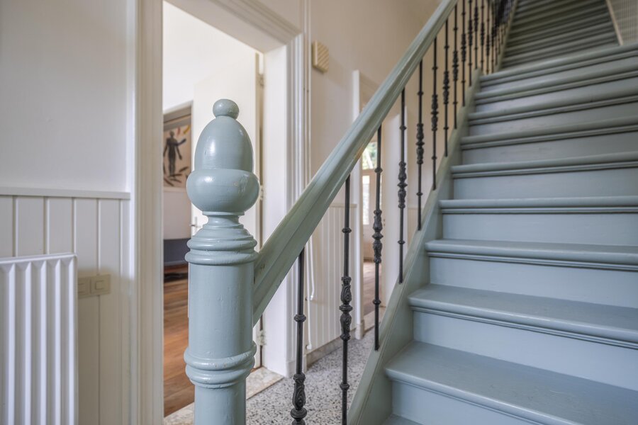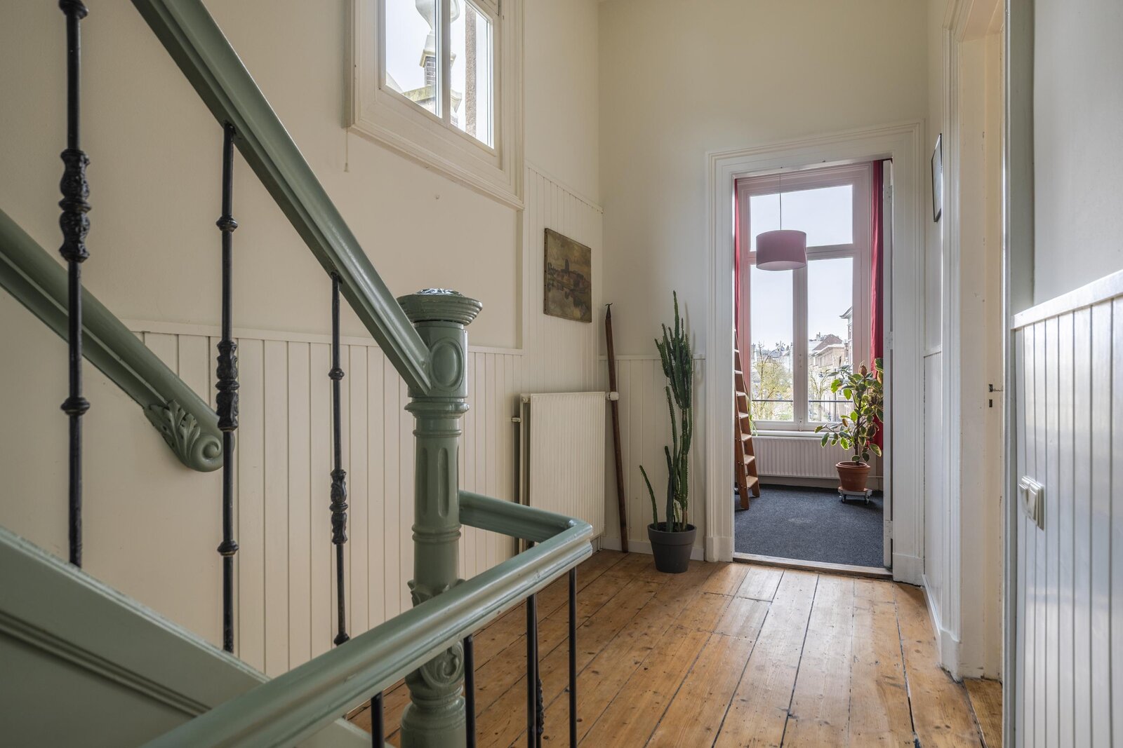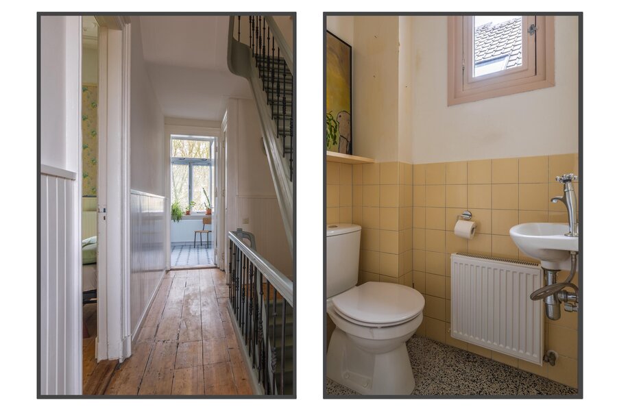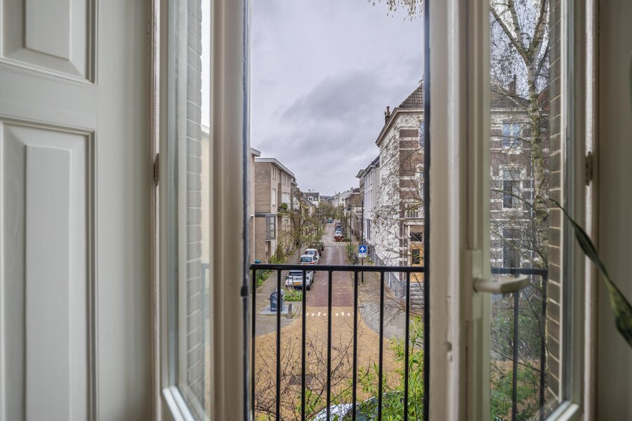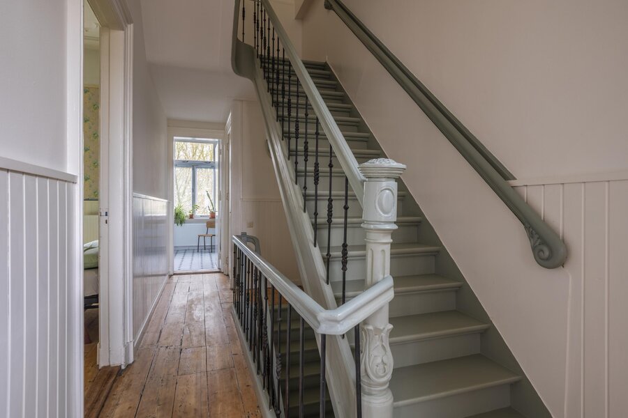Authentiek trappenhuis met rijk gedetailleerd houtsnijwerk, dat leidt naar een ruime overloop. Vanaf de overloop is er toegang tot twee bijzonder grote slaapkamers en een derde slaap-/werkkamer, gelegen aan de voorzijde van de woning. De achtergelegen hoofdslaapkamer biedt bovendien toegang tot een balkon. Vanuit de hal zijn het separate toilet met fonteintje en de zeer royale badkamer bereikbaar. De badkamer is compleet uitgevoerd en voorzien van een comfortabel ligbad, een douchecabine en een wastafel.