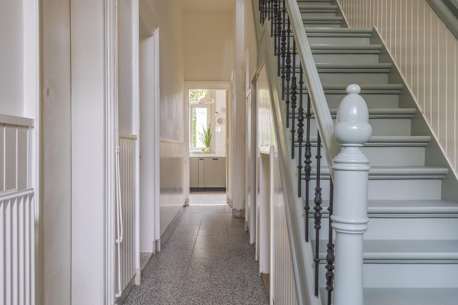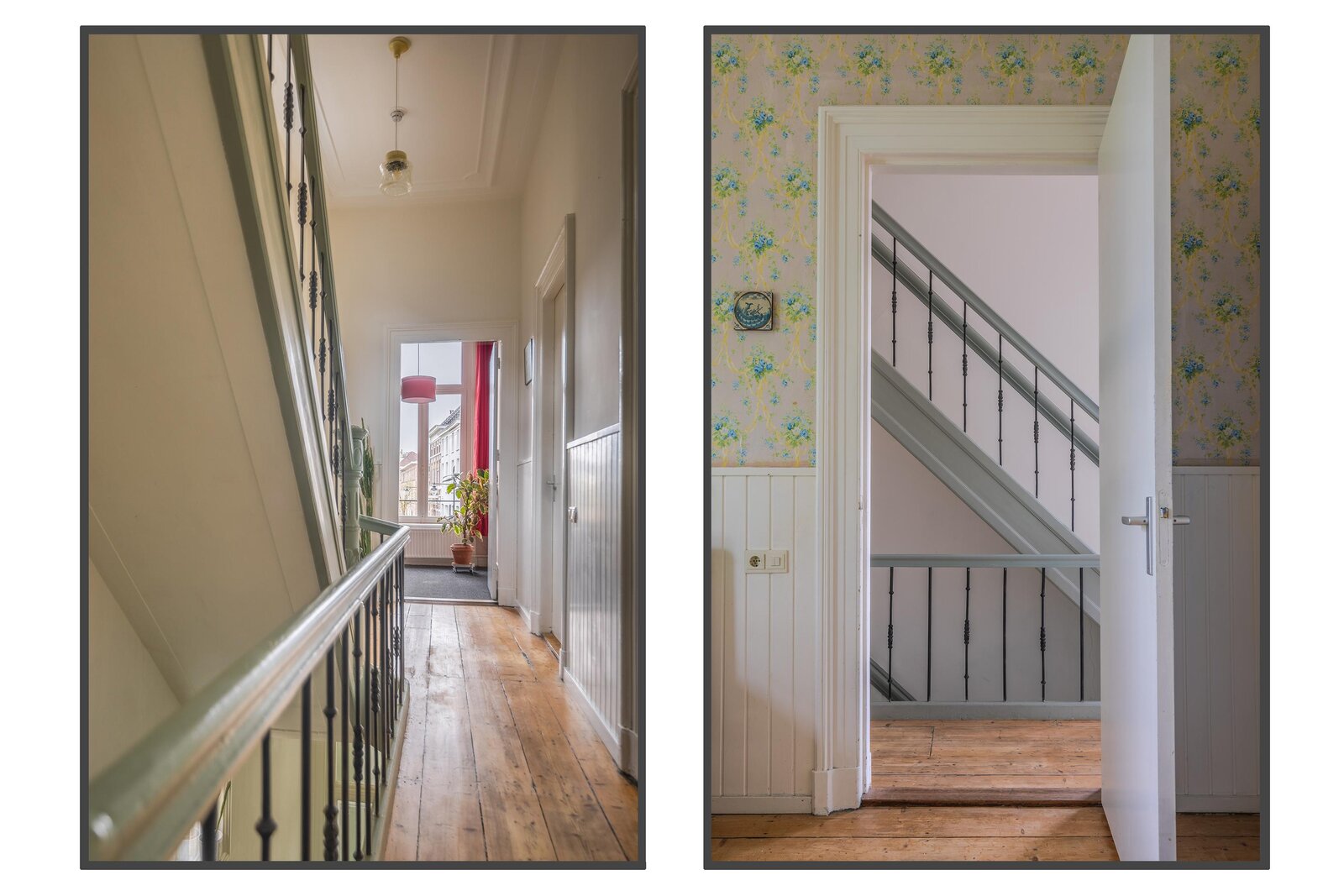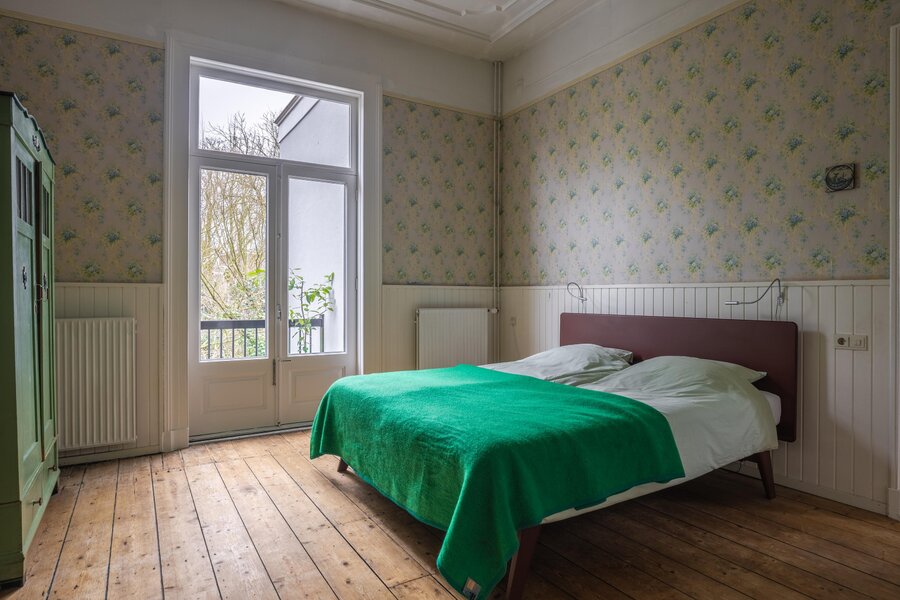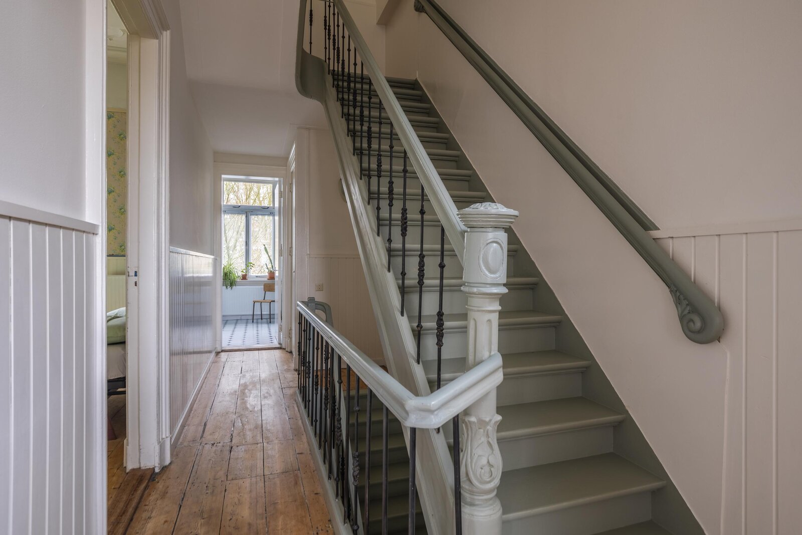 Authentiek trappenhuis met rijk gedetailleerd houtsnijwerk, dat leidt naar een ruime overloop. Vanaf de overloop is er toegang tot twee bijzonder grote slaapkamers en een derde slaap-/werkkamer, gelegen aan de voorzijde van de woning. De achtergelegen hoofdslaapkamer biedt bovendien toegang tot een balkon. Vanuit de hal zijn het separate toilet met fonteintje en de zeer royale badkamer bereikbaar. De badkamer is compleet uitgevoerd en voorzien van een comfortabel ligbad, een douchecabine en een wastafel.