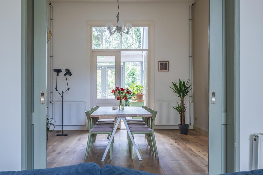 Via de voortuin bereikt u de entree van de woning. Opvallend is dat deze woning geen trap heeft bij de voordeur, wat zorgt voor een comfortabele en toegankelijke binnenkomst. Entree geeft toegang tot de hal met meterkast en garderoberuimte. Vanuit de hal bereikt u de trapopgang naar de verdiepingen en de royale en sfeervolle woonkamer aan de voorzijde, gekenmerkt door een prettige lichtinval en een fraaie plafondhoogte. De woonkamer staat in verbinding met de eetkamer aan de achterzijde middels en-suite deuren, waardoor de ruimtes zowel afzonderlijk als open te gebruiken zijn. De eetkamer biedt voldoende ruimte voor een grote eettafel en vormt het hart van de woning.
