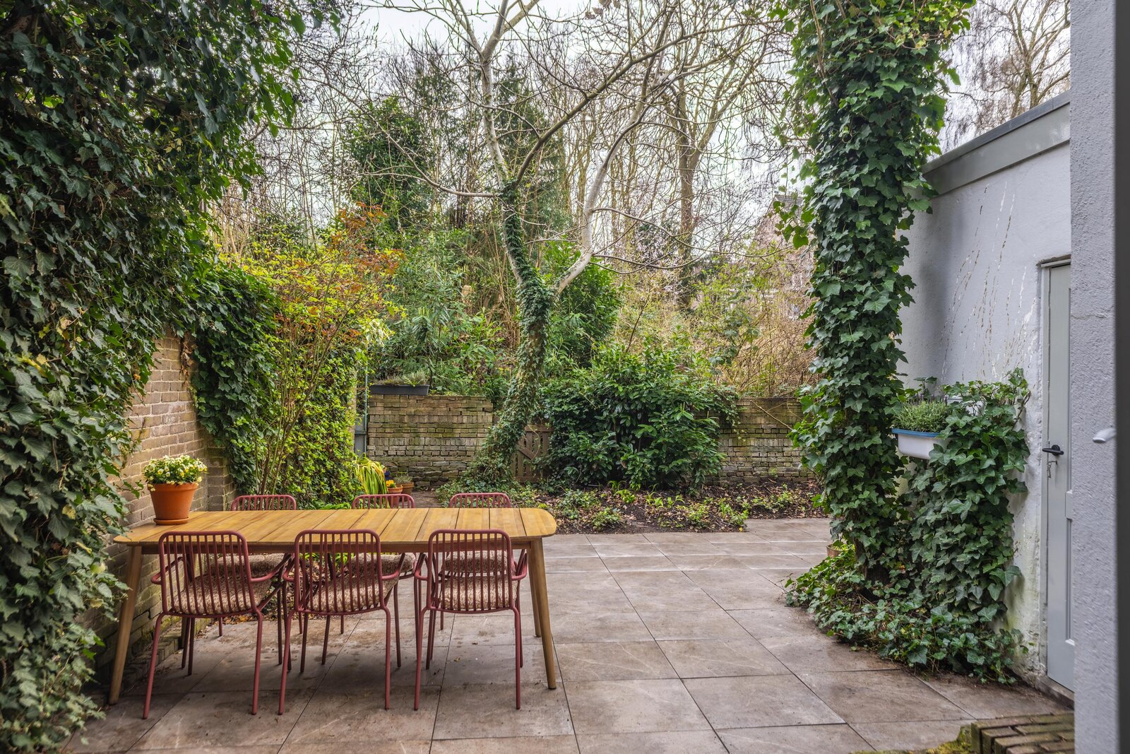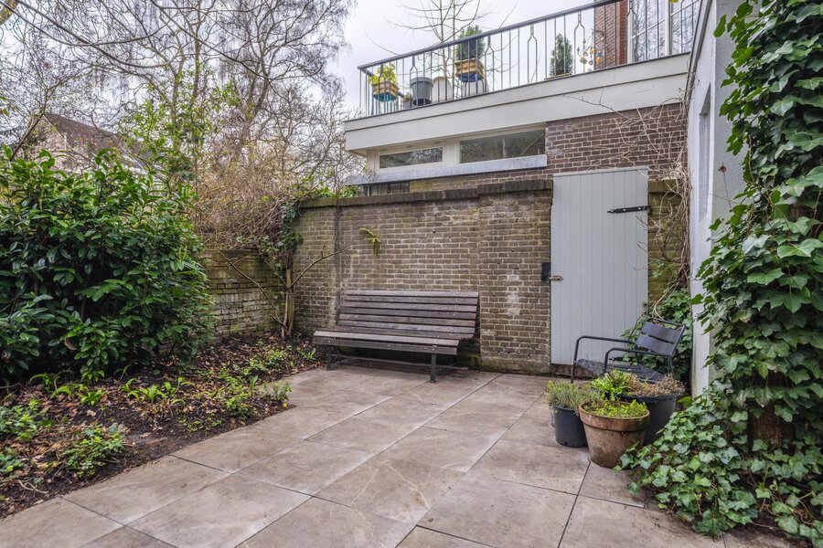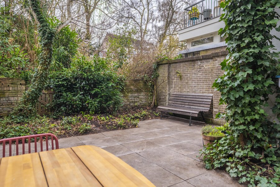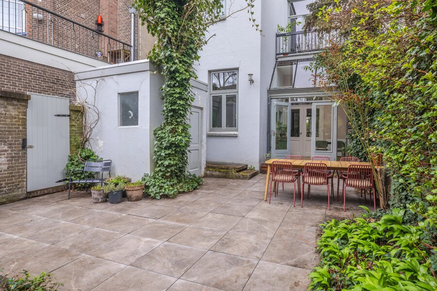 De tuin is een heerlijke, ruime stadstuin die volledig wordt omsloten door een combinatie van groene hagen en muren, wat zorgt voor een fijne, beschutte sfeer en optimale privacy. De tuin is stijlvol aangelegd met strakke tegels en weelderige groene borders. Daarnaast beschikt de tuin over een praktische achterom via een charmante houten poort.