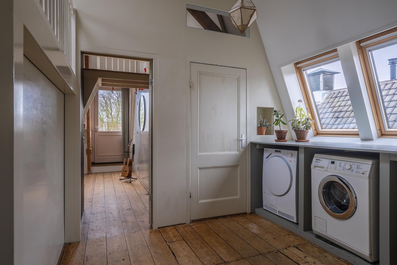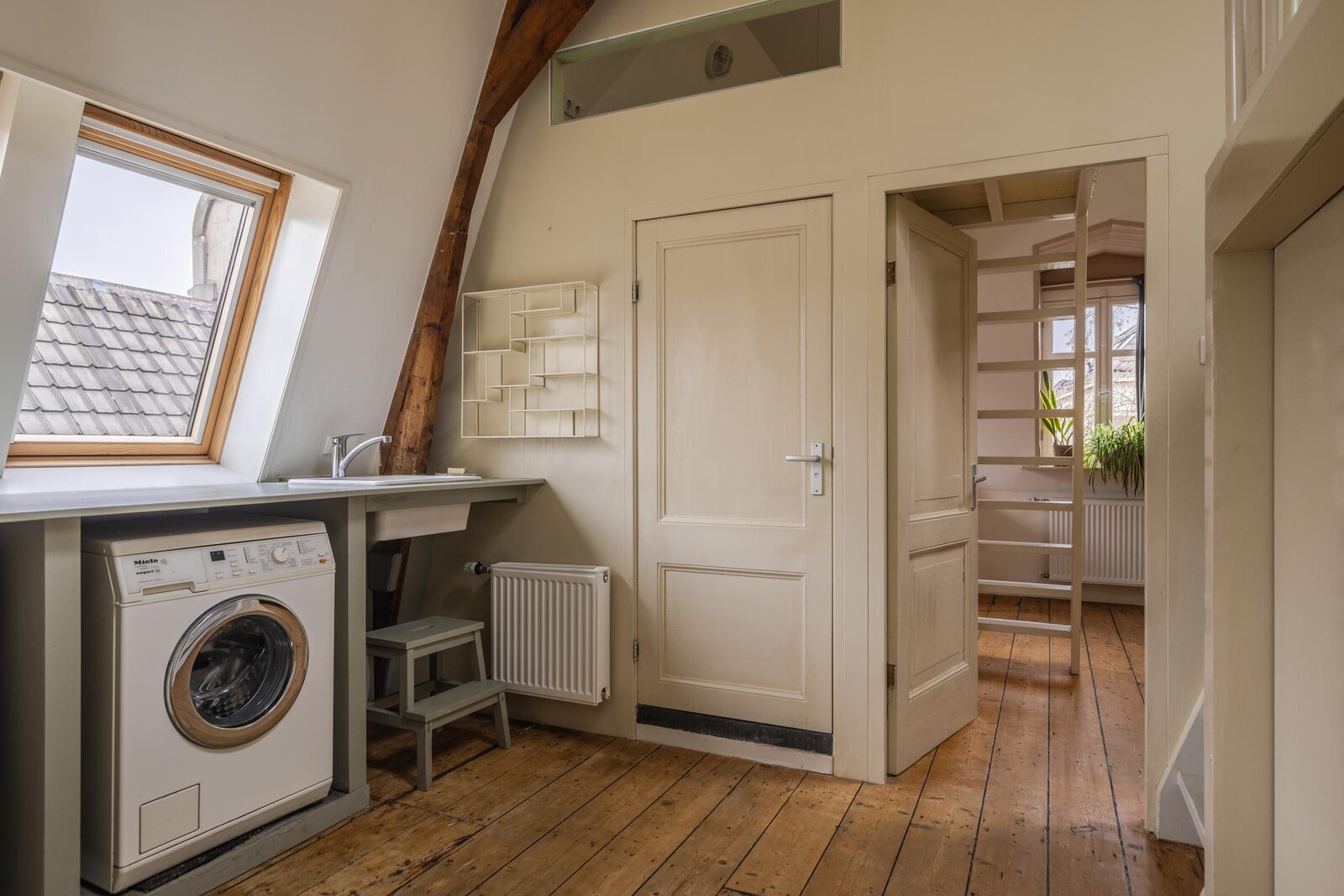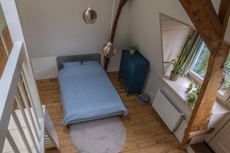 De tweede verdieping kenmerkt zich door een speelse en verrassende indeling. Via een eerste, compacte overloop met een praktische vaste bergkast bereikt u een ruime centrale overloop. Hier bevinden zich de opstelplaatsen voor een wasmachine, wasdroger en een wastafel, wat deze verdieping ook functioneel maakt voor dagelijks gebruik. Tevens is hier de tweede badkamer gesitueerd, voorzien van een toilet en een inloopdouche. Aan de voorzijde van de woning bevindt zich een zeer royale slaapkamer met een speelse indeling. Deze kamer beschikt over vaste kasten en een charmant trapje naar een vide. De zichtbare spanten geven de ruimte een authentiek en sfeervol karakter. Ook de slaapkamer aan de achterzijde heeft een uniek karakter, met een leuke vide en eveneens zichtbare spanten. Vanuit deze kamer heeft u directe toegang tot een verrassend ruim dakterras. Vanaf de overloop leidt een derde trapje naar een extra vide, die niet alleen volop opbergmogelijkheden biedt, maar ook uitstekend kan dienen als werk-, hobby- of extra bergruimte.
