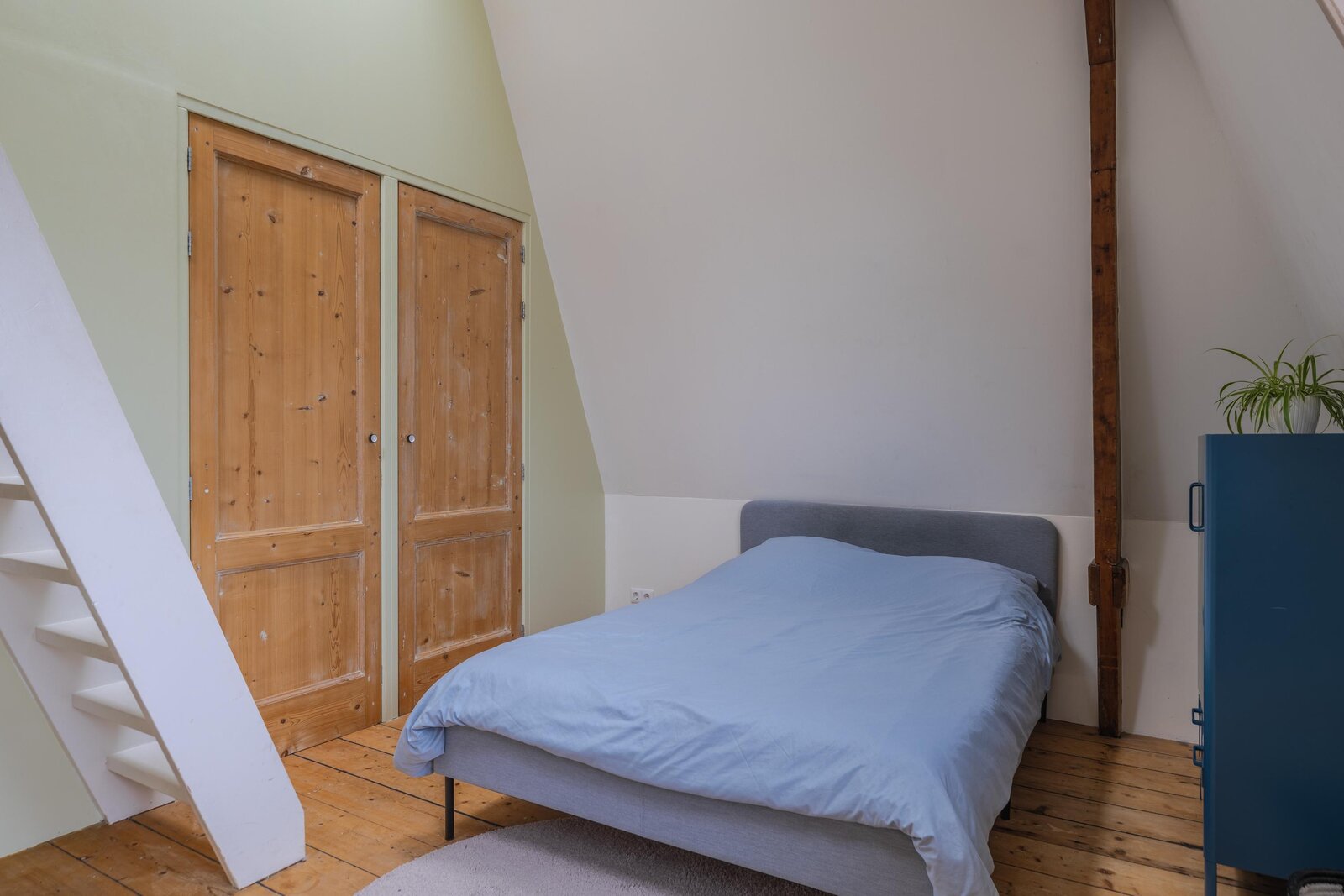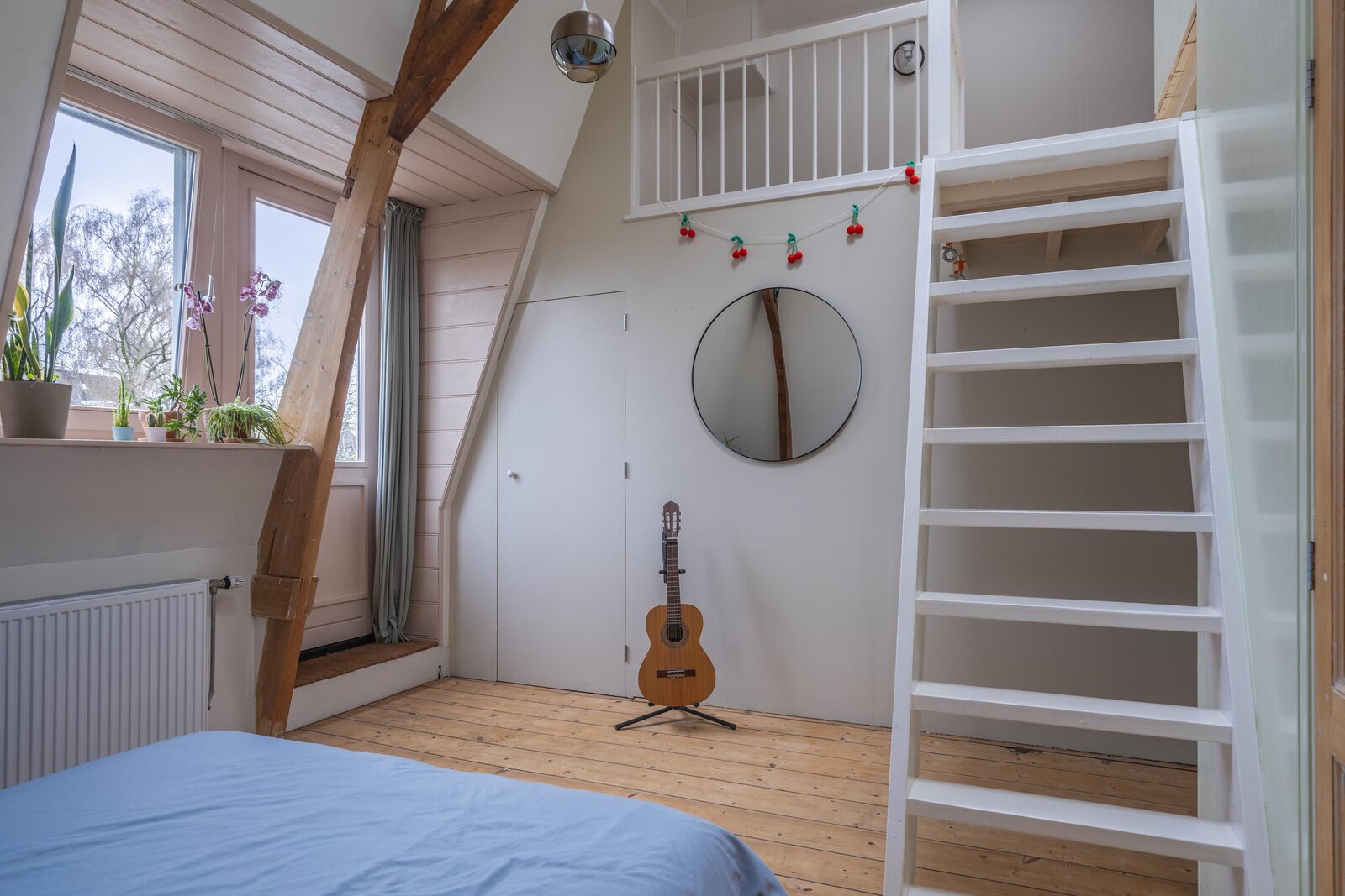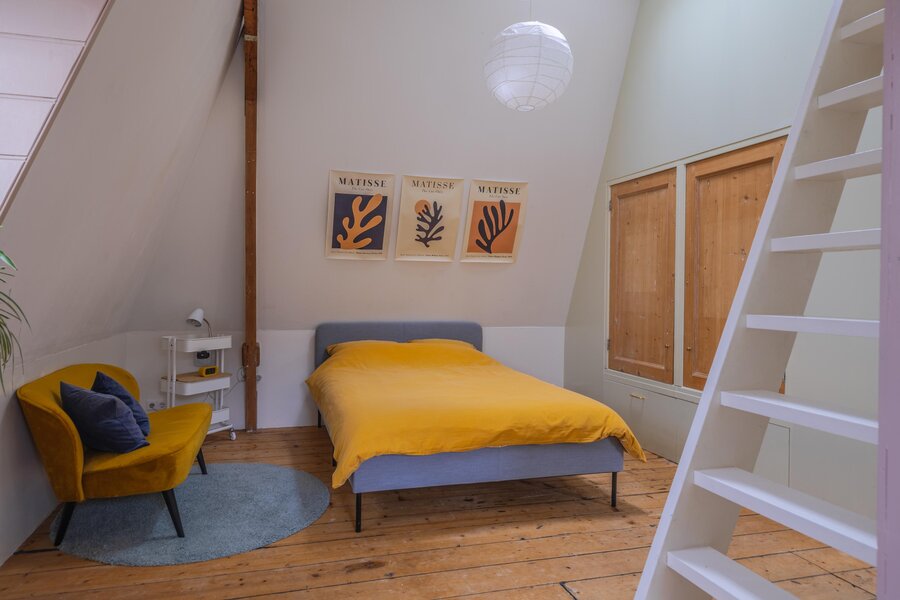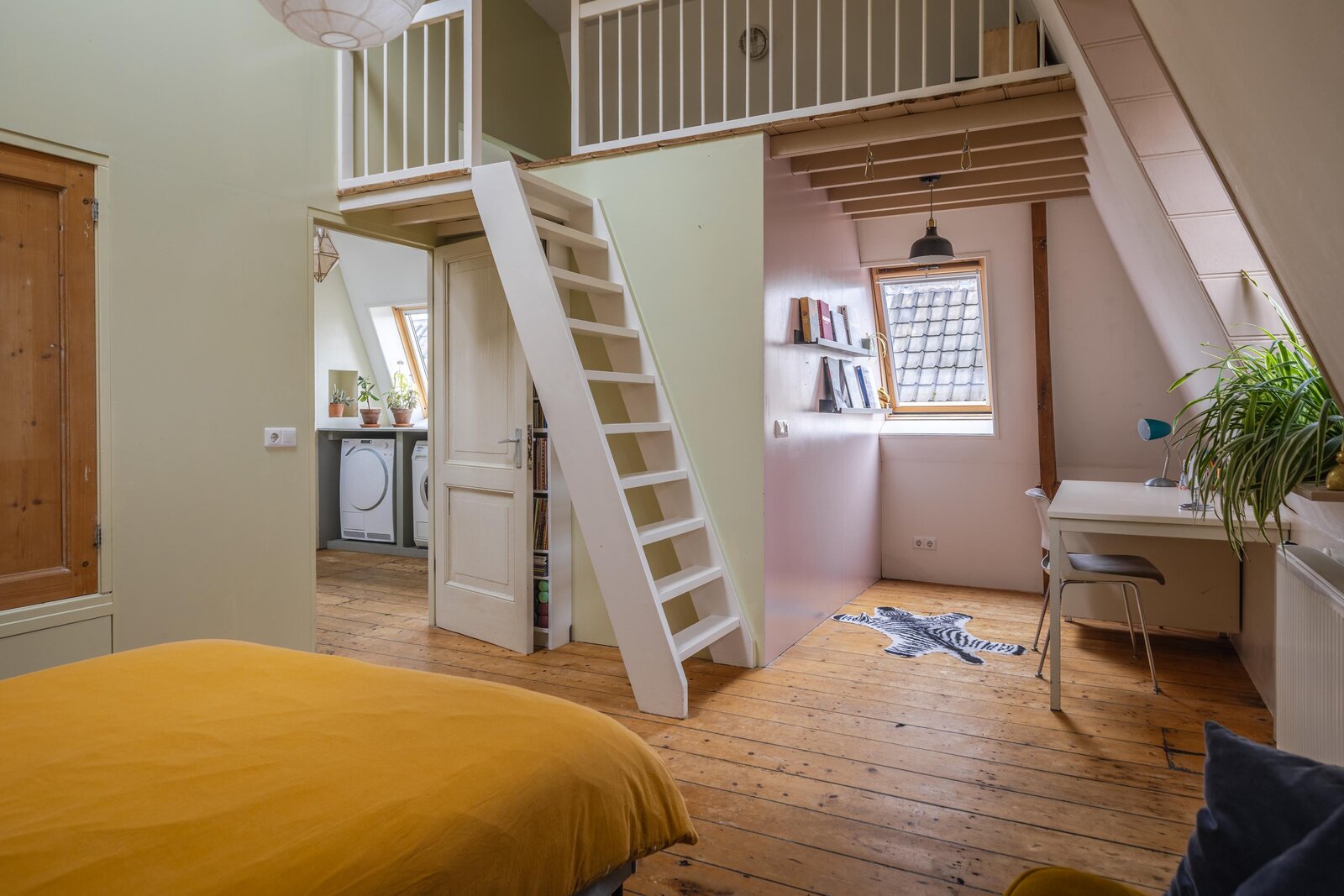 De tweede verdieping kenmerkt zich door een speelse en verrassende indeling. Via een eerste, compacte overloop met een praktische vaste bergkast bereikt u een ruime centrale overloop. Hier bevinden zich de opstelplaatsen voor een wasmachine, wasdroger en een wastafel, wat deze verdieping ook functioneel maakt voor dagelijks gebruik. Tevens is hier de tweede badkamer gesitueerd, voorzien van een toilet en een inloopdouche. Aan de voorzijde van de woning bevindt zich een zeer royale slaapkamer met een speelse indeling. Deze kamer beschikt over vaste kasten en een charmant trapje naar een vide. De zichtbare spanten geven de ruimte een authentiek en sfeervol karakter. Ook de slaapkamer aan de achterzijde heeft een uniek karakter, met een leuke vide en eveneens zichtbare spanten. Vanuit deze kamer heeft u directe toegang tot een verrassend ruim dakterras. Vanaf de overloop leidt een derde trapje naar een extra vide, die niet alleen volop opbergmogelijkheden biedt, maar ook uitstekend kan dienen als werk-, hobby- of extra bergruimte.
