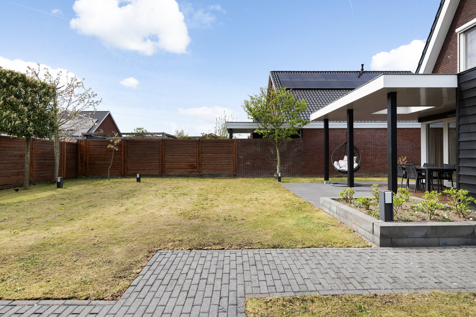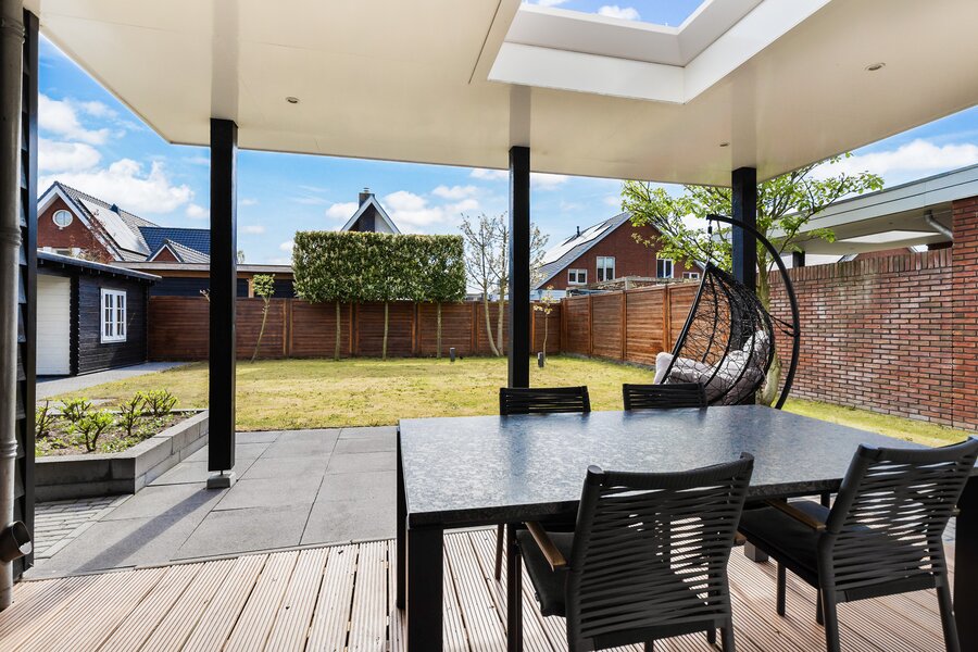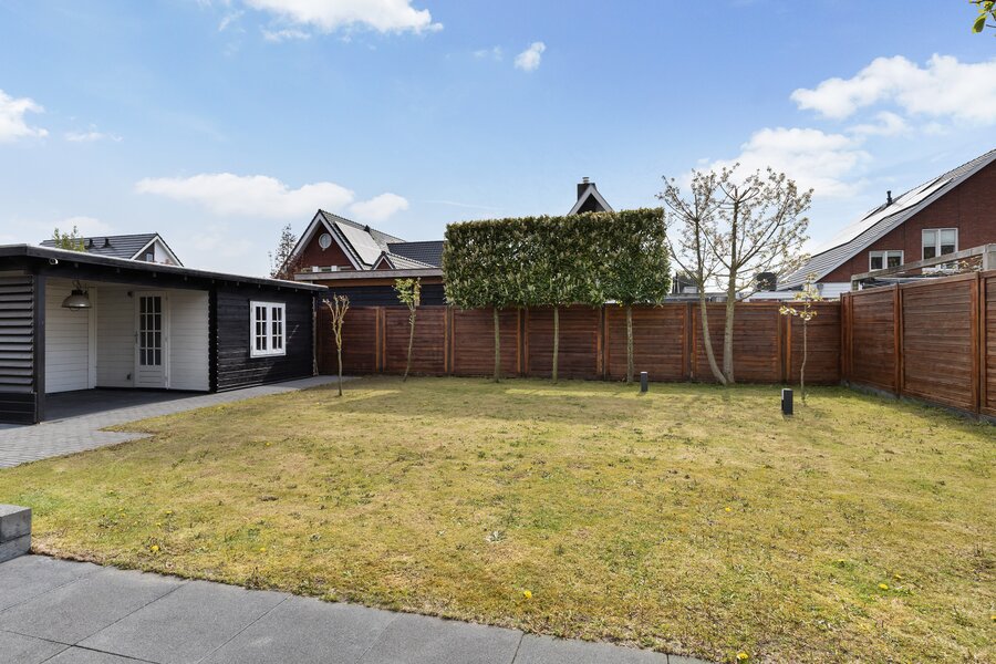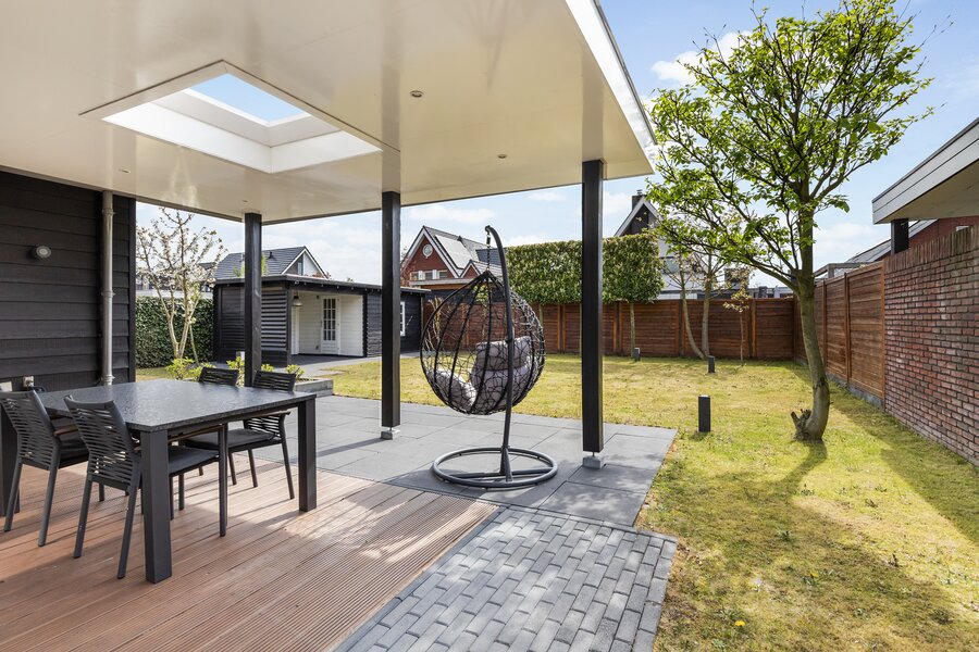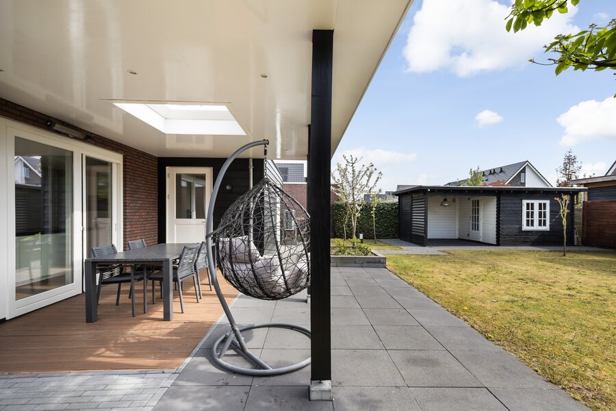 De kers op de taart is de prachtig aangelegde tuin rondom de woning. De achtertuin is perfect georiënteerd op het zonnige zuiden, waardoor u hier de hele dag van de zon geniet. Onder de sfeervolle veranda kunt u tot in de late uurtjes buiten zitten. Naast de geïsoleerde garage is er ook nog een vrijstaande houten berging voor extra opslagruimte.