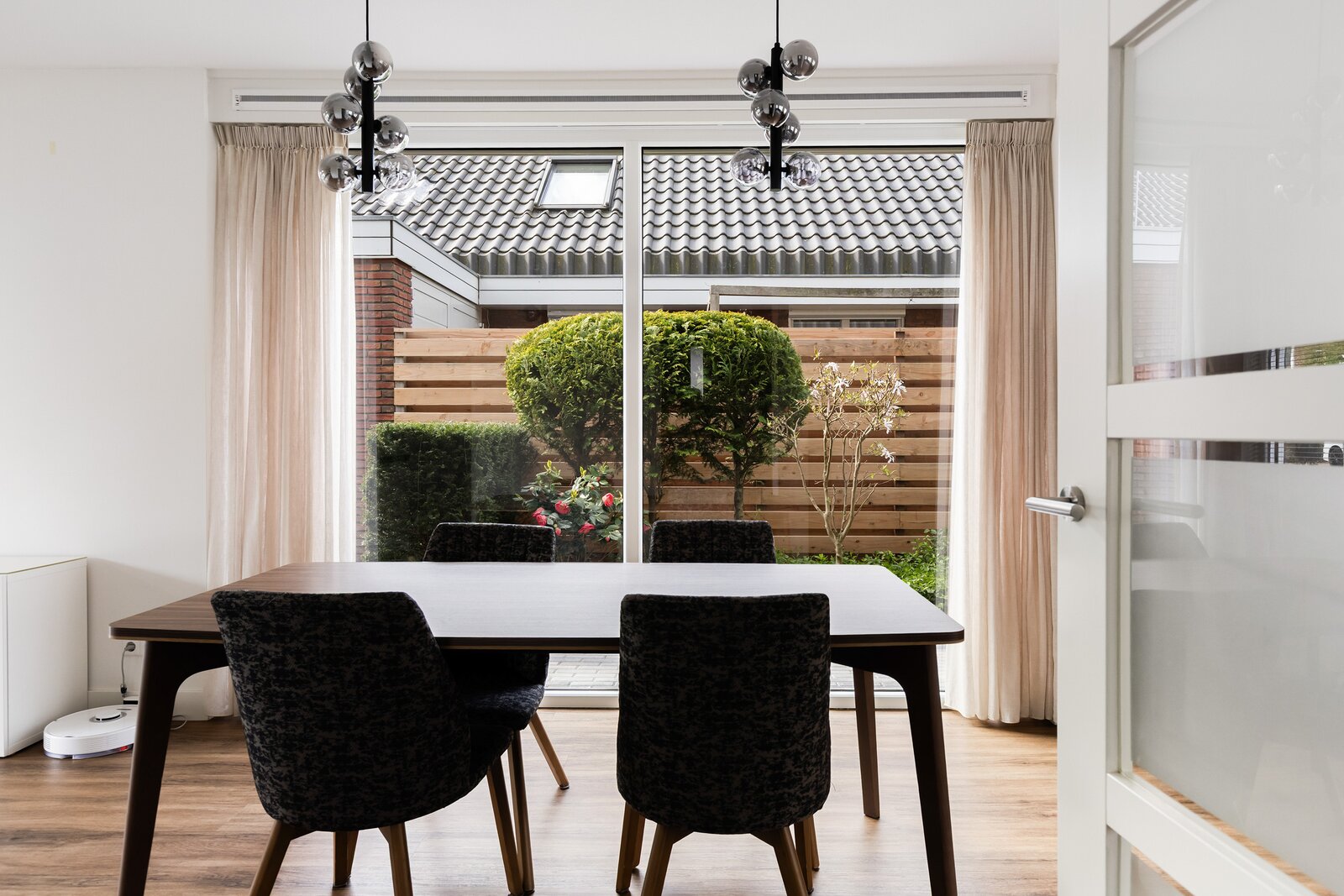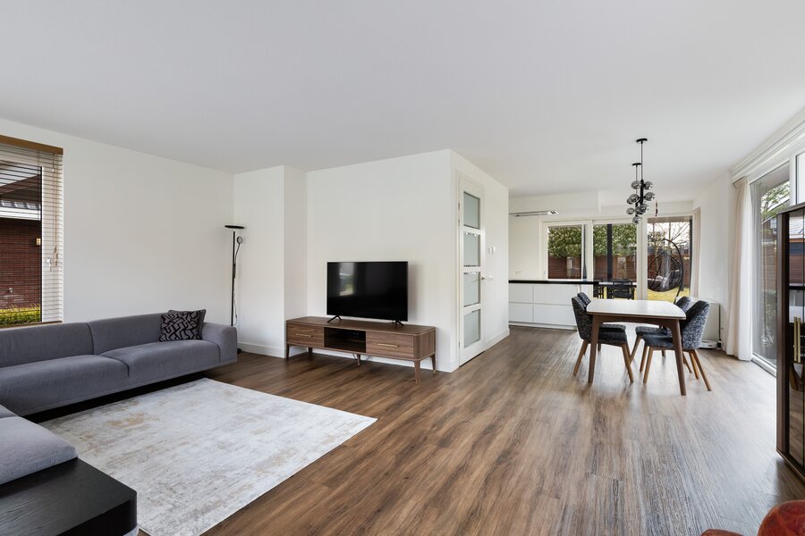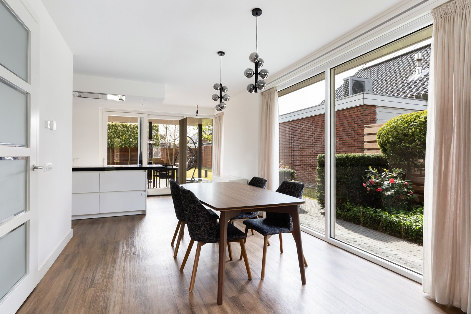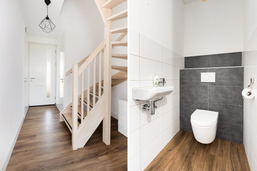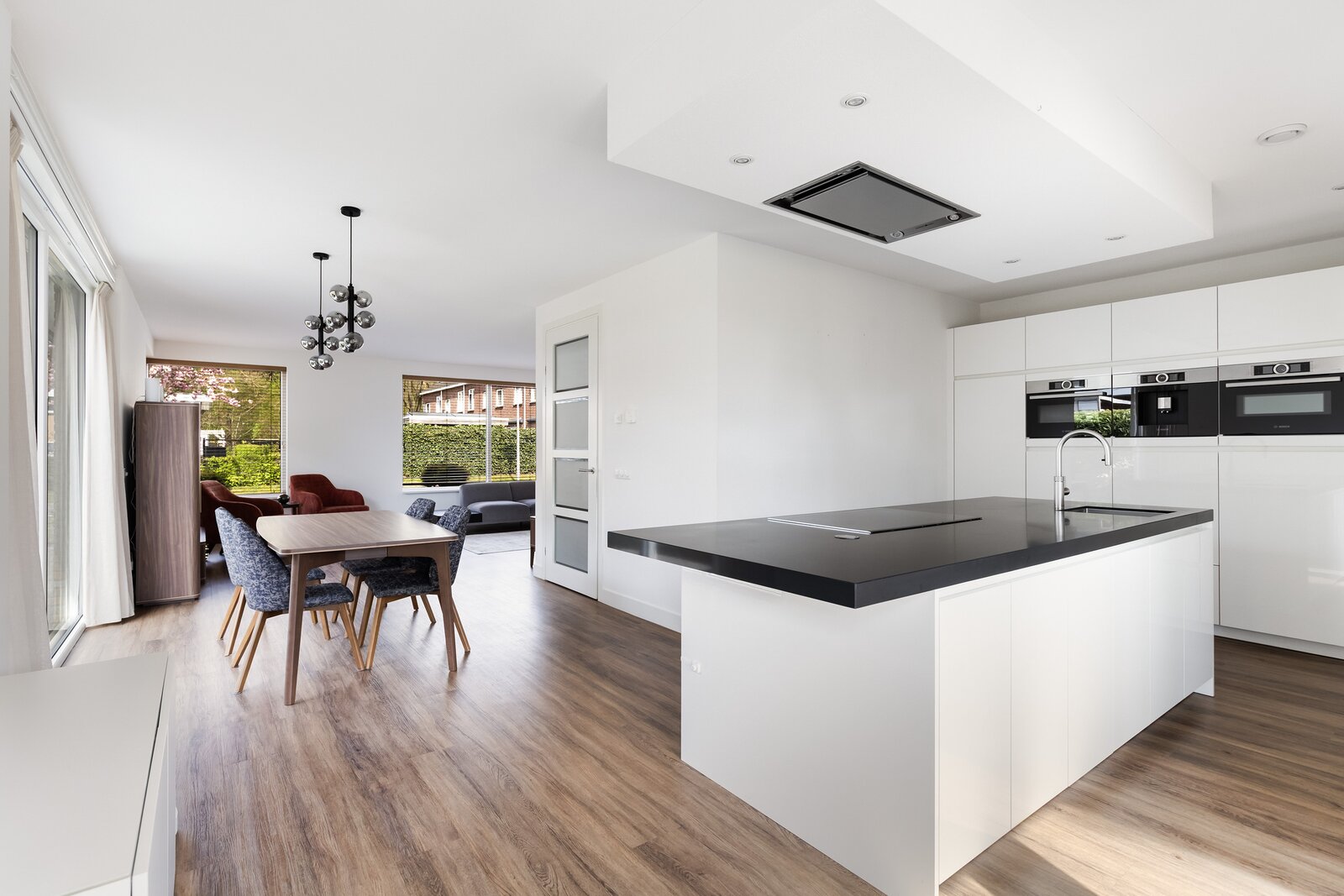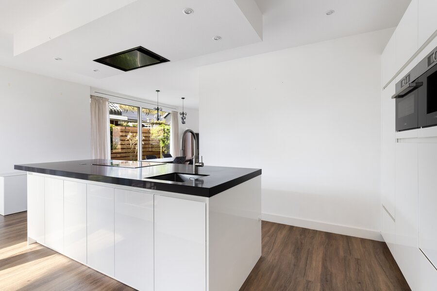 U betreedt de woning in de ruime hal met een moderne toiletruimte. De gehele begane grond is voorzien van comfortabele vloerverwarming. De woonkamer is licht en ruimtelijk en staat in open verbinding met het hart van het huis: de luxe leefkeuken. Deze moderne keuken (2017) is uitgerust met hoogwaardige inbouwapparatuur en een groot kookeiland, de perfecte plek voor gezellige avonden met vrienden en familie. Via de grote schuifpui loopt u zo de zonnige achtertuin in. De praktische bijkeuken biedt ruimte voor uw wasmachine en droger. Vanuit hier is er ook toegang tot de volledig geïsoleerde garage.