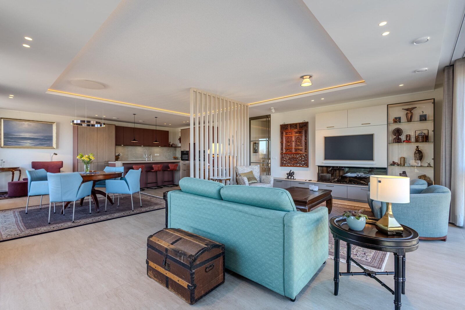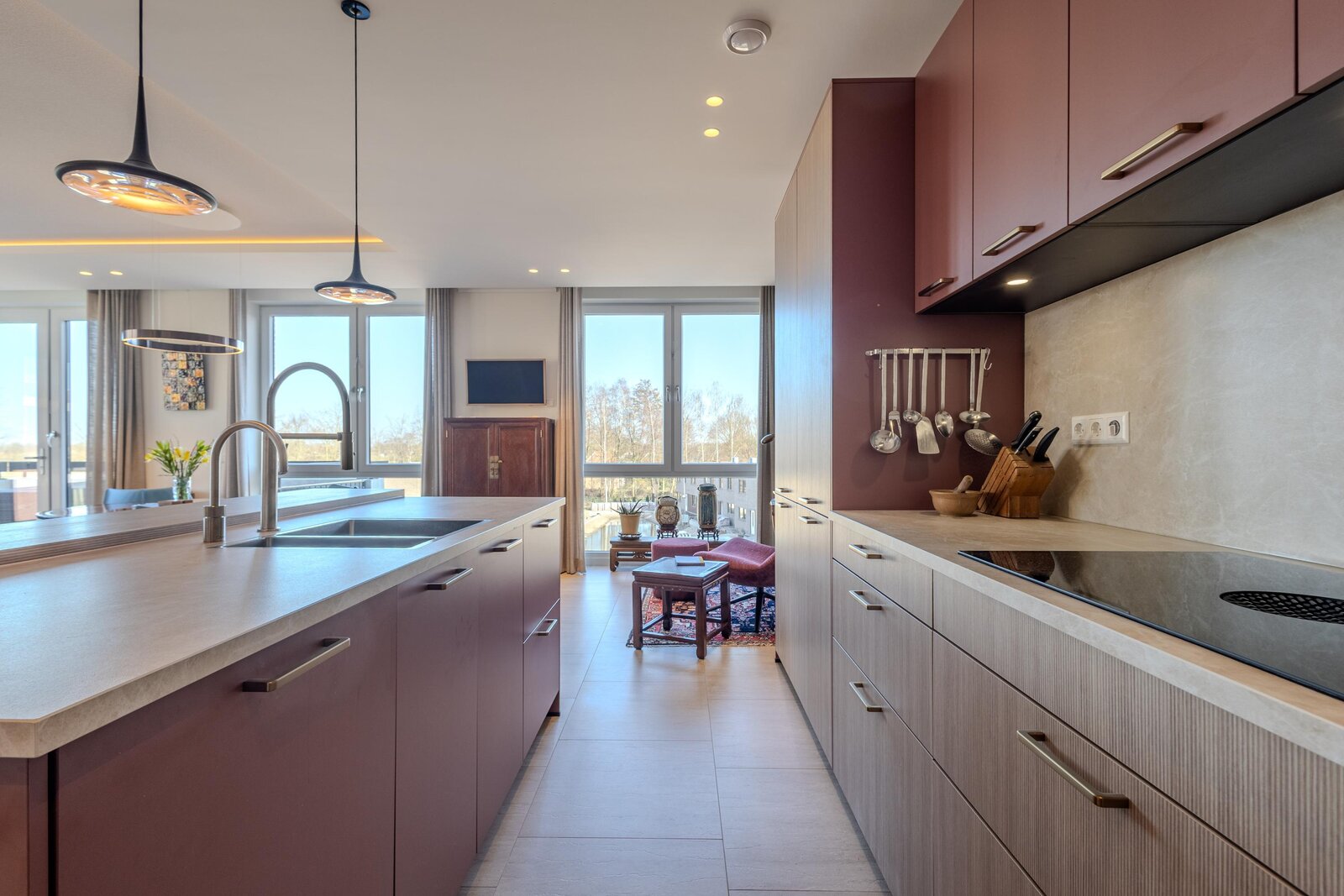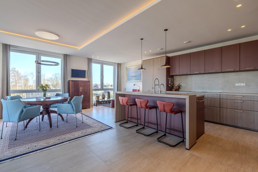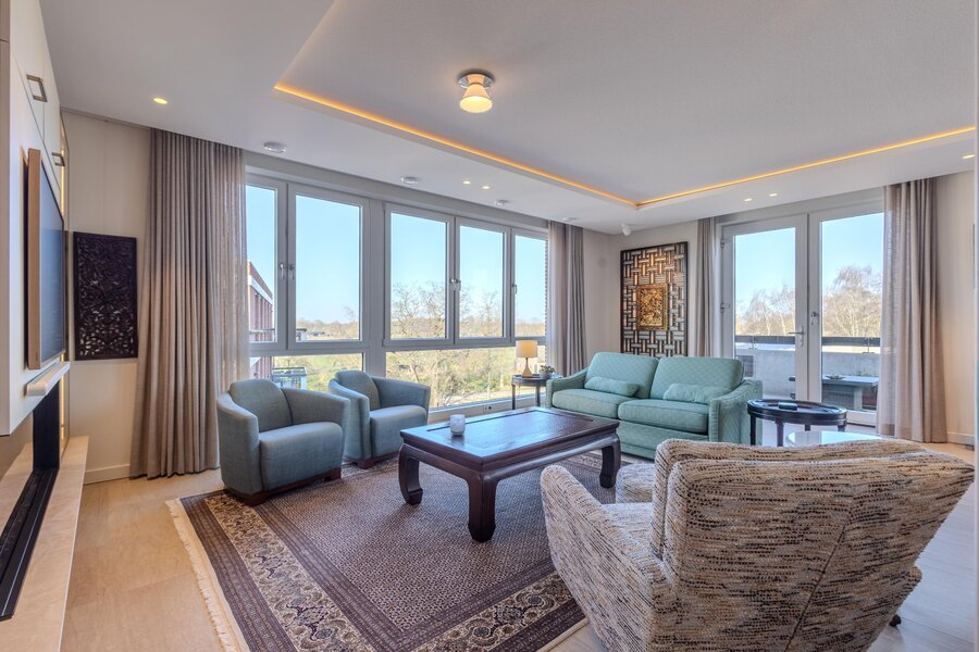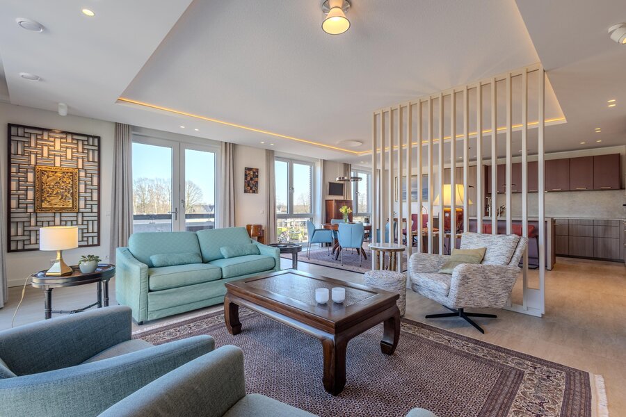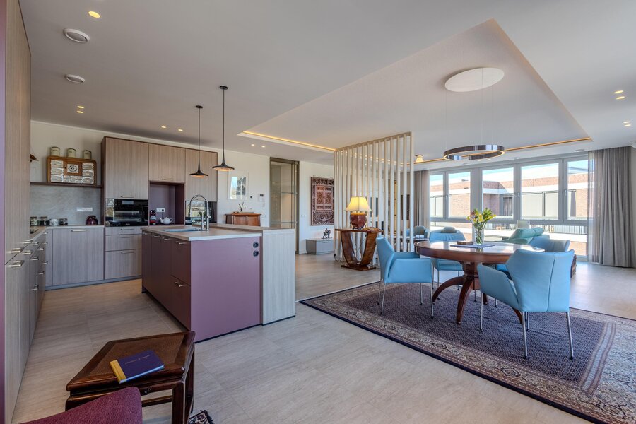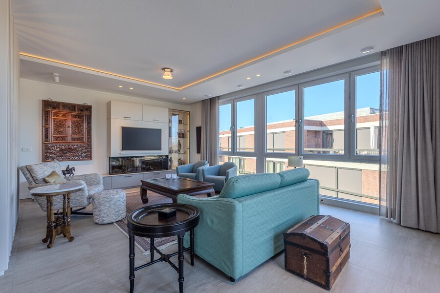 Aan het einde van de hal is via een bronzen stalen taatsdeur toegang tot de living met open keuken. De vele ramen rondom geven niet alleen een mooi uitzicht naar buiten, maar laten ook veel natuurlijk daglicht het appartement binnen. De living is slim ingedeeld met een roomdivider die op elegante wijze de zithoek en eethoek van elkaar scheidt. In de zithoek zorgt een stijlvolle openhaard voor extra sfeer en comfort. Het lichtplan is zorgvuldig uitgewerkt en geeft de ruimte extra cachet.