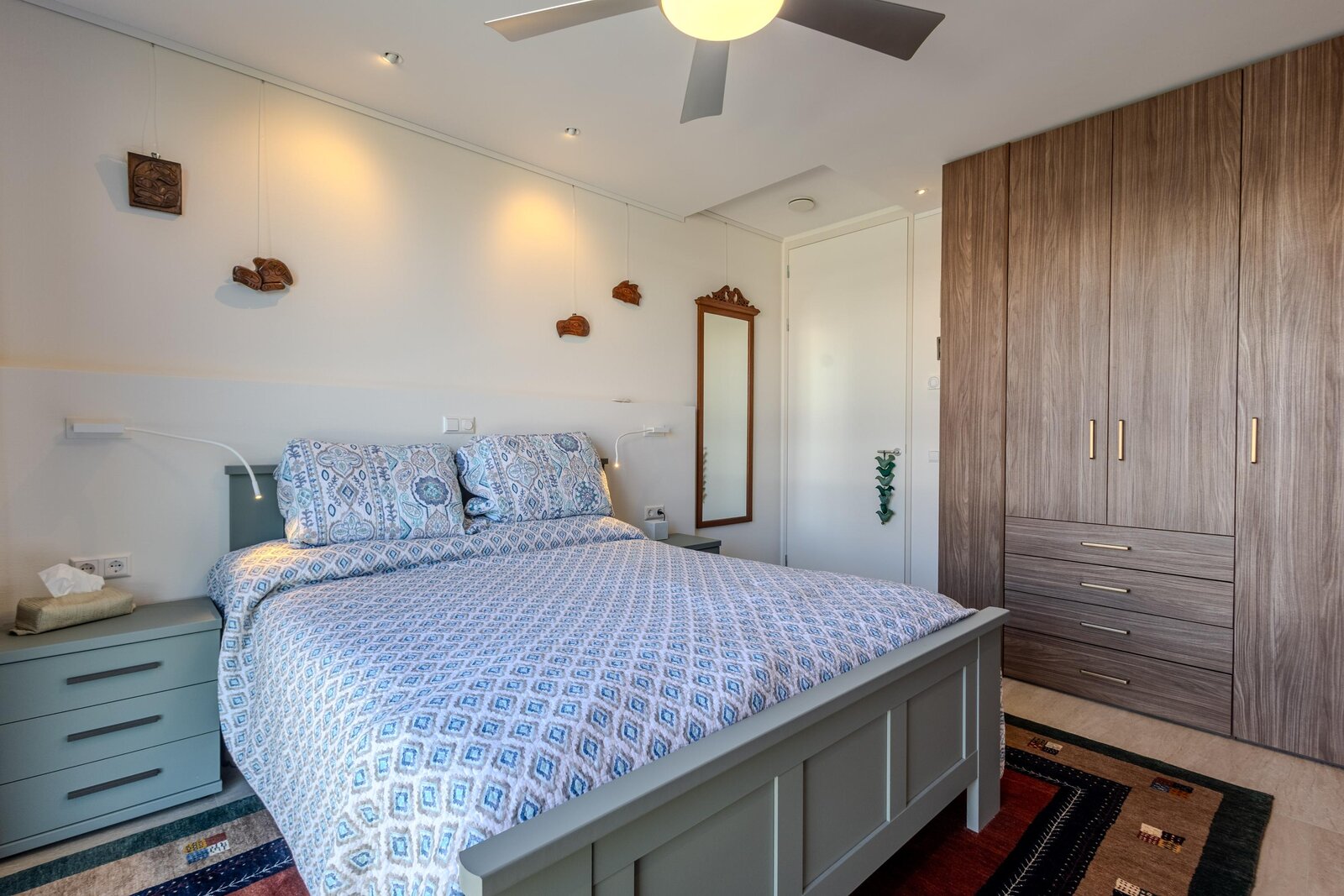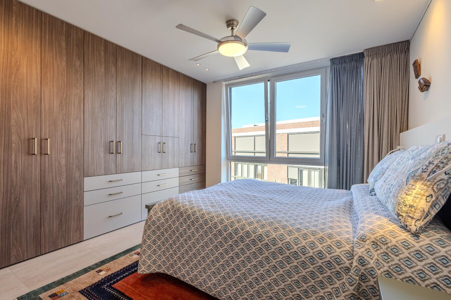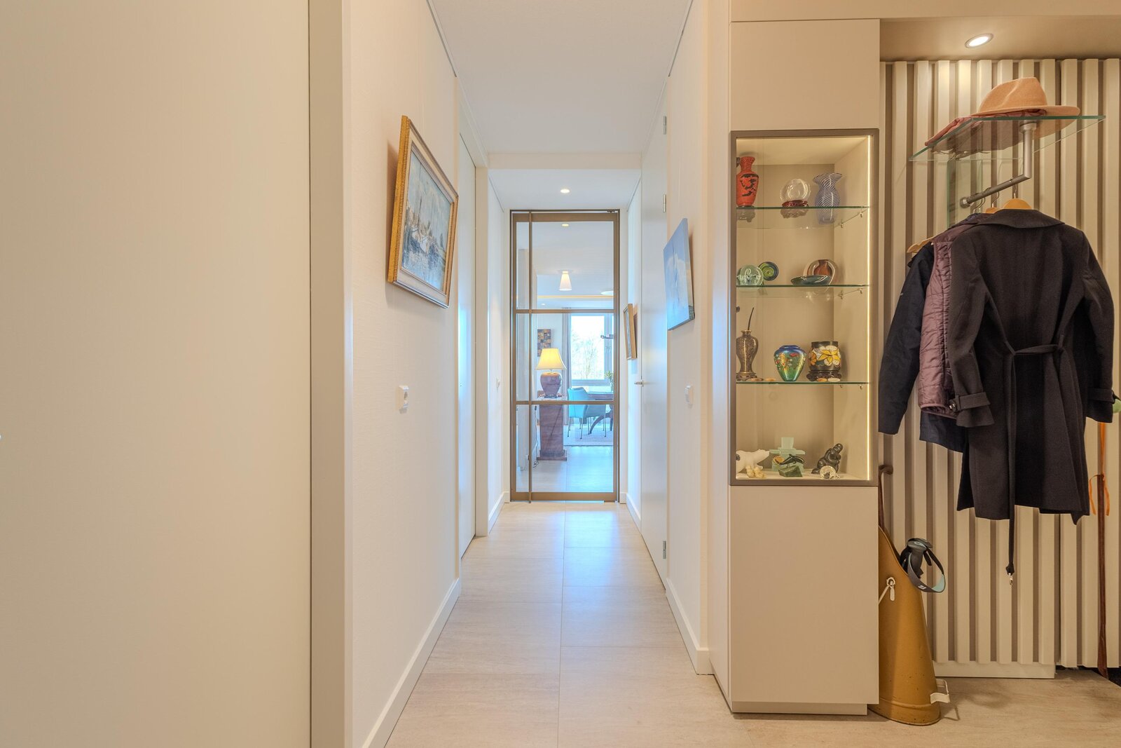 In de hal wordt direct het hoge afwerkingsniveau zichtbaar. Mooie wandpanelen en maatwerk kasten geven het geheel een strakke en hoogwaardige uitstraling. Op de vloer liggen plavuizen die doorlopen in het gehele appartement en voor een rustige basis zorgen. De wanden zijn afgewerkt met glasvliesbehang met structuur. Daarnaast is er een praktisch schilderij ophangsysteem aanwezig, waarmee kunst en wanddecoratie eenvoudig en stijlvol kunnen worden gepresenteerd.