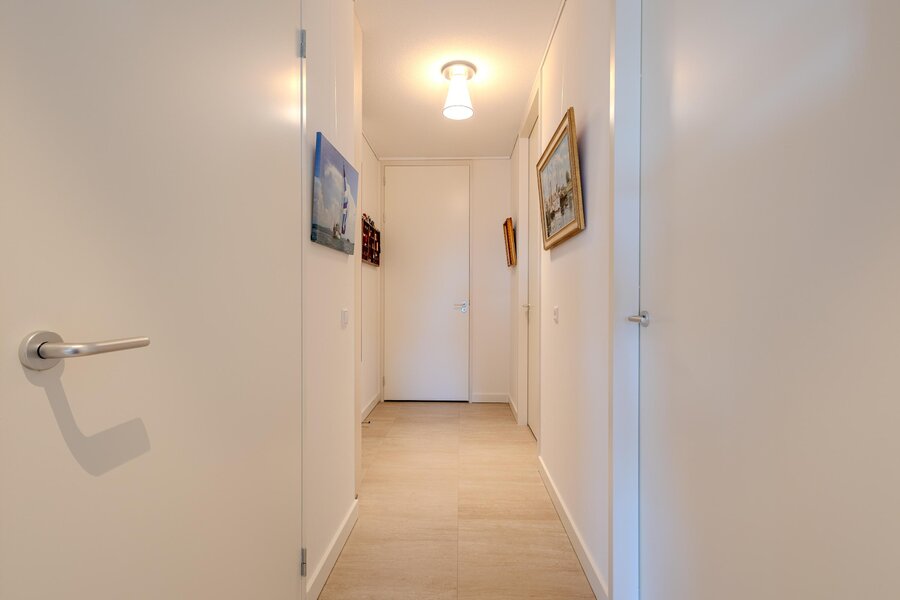 Dankzij de kleinschalige opzet van het complex deelt u de portiek op deze verdieping met slechts drie andere appartementen. De voordeur van het appartement komt uit in de hal vanuit waar de diverse ruimtes bereikbaar zijn.