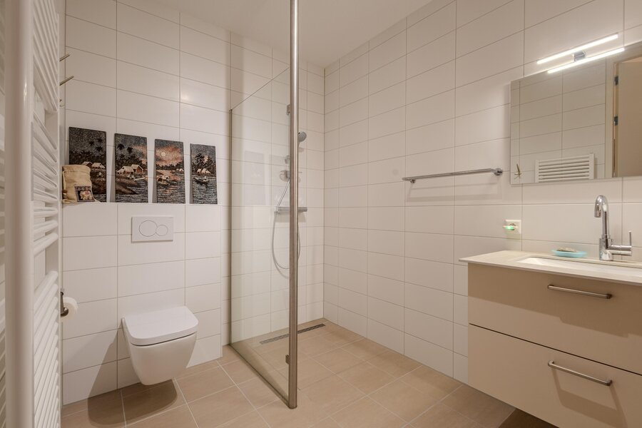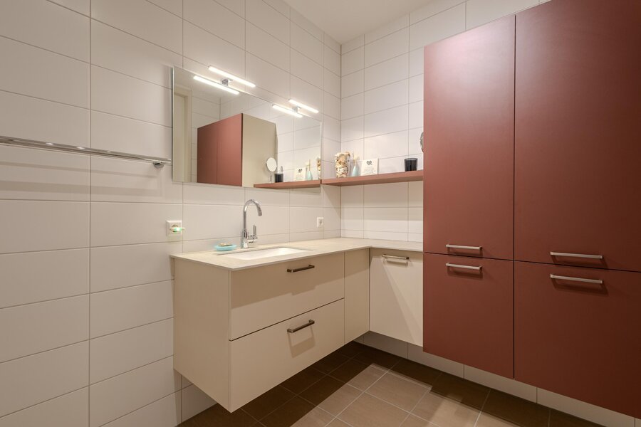 Direct naast de hoofdslaapkamer is de badkamer gelegen. Deze badkamer is volledig betegeld in moderne, neutrale tinten en is uitgerust met een royale inloopdouche, een wastafel met meubel en een toilet. Op de hal is een separaat gastentoilet met meubel en fonteintje aanwezig.