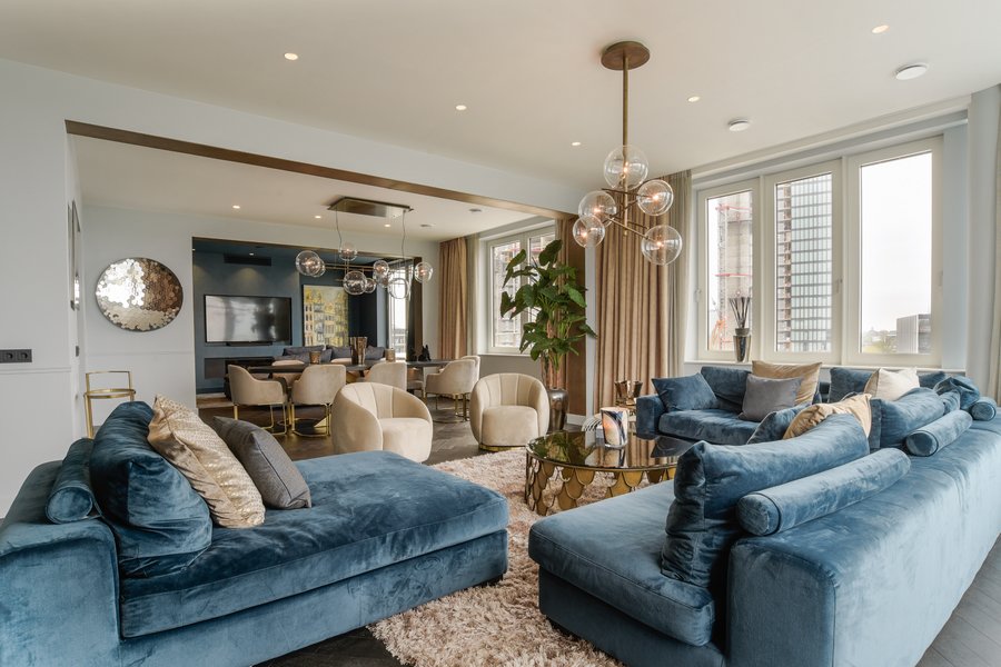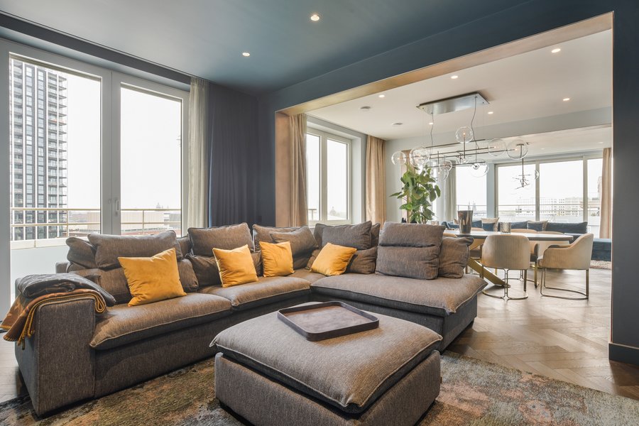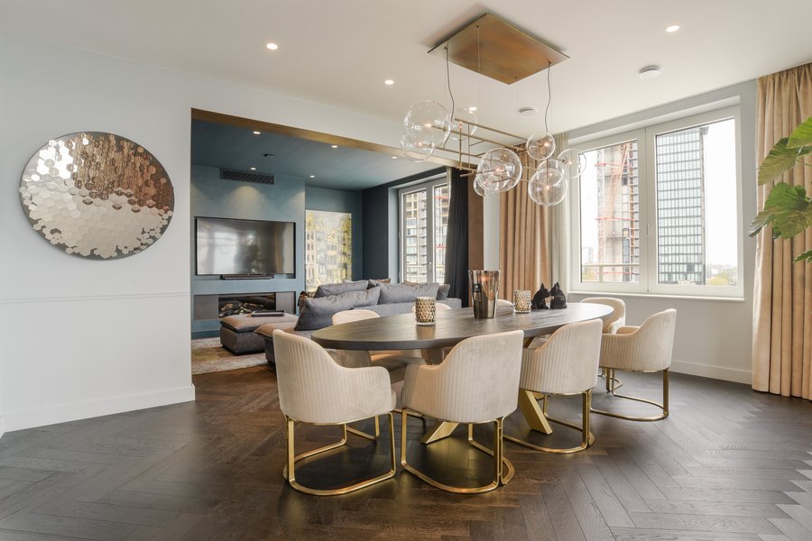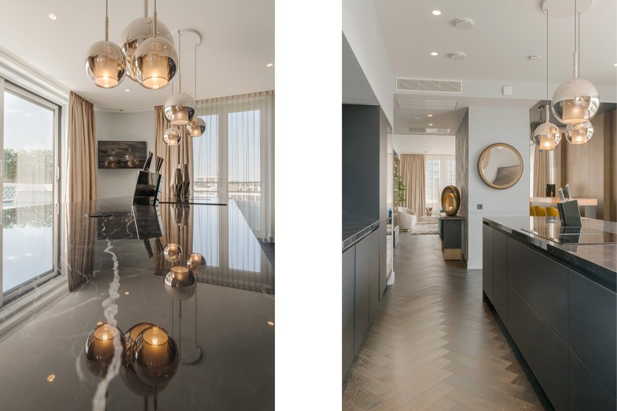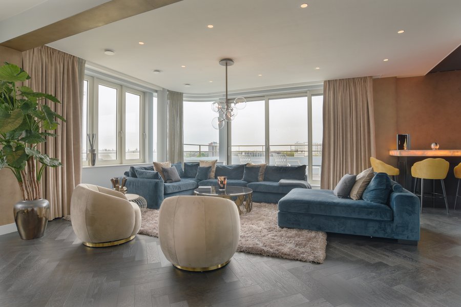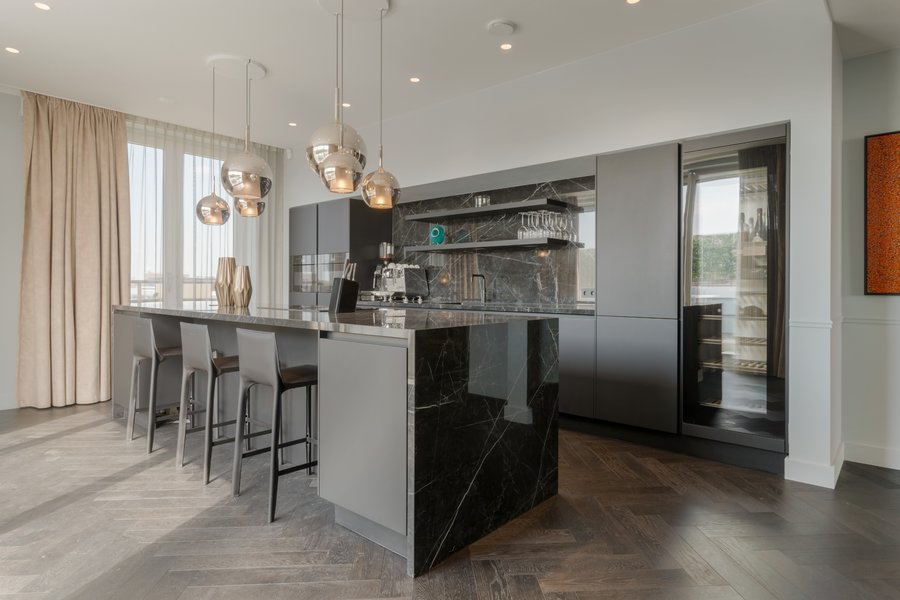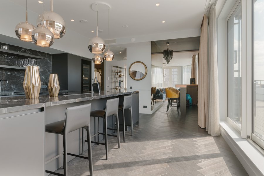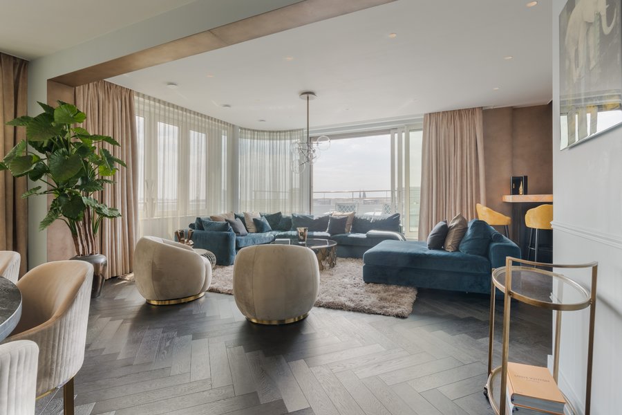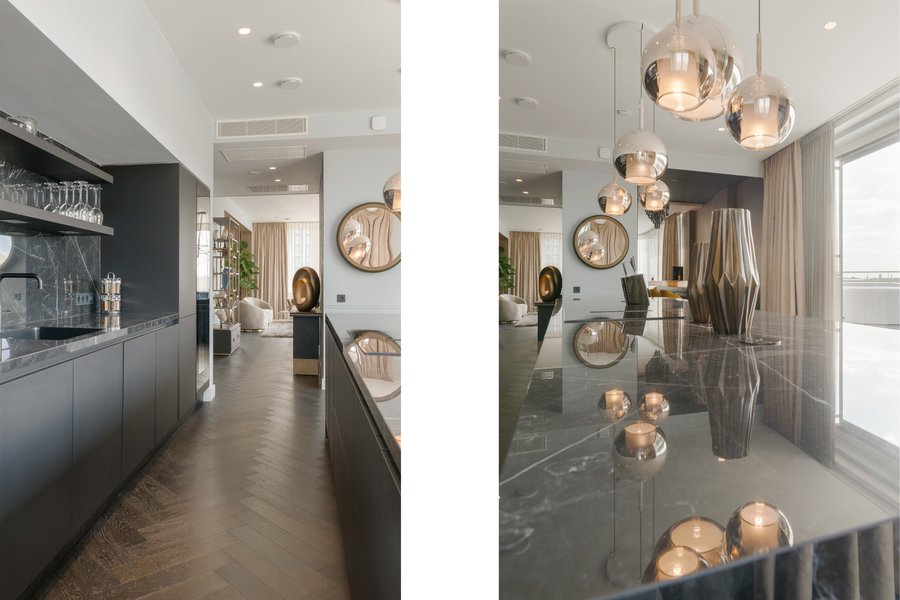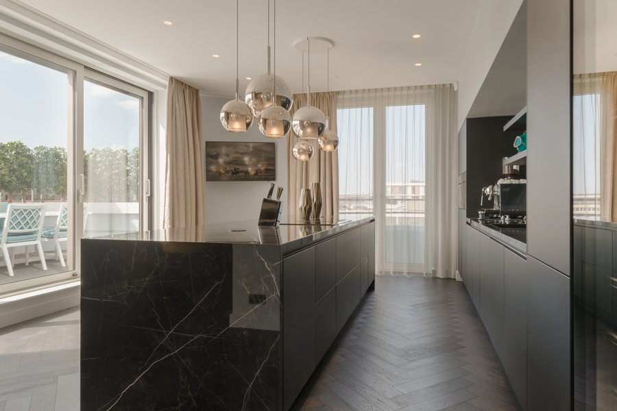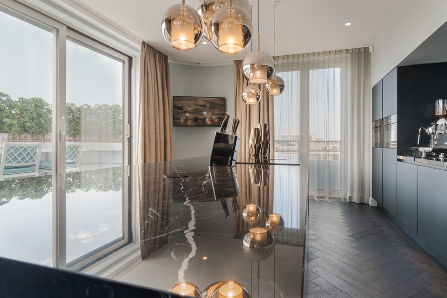 Bij binnenkomst word je al gelijk overdonderd door de styling en uitzicht van dit penthouse. Door de glazen entree met brons stalen deuren heb je een heel open gevoel. De keuken is volledig design, met een zwart marmerblad, de stopcontacten weggewerkt en geen deurhandels is het geheel heel strak en van alle gemakken voorzien zoals een oven, wijnkoelsysteem en vaatwasser. Aan het eiland kun je fijn zitten en genieten van het koken en het uitzicht tegelijkertijd.