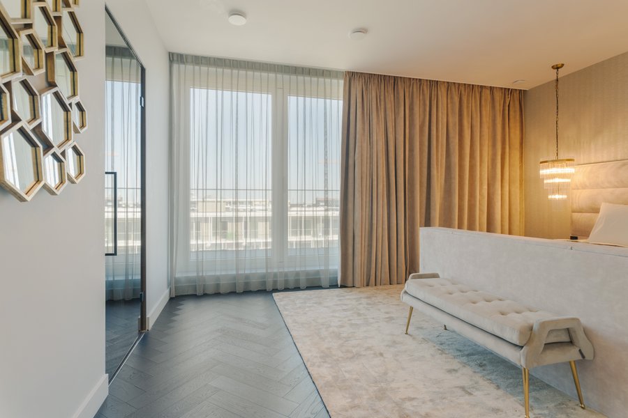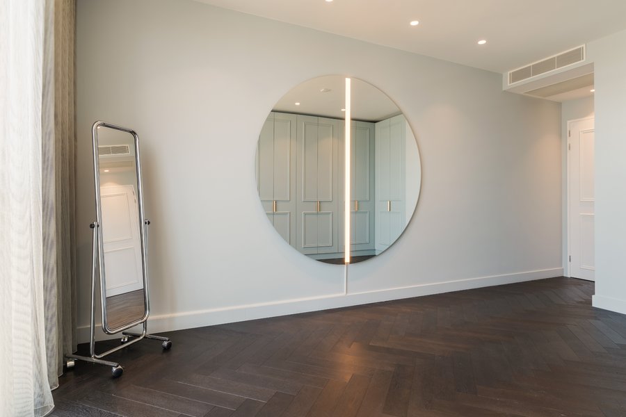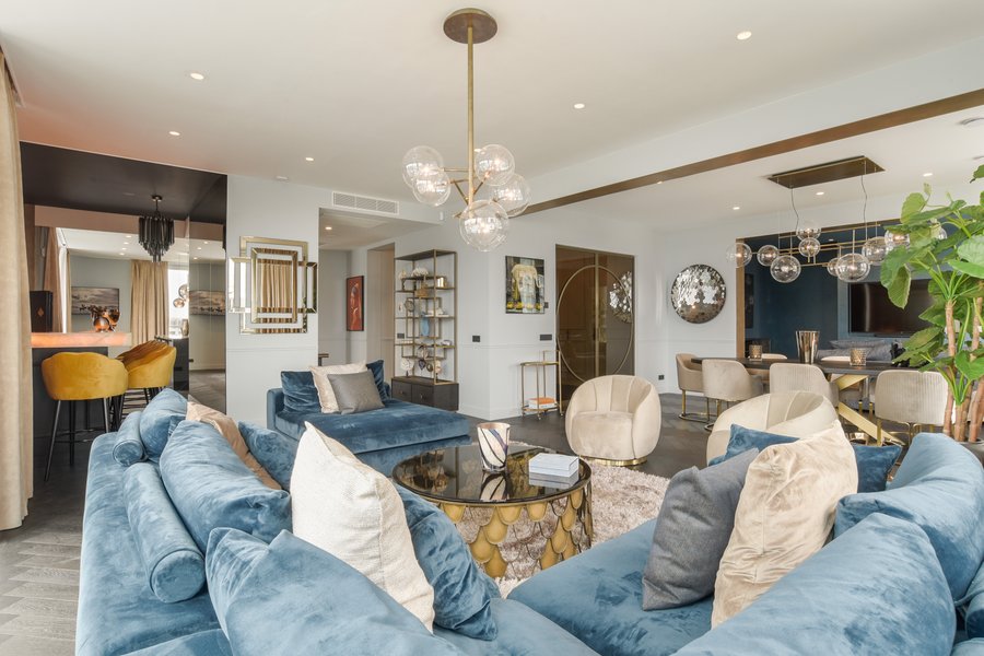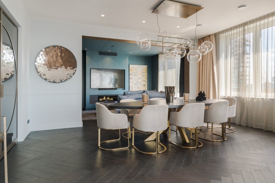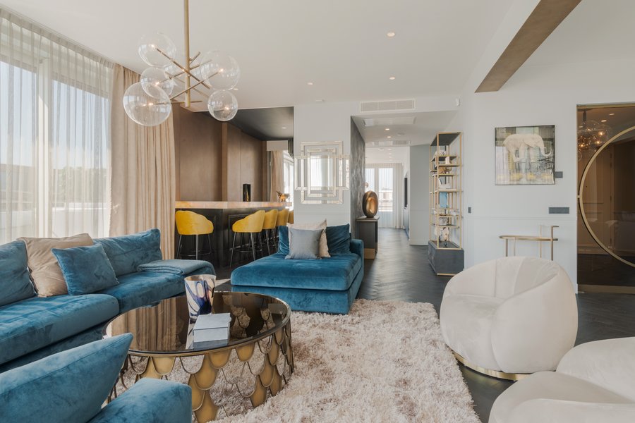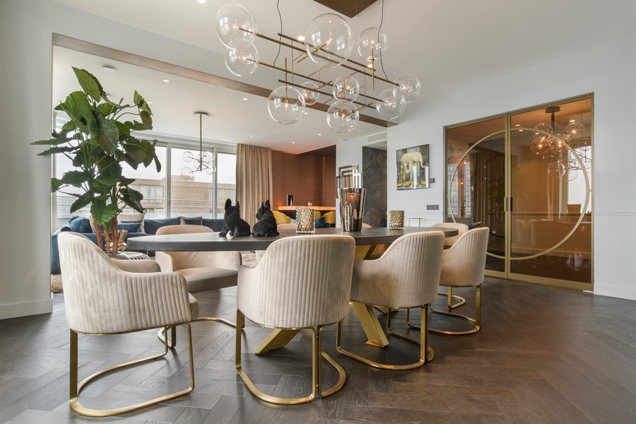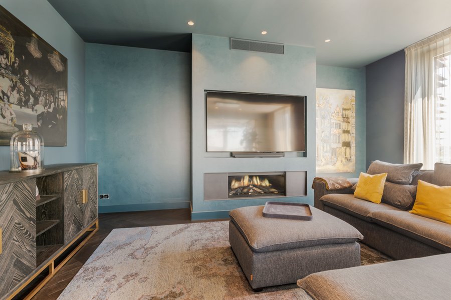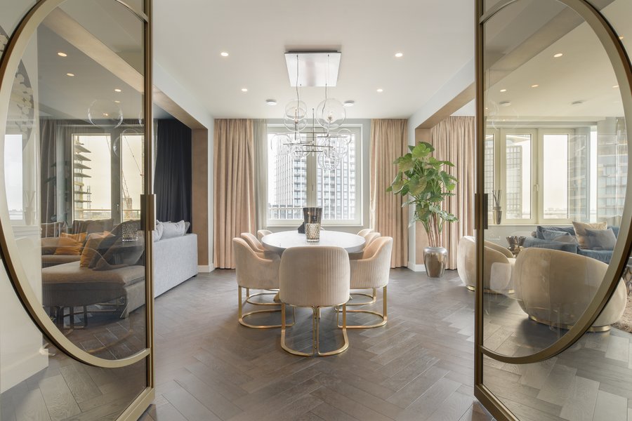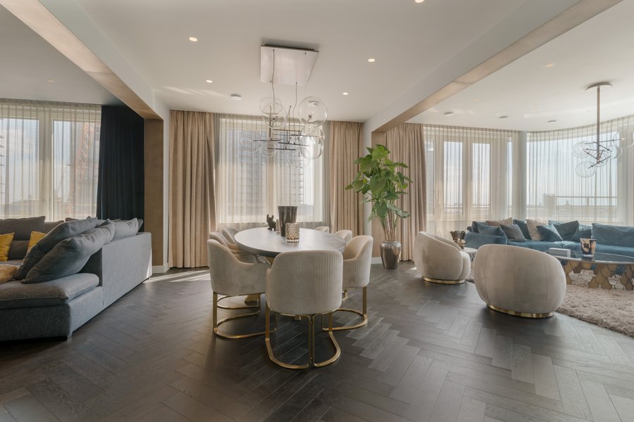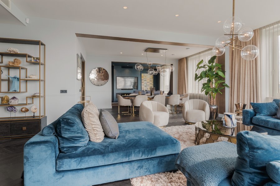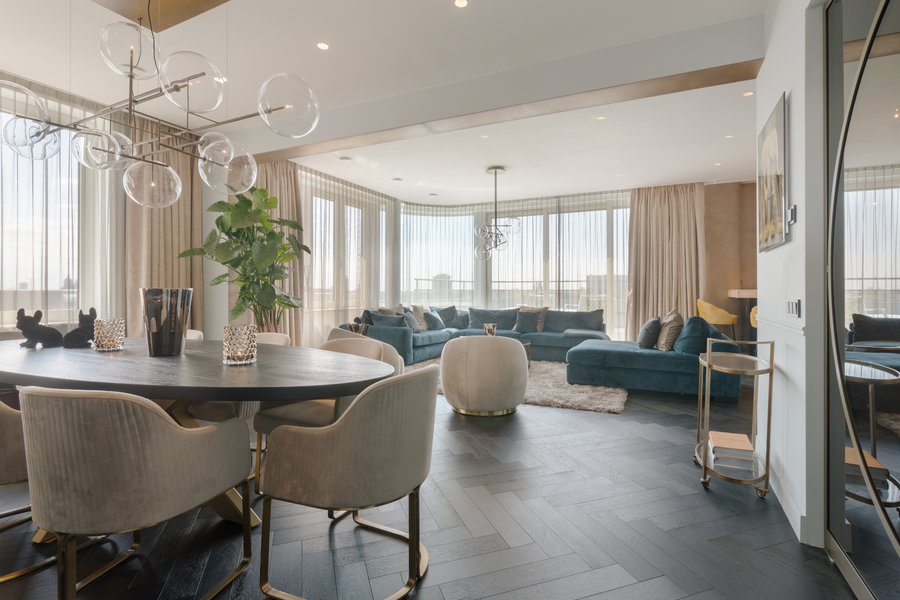 Bij binnenkomst word je al gelijk overdonderd door de styling en uitzicht van dit penthouse. Door de glazen entree met brons stalen deuren heb je een heel open gevoel. De keuken is volledig design, met een zwart marmerblad, de stopcontacten weggewerkt en geen deurhandels is het geheel heel strak en van alle gemakken voorzien zoals een oven, wijnkoelsysteem en vaatwasser. Aan het eiland kun je fijn zitten en genieten van het koken en het uitzicht tegelijkertijd.