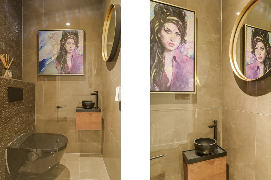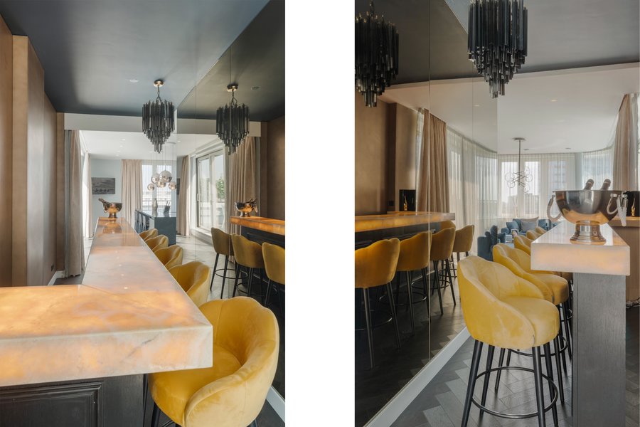 De eye catcher en speciaal ontworpen, is de bar in de woonkamer. De combinatie van het onyxblad, dat goud licht geeft met de zwarte onderkant, geeft een strak maar toch ook warme uitstraling.