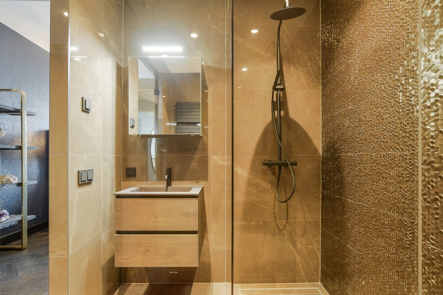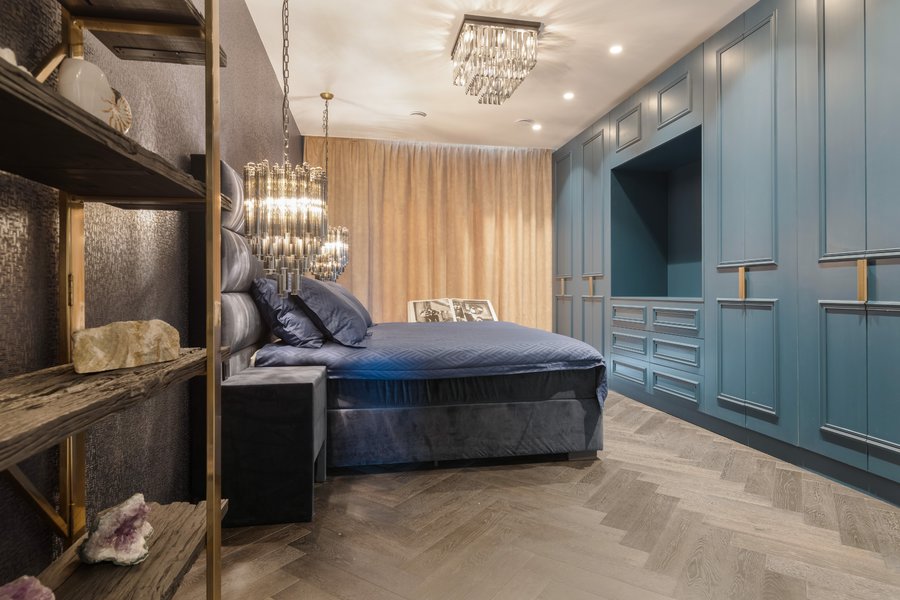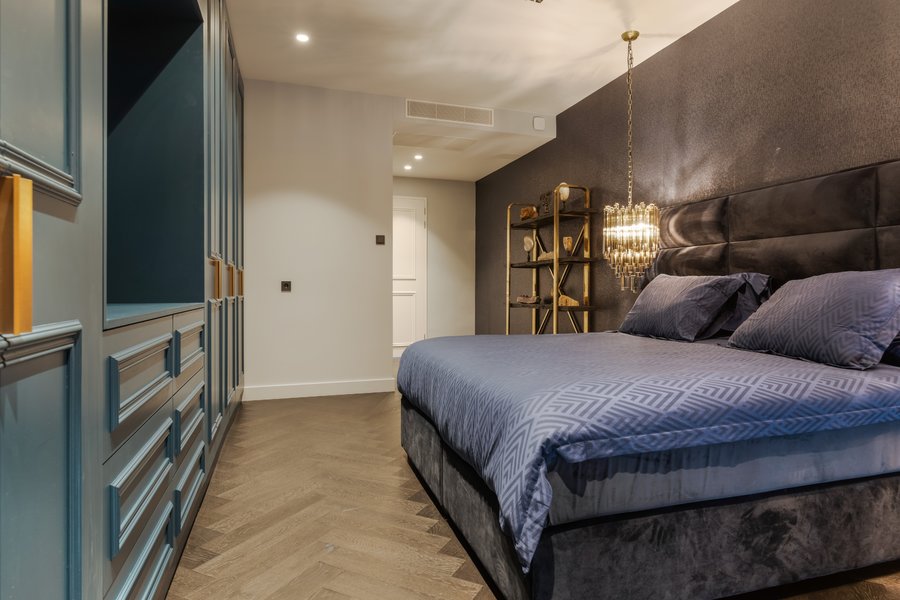 Vanuit de ruime hal kom je bij de slaapkamers, waarvan een gemaakt is als walk in closet met kleedeiland en uitklapbaar bed voor de extra loge. De andere twee kamers zijn voorzien van een eigen badkamer. Beide badkamers hebben een regendouche en een strak design en door de zorgvuldig uitgekozen materialen heeft het een luxe uitstraling. Het gehele huis is voorzien van een spectaculaire visgraat zwarte parketvloer.