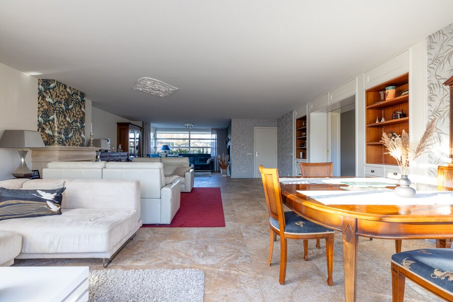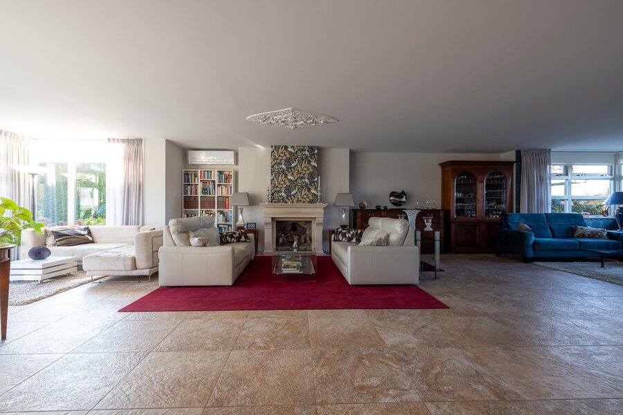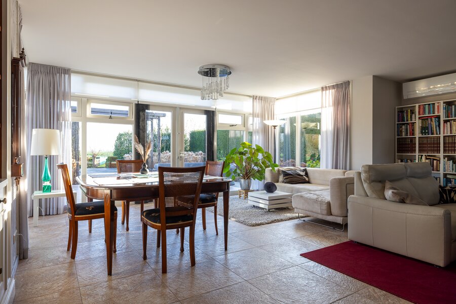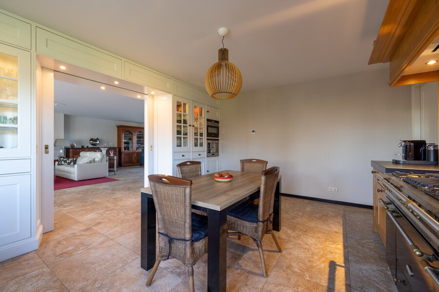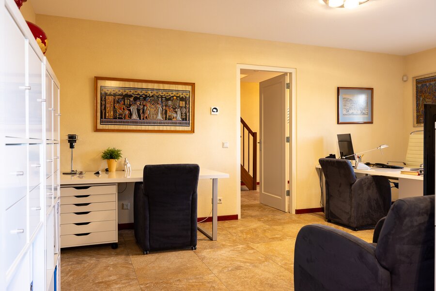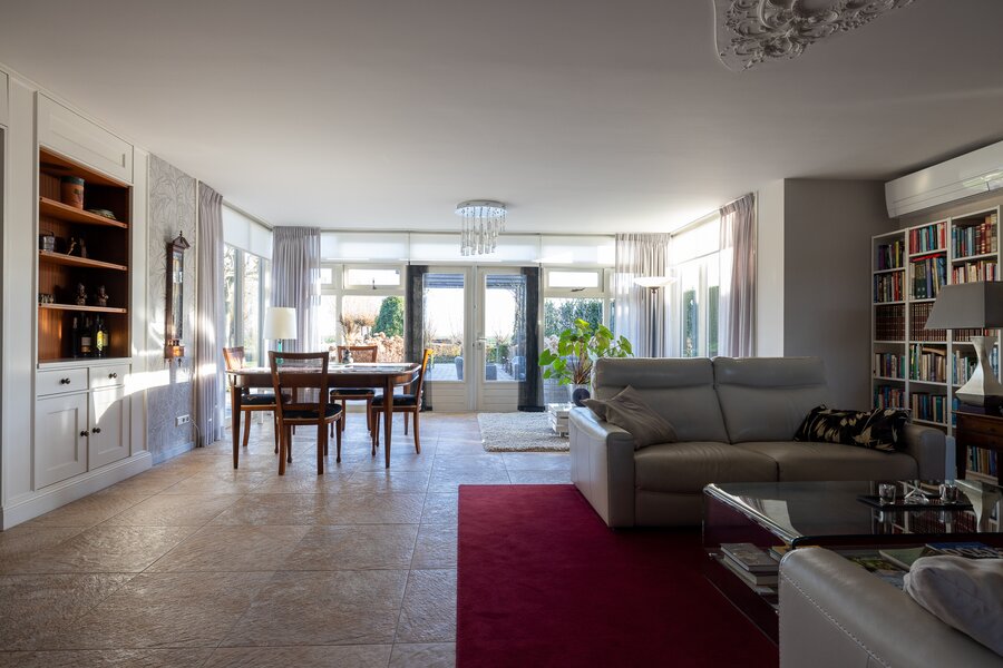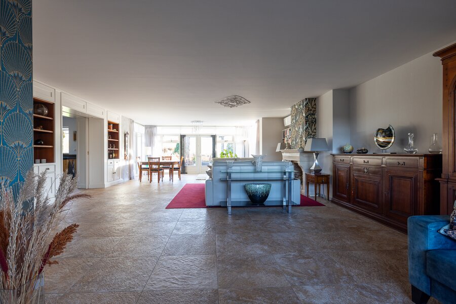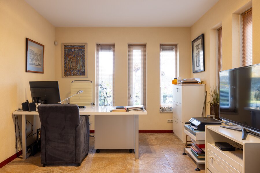 Ruime werkkamer met een eigen toegang aan de voorzijde en een doorloop naar de bijkeuken. Royale woon-/eetkamer voorzien van een openhaard (gas), plavuizenvloer met vloerverwarming, airconditioning (2023), openslaande deuren naar de tuin, schuifdeuren met glas-in-lood omringd door kasten met een doorgang naar de keuken.