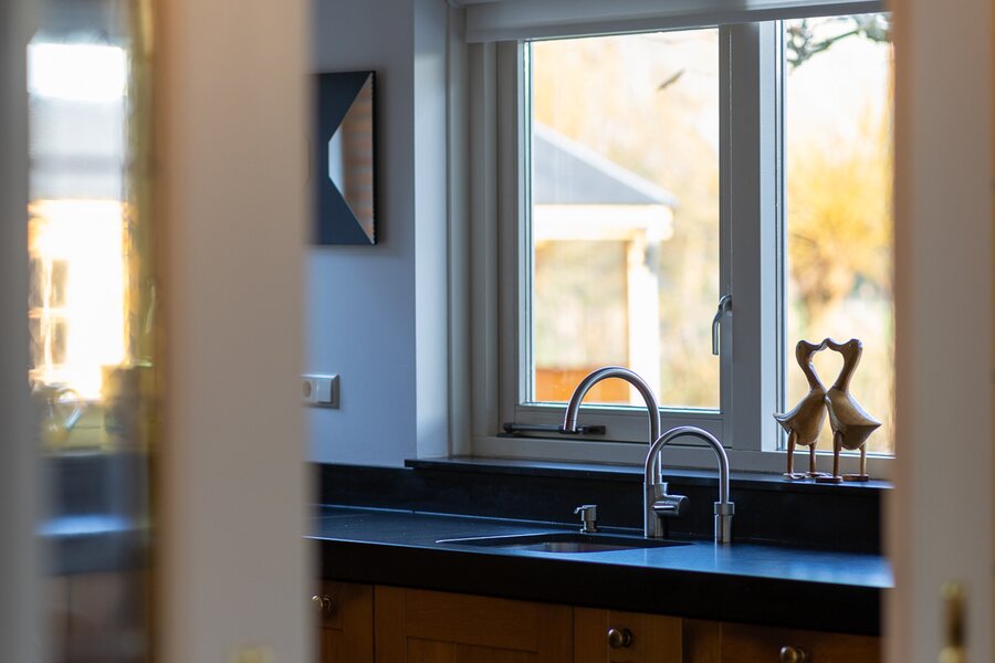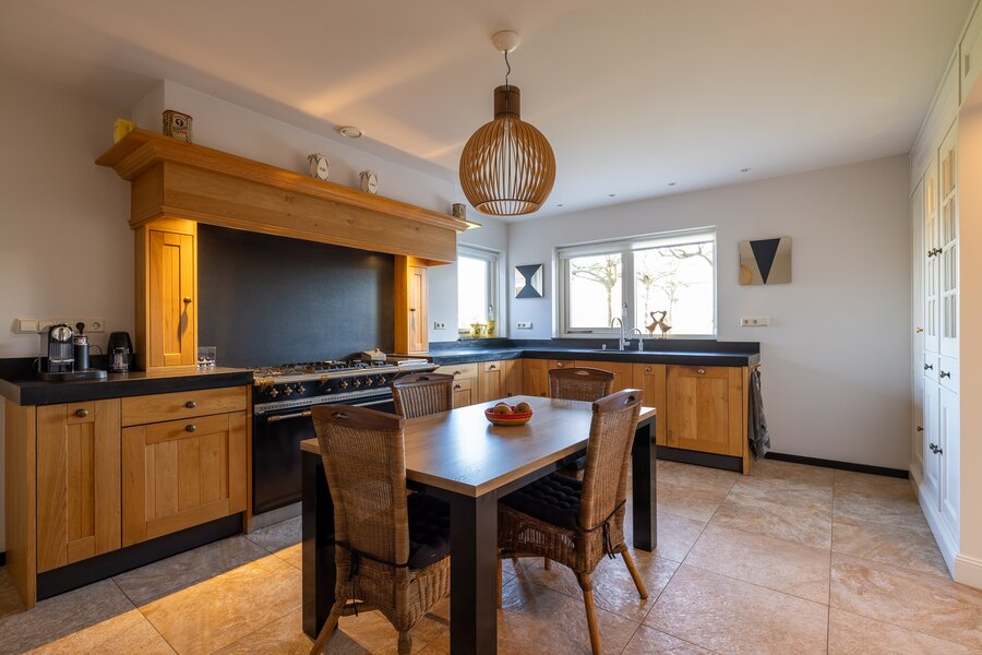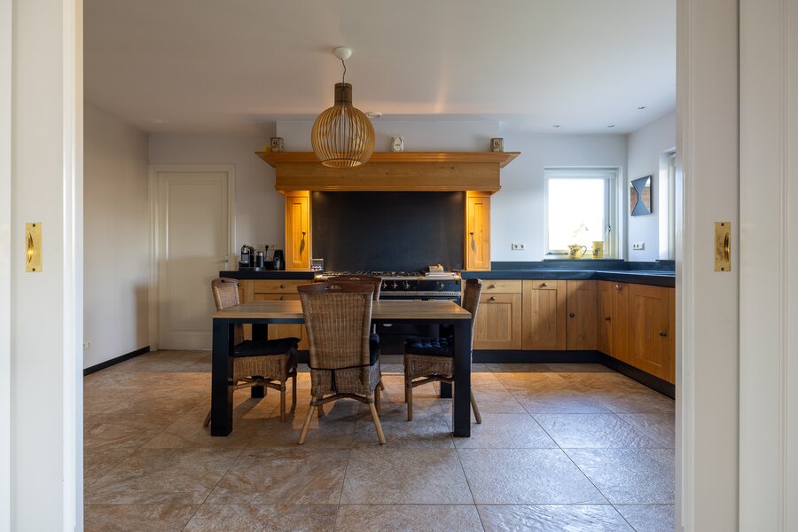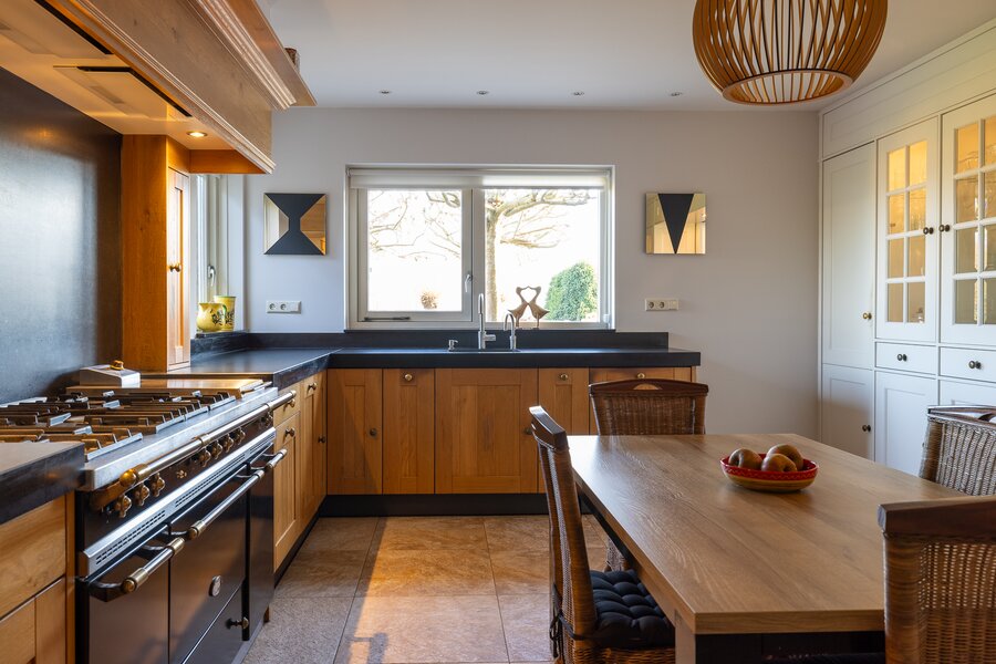 Royale woonkeuken in L-opstelling met o.a. een granieten aanrechtblad, fornuis (Lacanche), diverse inbouwapparatuur, vaste kastenwanden en een doorloop naar de bijkeuken. Vanuit de bijkeuken is er toegang tot de garage en de tuin.