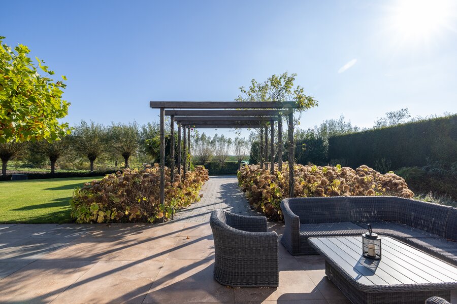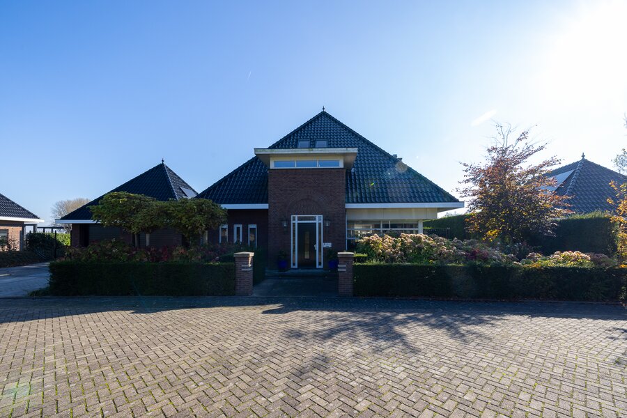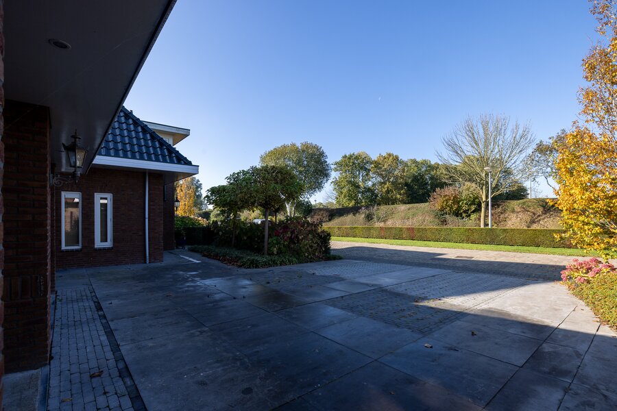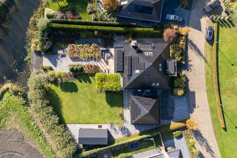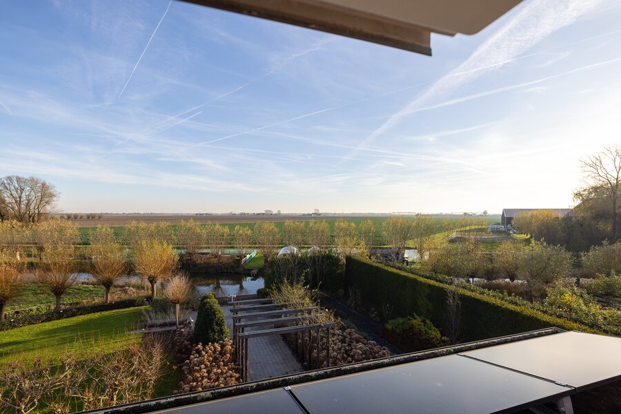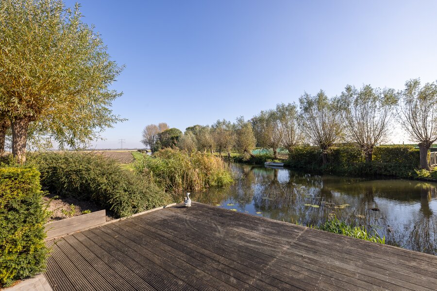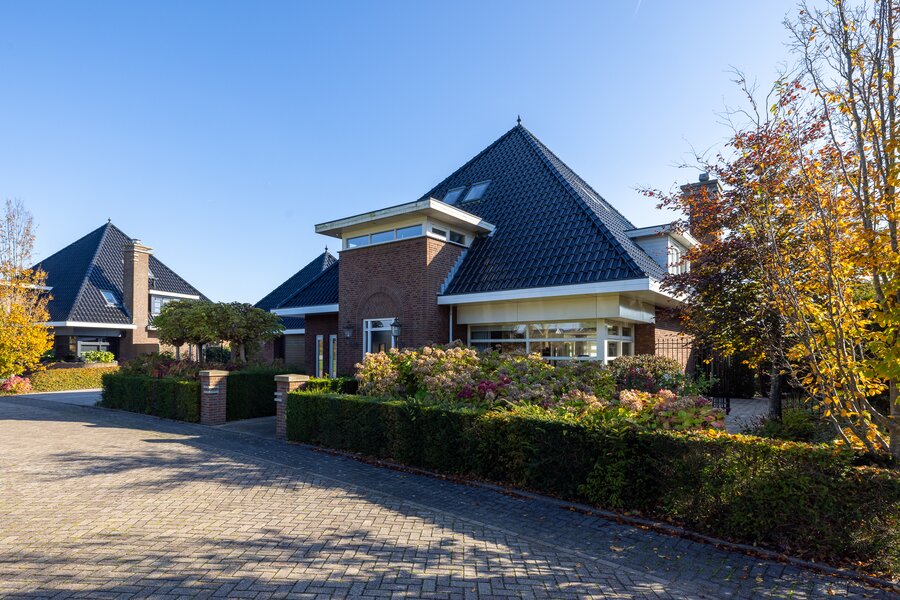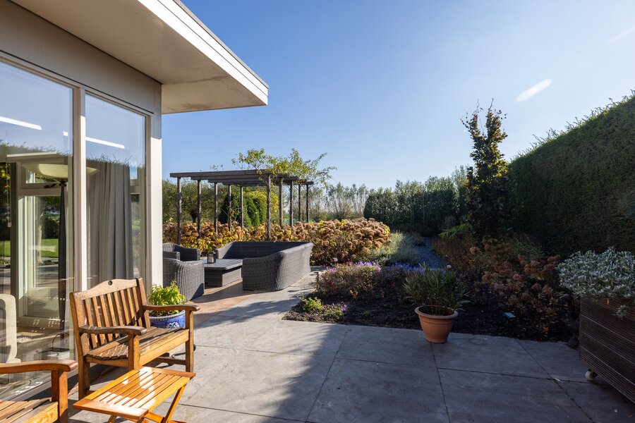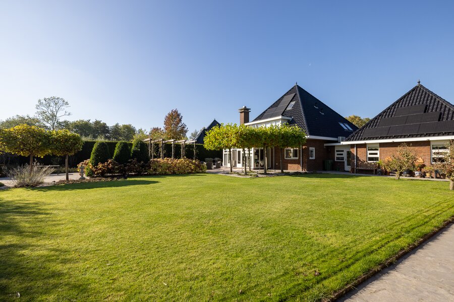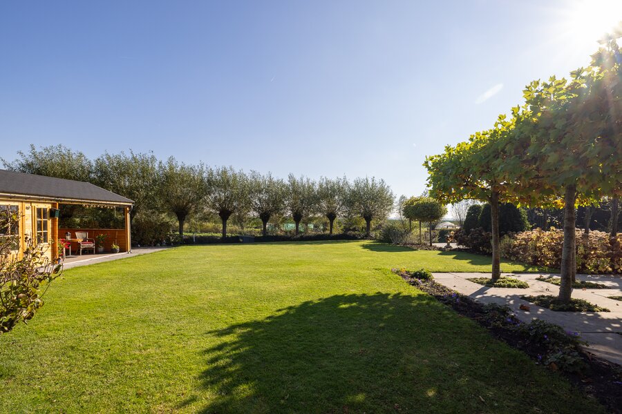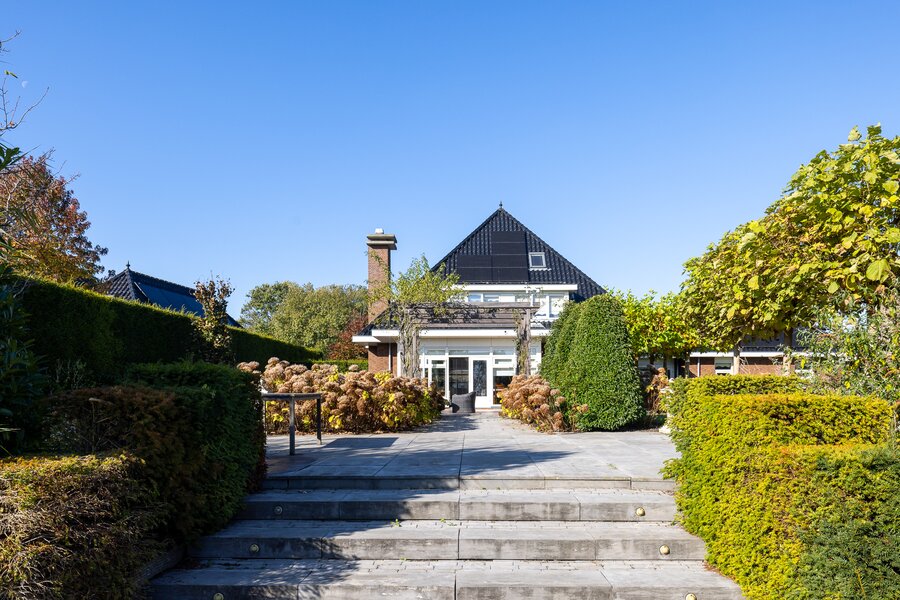 This beautifully situated, detached, spacious 5-room villa with a double garage is set on a 1,695 m² plot with stunning, unobstructed views of the surrounding countryside and bordering a creek. The meticulously landscaped garden surrounds the property and features several terraces, one of which is located by the water. The detached, generously sized storage building with a veranda also offers a delightful spot to enjoy outdoor living.