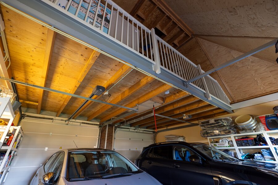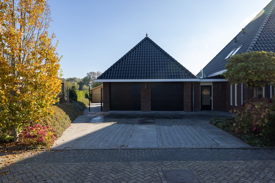 De dubbele garage is voorzien van twee elektrische overhead deuren, gietvloer en een vlizotrap naar de vliering op stahoogte.