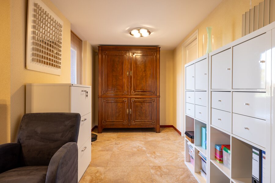 Spacious office with its own entrance at the front and a throughway to the utility room. Generous living/dining room with a gas fireplace, tiled floor with underfloor heating, air conditioning (2023), French doors to the garden, and sliding glass-panelled doors surrounded by built-in cabinets leading to the kitchen.