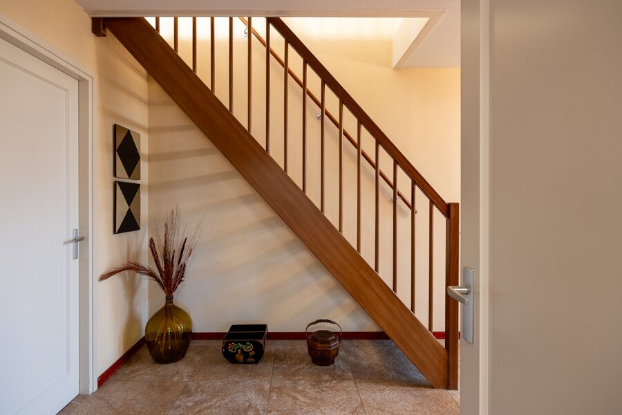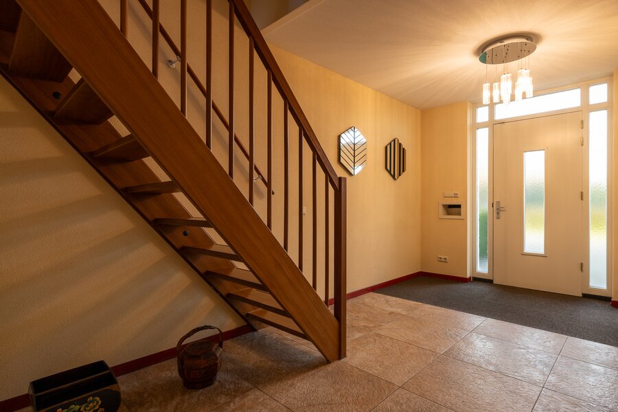 Entree, ruime hal met trapopgang, meterkast, garderobe en toiletruimte. In de meterkast is een water onthardingssysteem (Aquacell) geïnstalleerd.