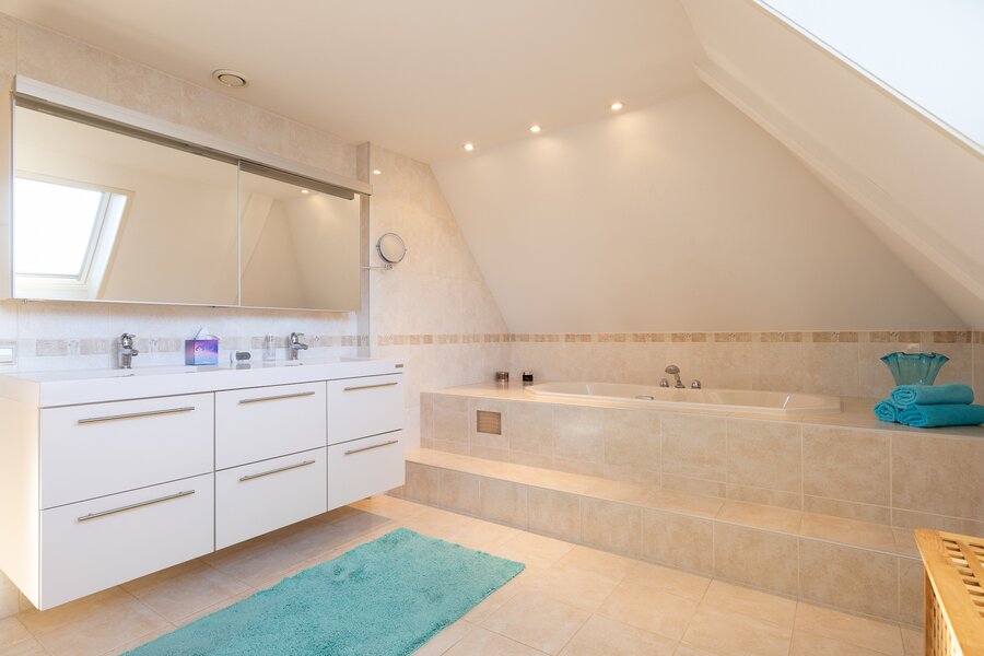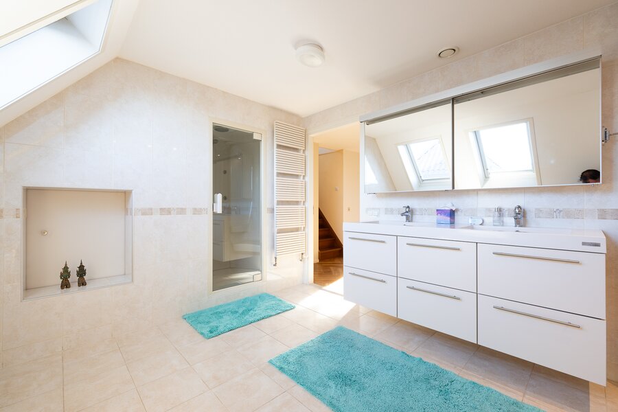 Overloop met toiletruimte. Er zijn twee badkamers. De eerste badkamer is voorzien van een douche, wastafel en ruimte voor de wasmachine en droger + de nieuwe warmtepomp met boiler. De tweede badkamer beschikt over een separate douchecabine met een stoomfaciliteit, wastafelmeubel met een dubbele wastafel, 2 Velux dakramen en bergruimte.