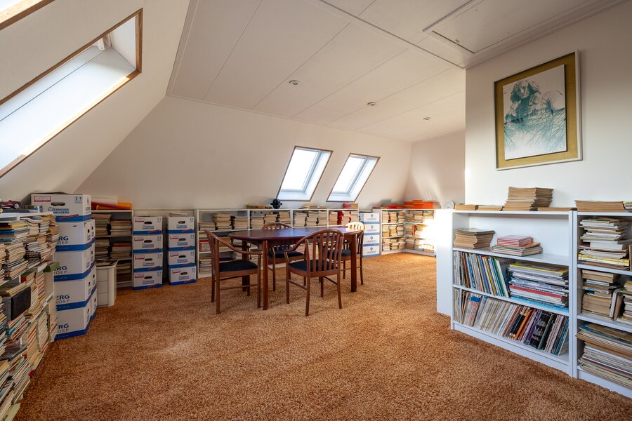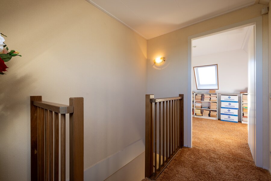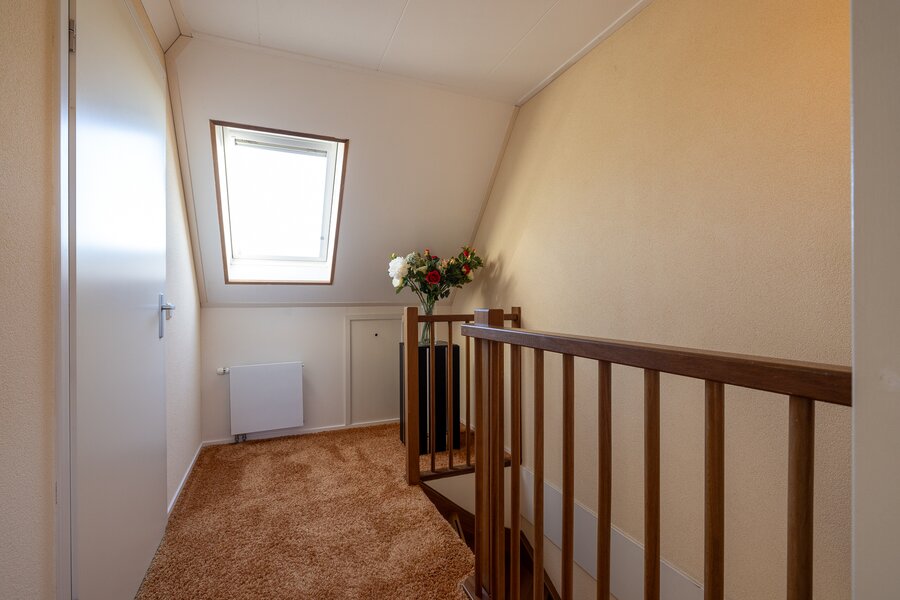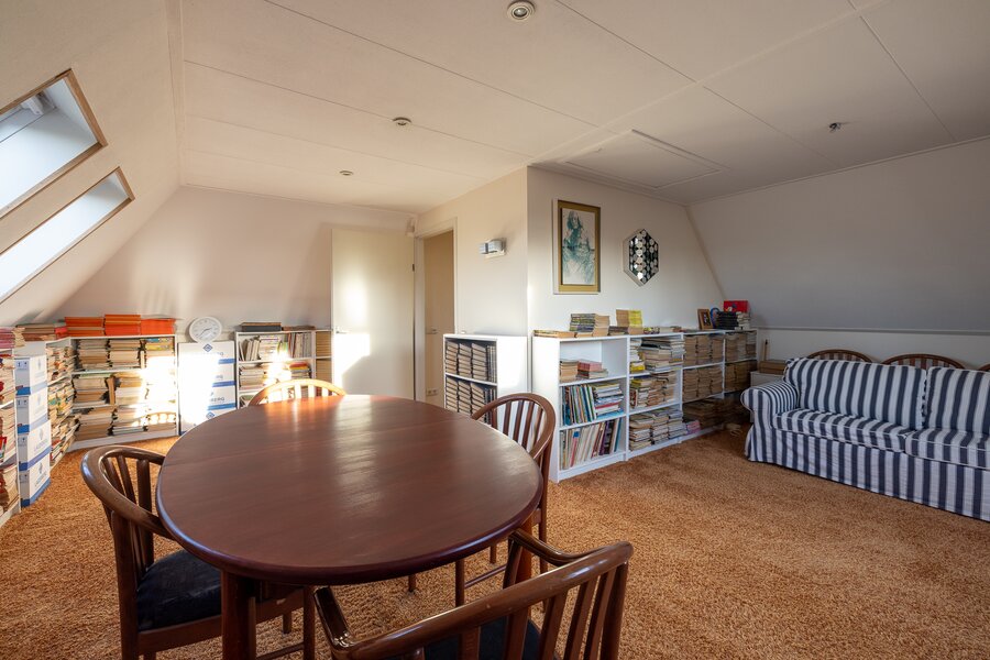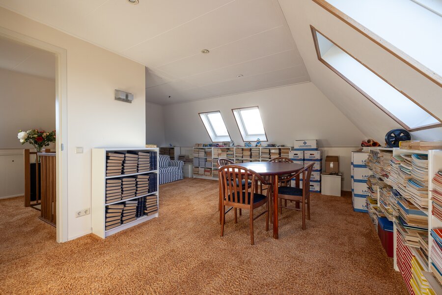 Overloop met bergruimte en dakvenster. Ruime L-vormige slaapkamer met bergruimte via knieschotten en 4 dakvensters, vlizotrap naar de bergzolder. Mocht het wenselijke zijn om meer slaapkamers te creëren, is dit zeer eenvoudig te realiseren.