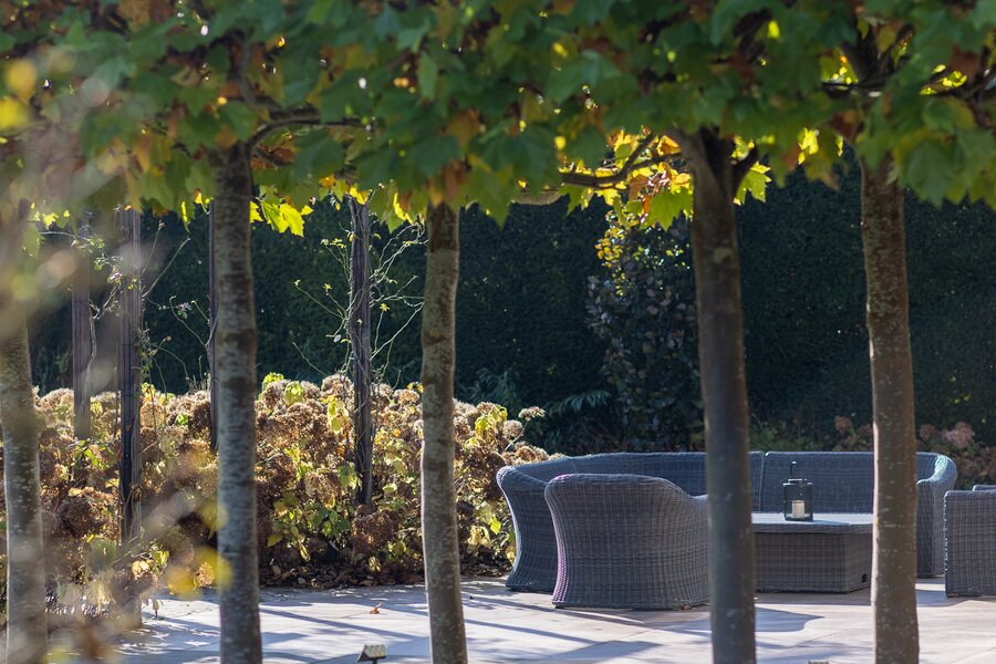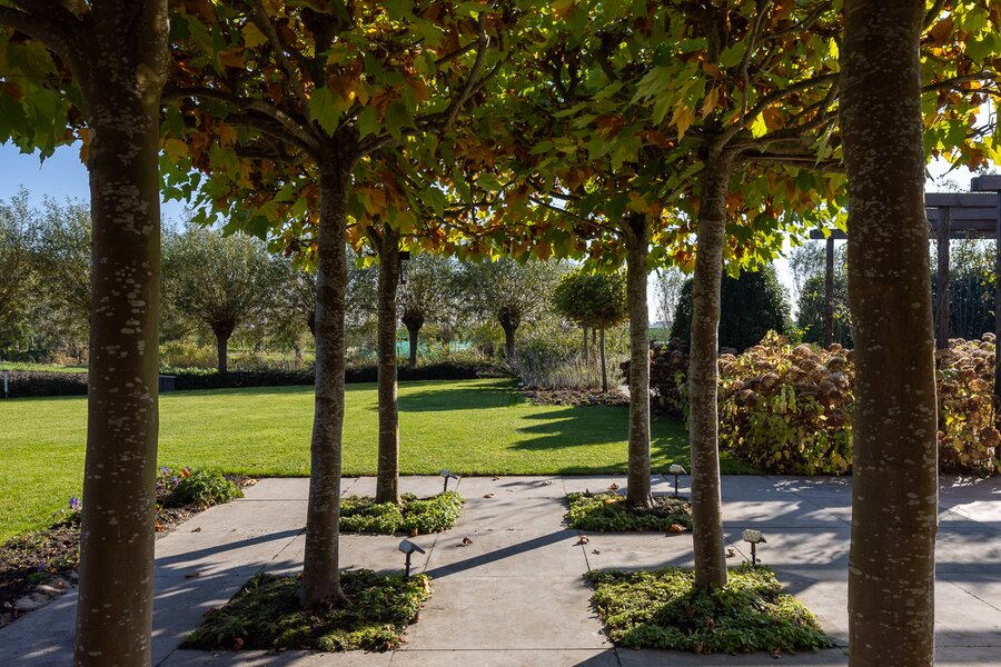 Het huis wordt omringd door de onder architectuur aangelegde en goed onderhouden tuin. In de tuin staat een vrijstaand tuinhuis (2022), met een ruime veranda voorzien van elektra en een digitale regeling voor de bewatering via een zuigpomp in de kreek. In het midden van de tuin loopt een pad via een trap naar de steiger in de kreek.