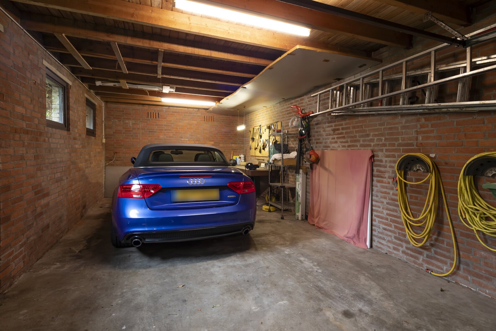 Een houten tuinhuis biedt ruimte voor tuingereedschap en fietsen, terwijl de vrijstaande, uitzonderlijk grote garage met verwarming en elektra, zorgt voor extra gemak. De diepe oprit biedt plaats aan meerdere auto’s, wat ook geldt voor de ruime parkeergelegenheid voor het huis.