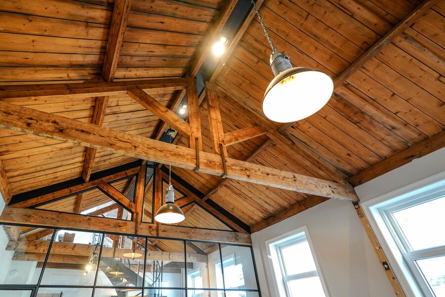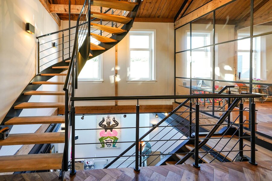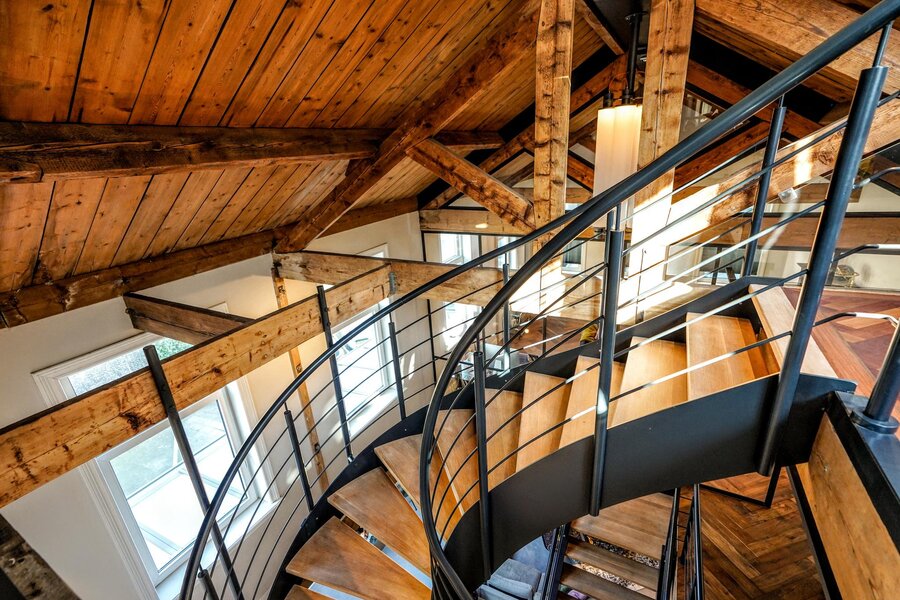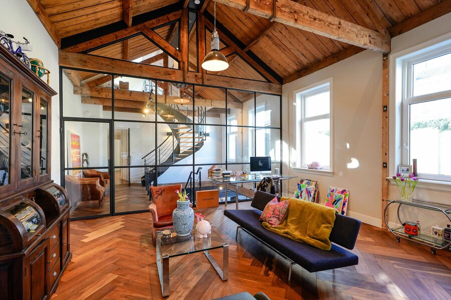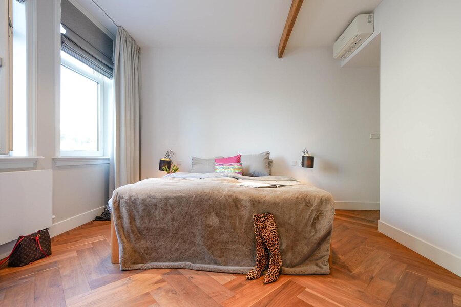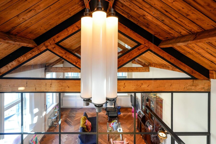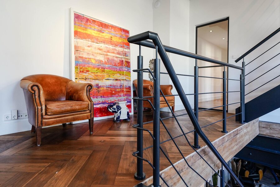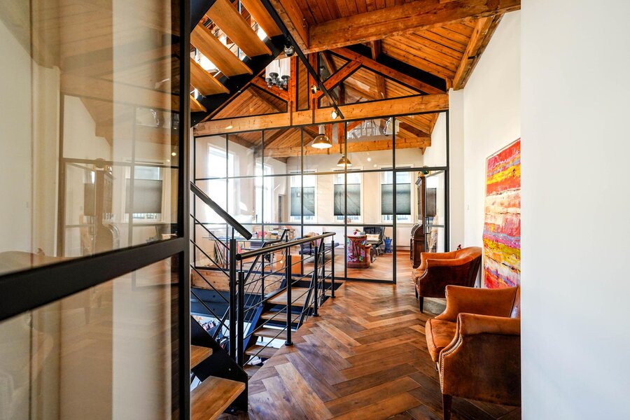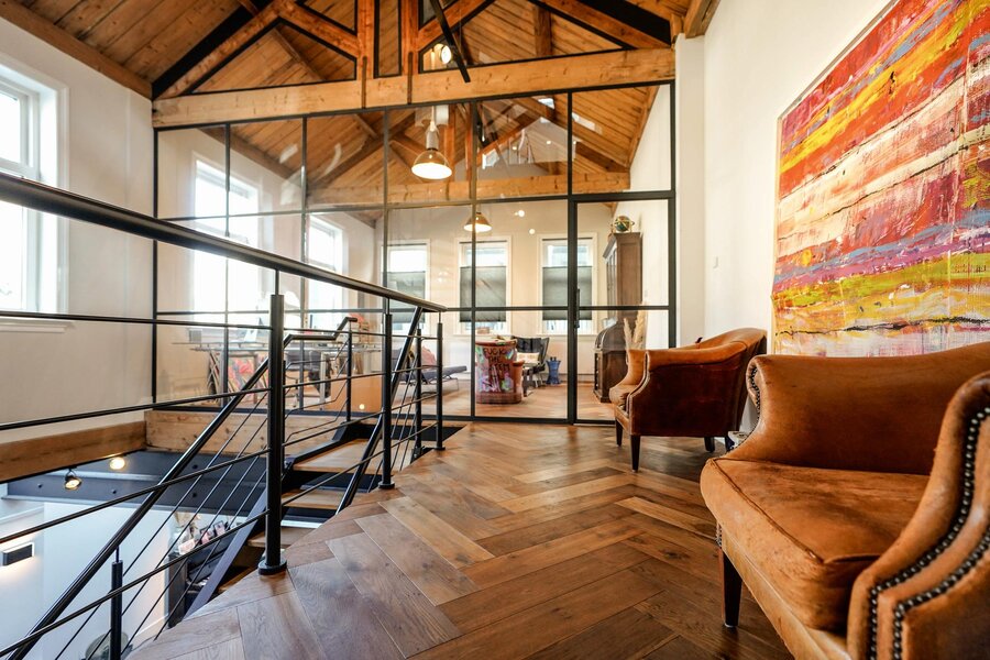 De bovenste etages zijn voorzien van een prachtige visgraatparketvloer en alle constructie balken zijn in het zicht gebleven!