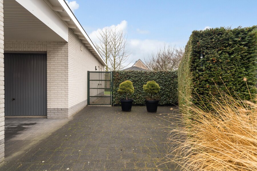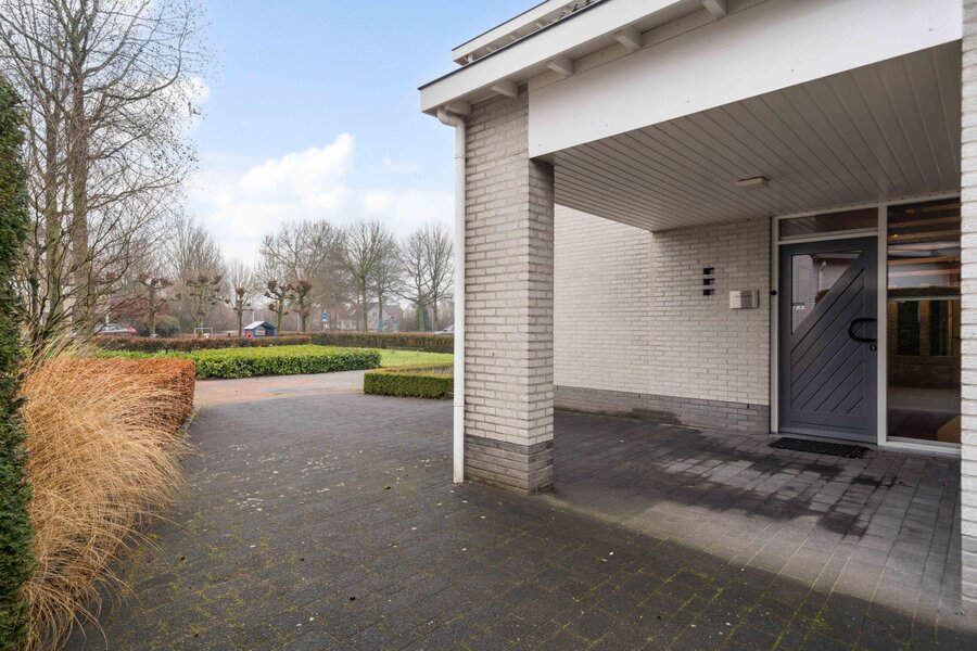 Vanuit het verkeersluwe woonerf is er via de oprit toegang tot de overdekte entree aan de zijkant van de woning. Via de overdekte entree zijn tevens de garage en achterom naar de tuin toegankelijk.