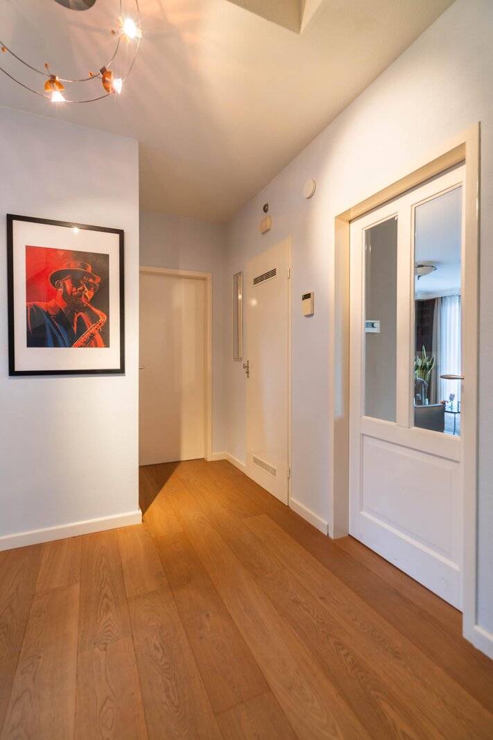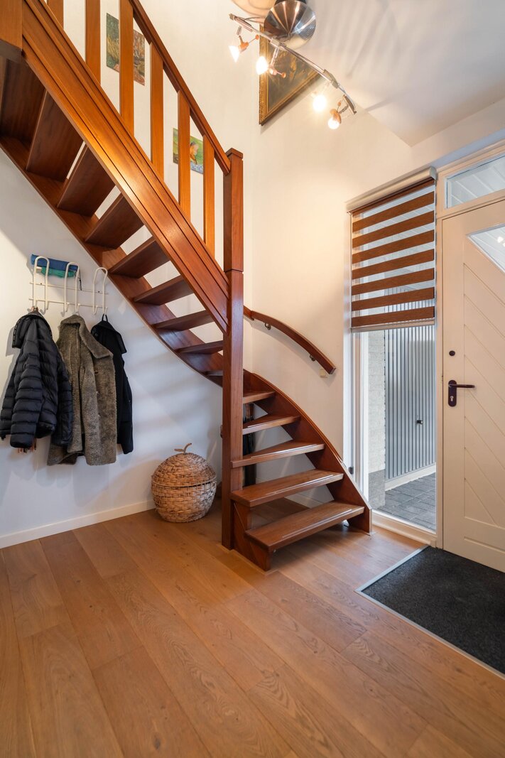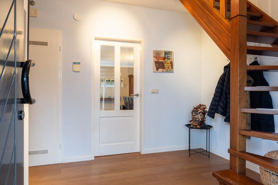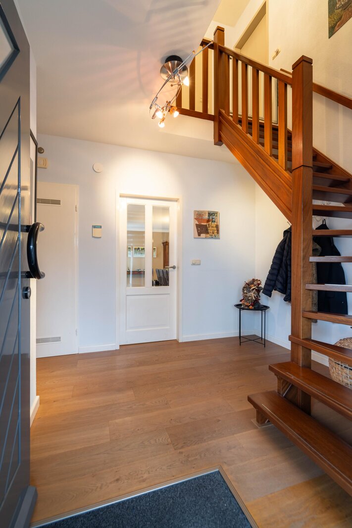 Ruime ontvangsthal met meterkast, garderobe en toiletruimte. Vanuit de hal zijn de woonkamer, multifunctionele kamer en de trapopgang naar de verdieping toegankelijk. De woonkamer is toegankelijk via een deur met glas. De ontvangsthal en woonkamer zijn afgewerkt met een eiken houten vloer.