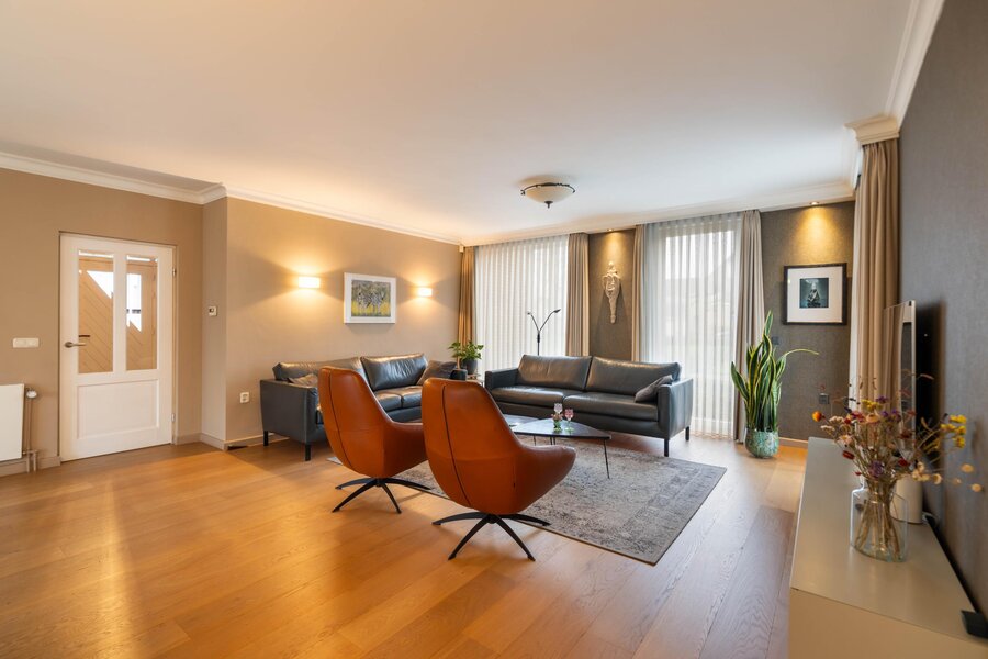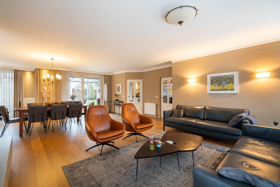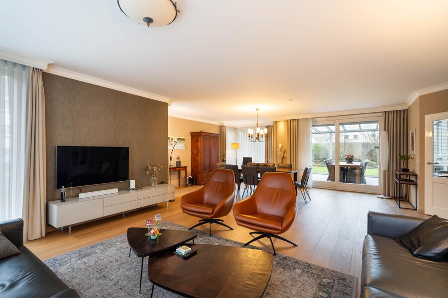 De woonkamer bestaat uit een ruim zitgedeelte aan de voorzijde en een eetgedeelte aan de achterzijde. De woonkamer is voorzien van sfeervolle wandlichtpunten en biedt voldoende ruimte voor grote zit- en eethoek. Via een schuifpui is er toegang tot de tuin. De grote raampartijen en schuifpui zorgen voor veel lichtinval en een aangenaam contact met buiten. Vanuit woonkamer is er toegang tot de keuken.