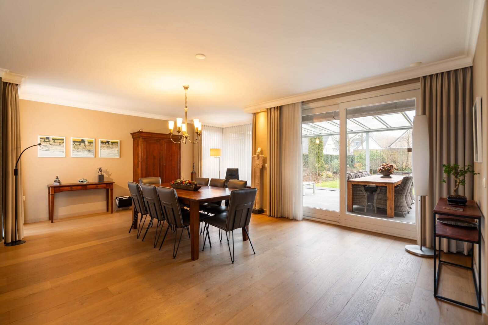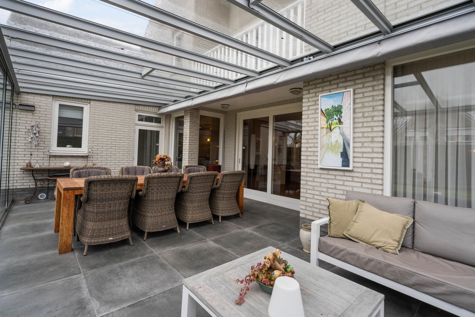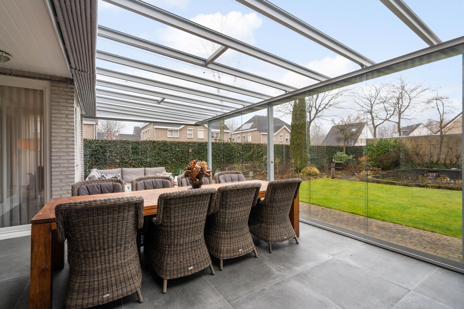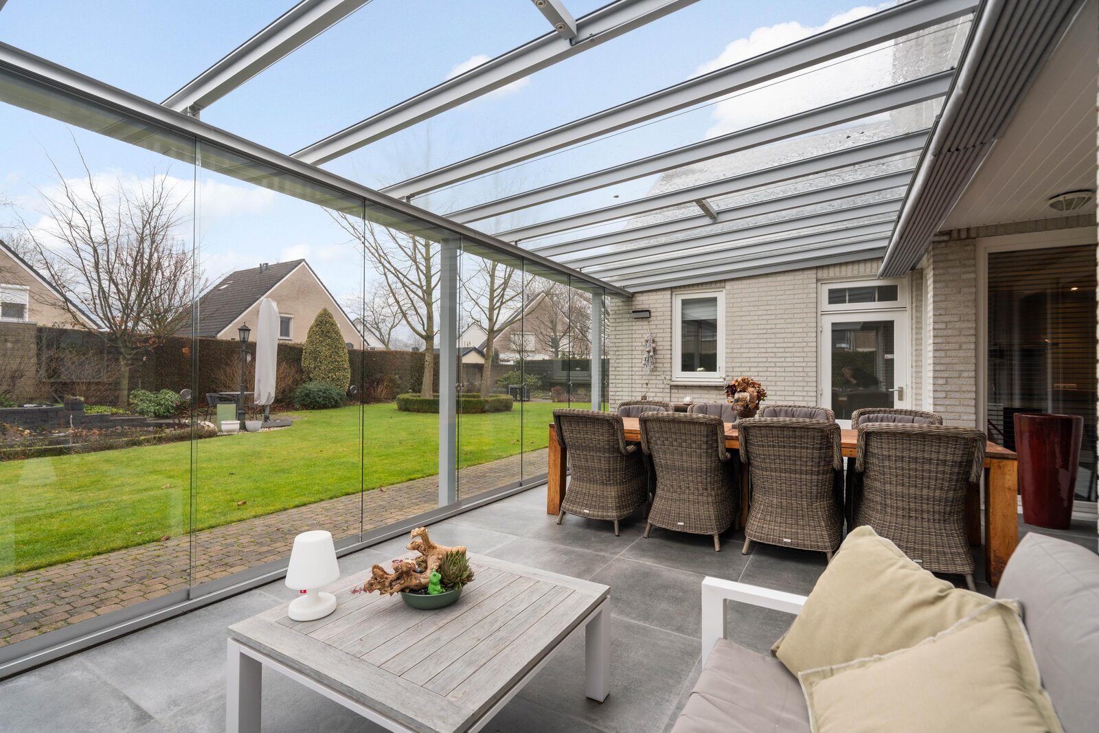 Vanuit woonkamer en bijkeuken is er toegang tot de tuinkamer. De tuinkamer is afgewerkt met tegelvloer met vloerisolatie en is voorzien van op afstand bedienbare verlichting en zonwering. Vanuit de tuinkamer is er een prachtig zicht op de tuin. De tuinkamer biedt voldoende ruimte voor een loungeset en eethoek. Via glazen schuifpanelen is er toegang tot de tuin.