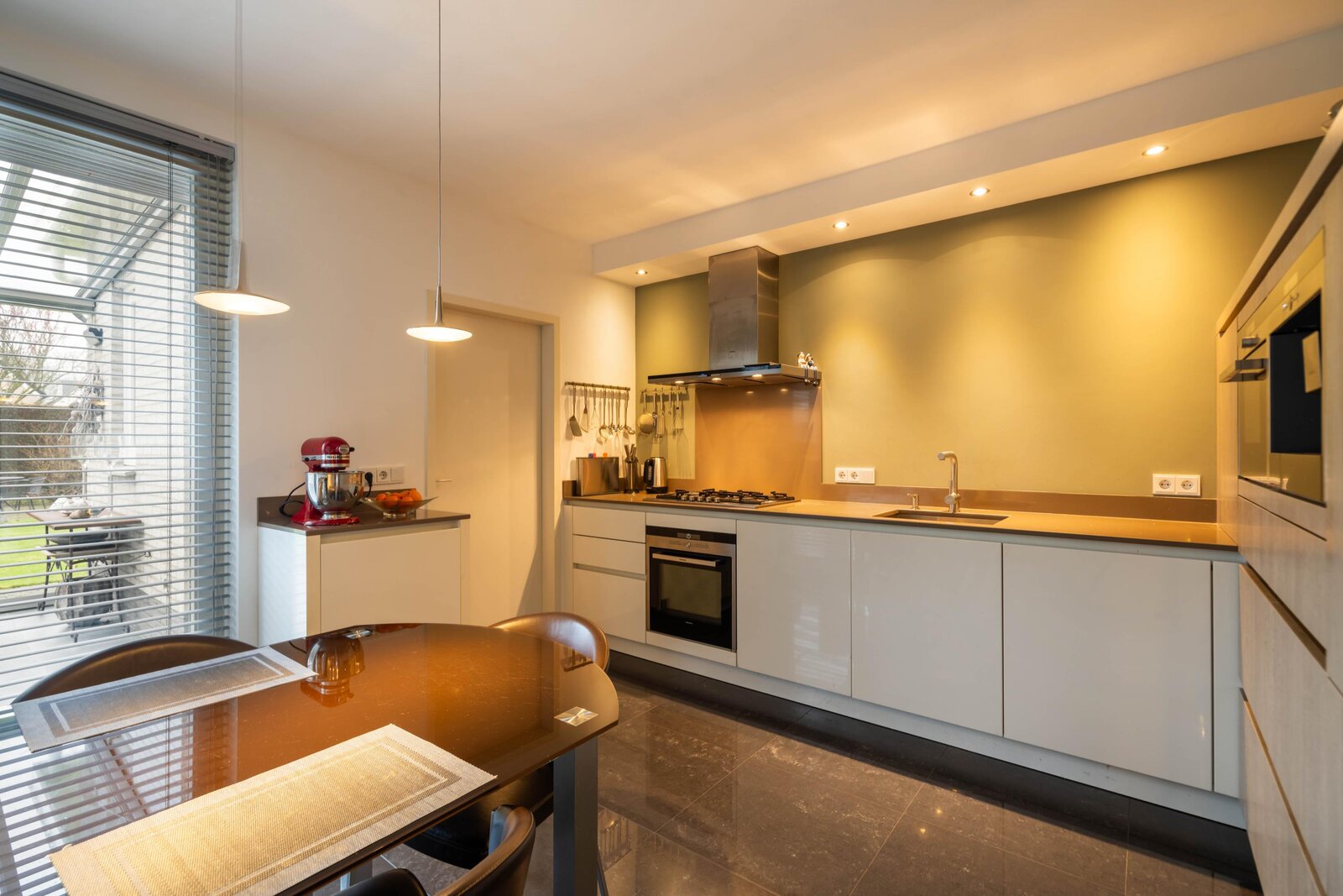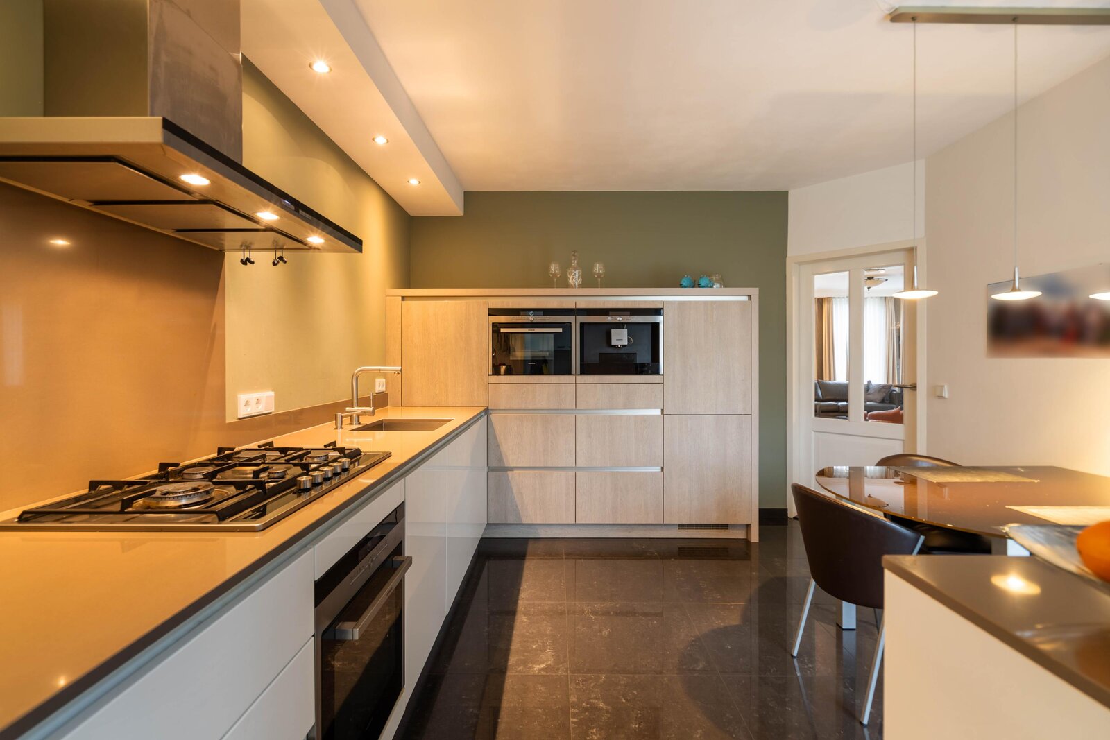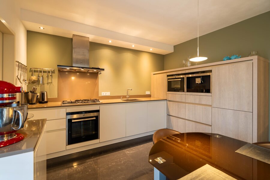 De keuken is afgewerkt met een tegelvloer, biedt ruimte voor een eethoek en is voorzien van een ruime moderne hoekopstelling en een kleine extra wandopstelling. De hoekopstelling bestaat uit diverse kasten, lades en een werkblad met spoelbak en 5-pits gaskookplaat. De keuken beschikt tevens over een afzuigkap, oven, combi-oven, inbouw koffiezetapparaat, koelkast en een vaatwasser. Boven de wandopstelling bevindt zich een koof met inbouwspots. Vanuit de keuken is er toegang tot de bijkeuken.