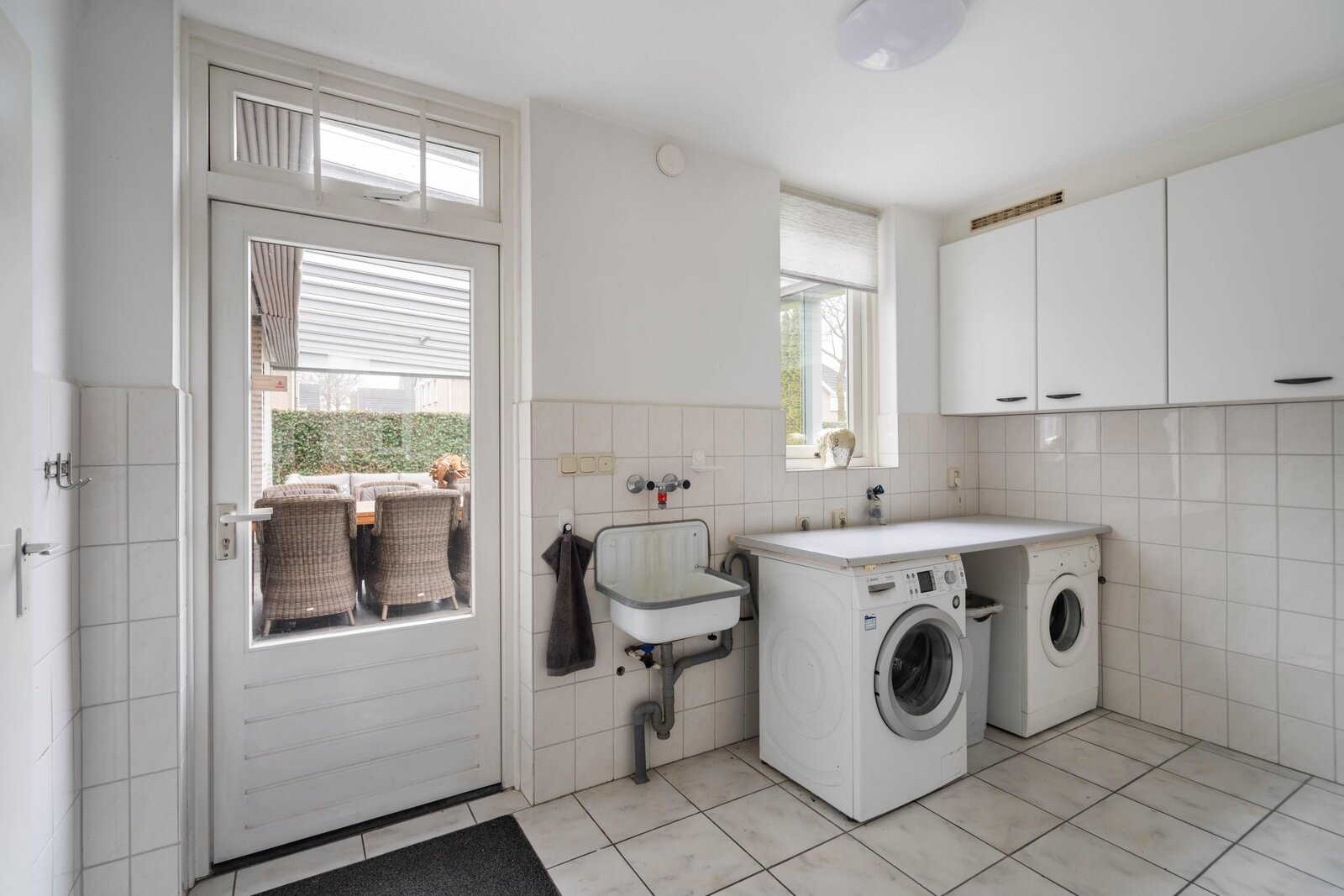 Deels betegelde bijkeuken met een uitstortgootsteen, witgoedaansluitingen en veel praktische bergruimte. Vanuit de bijkeuken zijn de garage en de tuinkamer toegankelijk.