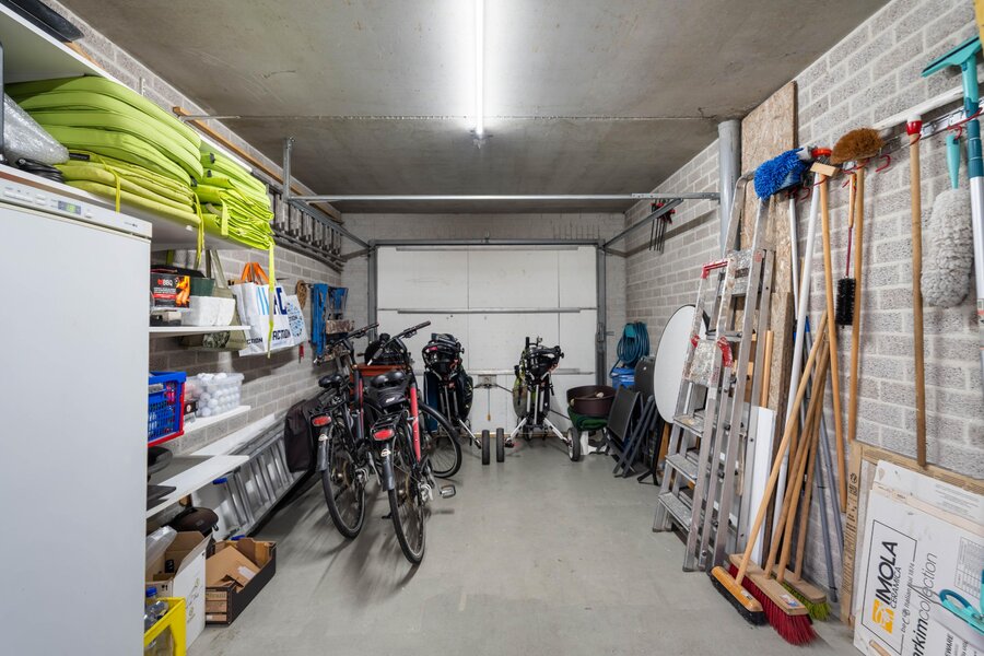 Ruime inpandig te bereiken garage met veel praktische bergruimte, elektra, verlichting en water. Via een loopdeur is er toegang tot de tuin en via een kantelpoort is de oprit met carport toegankelijk.