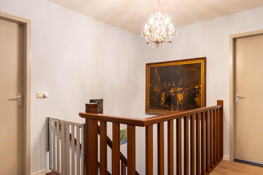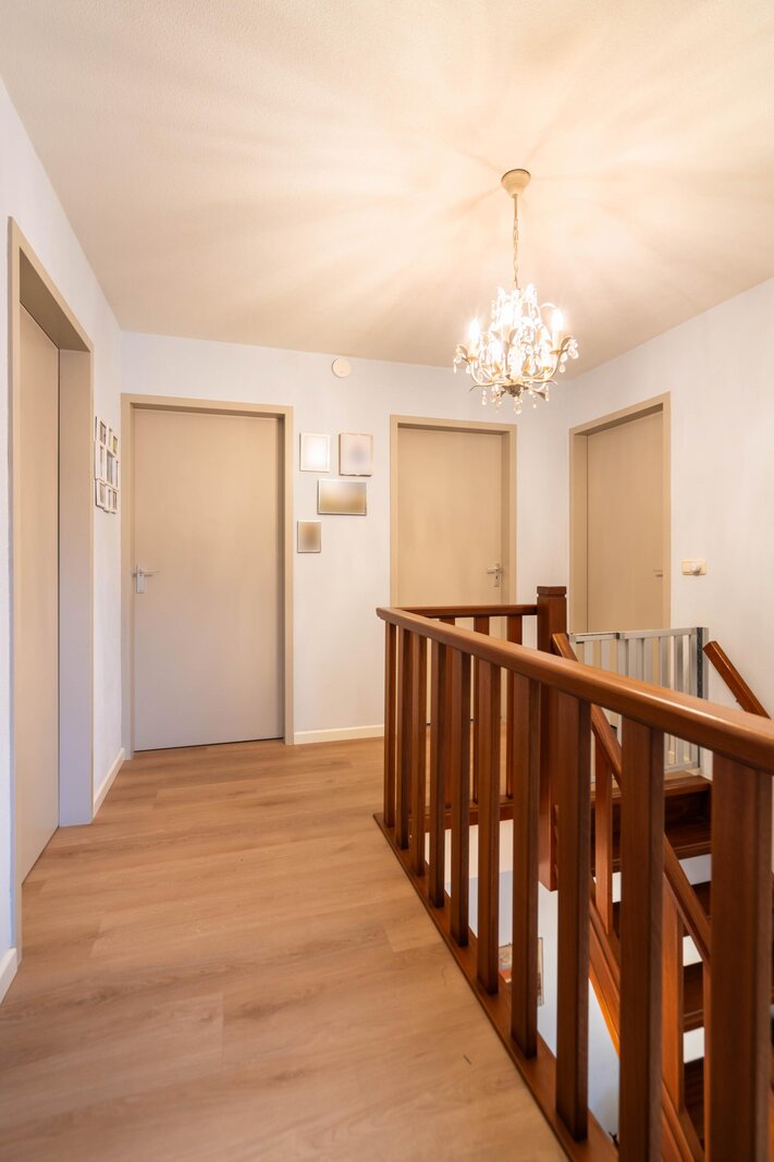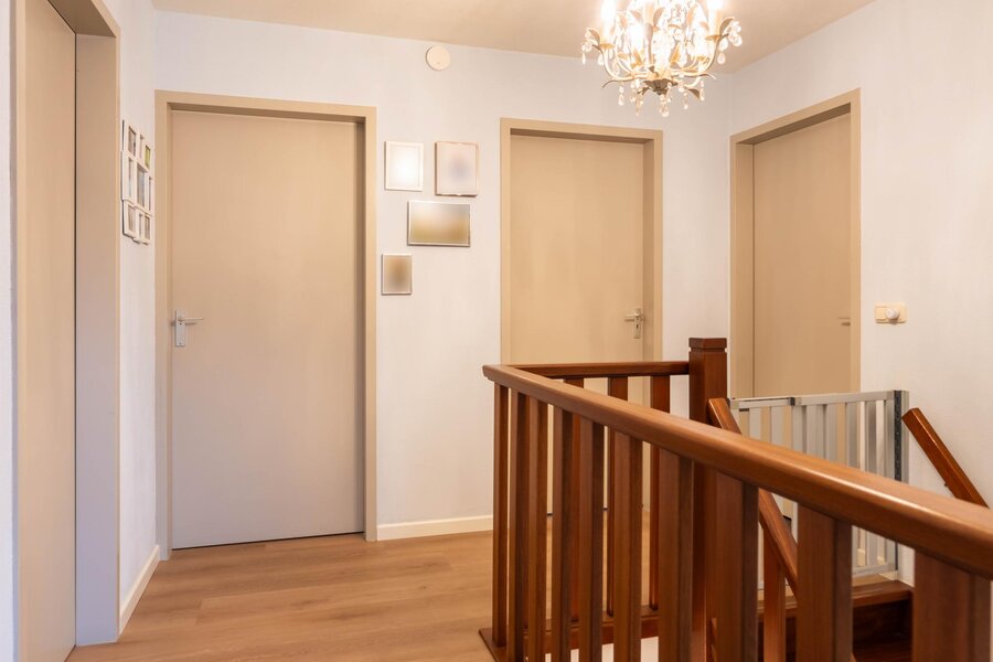 Vanuit de overloop zijn 3 slaapkamers, de badkamer en de hobbyruimte toegankelijk. De overloop en slaapkamers zijn afgewerkt met dezelfde PVC-vloer. Het schilderwerk is in 2024 vernieuwd.