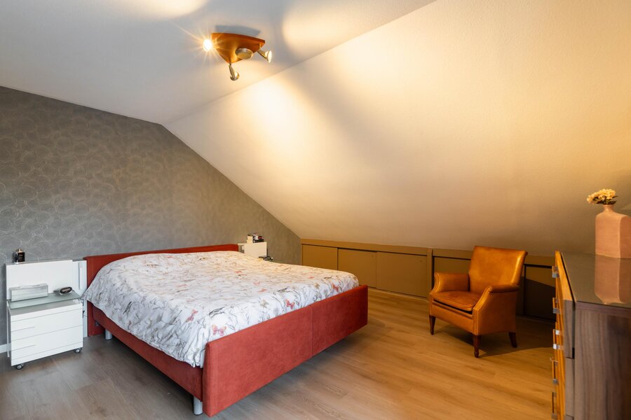 Ruime (hoofd)slaapkamer, gelegen aan de linker achterzijde van de woning. De kamer beschikt over bergkasten in het schuine gedeelte, biedt voldoende ruimte voor een tweepersoonsbed. Via openslaande deuren met rolhordeur is er toegang tot het balkon aan de achterzijde van de woning.