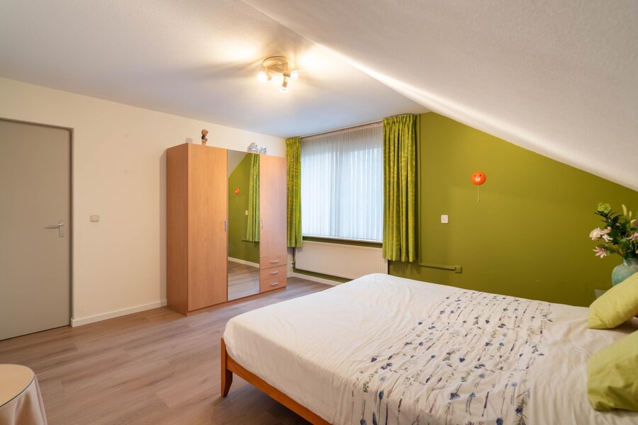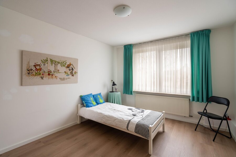 Riante slaapkamer, gelegen aan de linker voorzijde van de woning. De kamer biedt voldoende ruimte voor een tweepersoonsbed, een kledingkast en/of een dressoir. De te openen raampartij is voorzien van een hor en een rolluik.