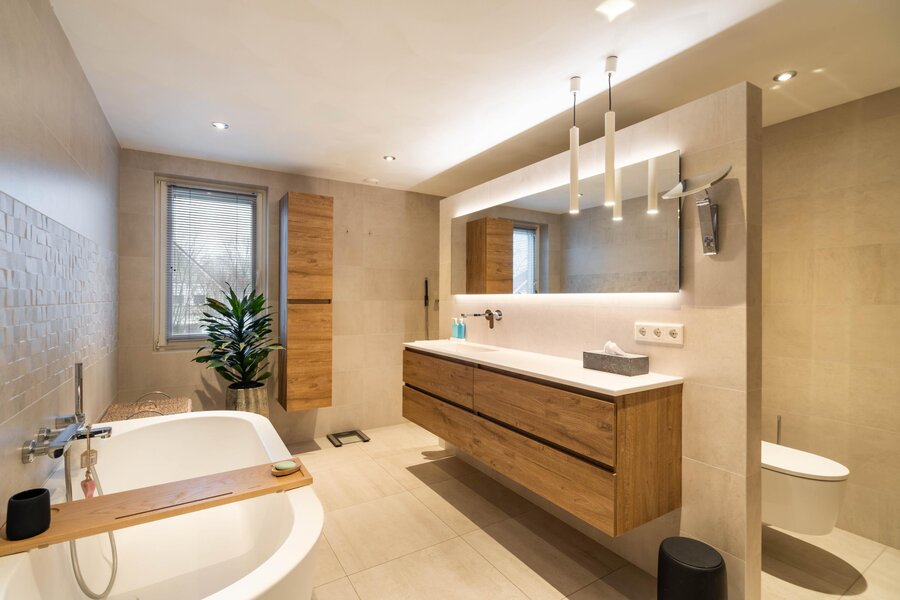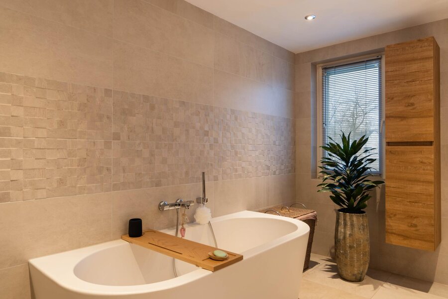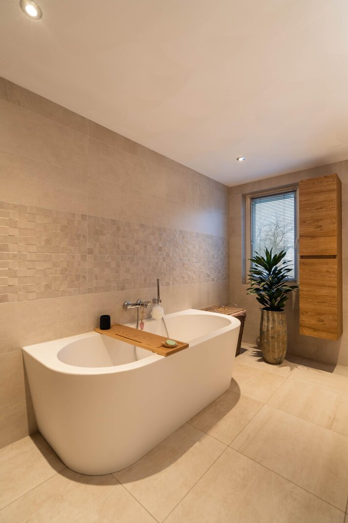 Riante luxe badkamer met een semi-vrijstaand ligbad, royale inloopdouche, toilet, badkamerkast en een wastafel met een groot bijbehorend wastafelmeubel en een spiegel met indirecte verlichting. De inloopdouche beschikt over inbouwkranen en is voorzien van een draingoot, glijstang met handdouche en rainshower. De badkamer is geheel betegeld, heeft elektrische vloerverwarming, een design wandradiator en is voorzien van diverse inbouwspots. De te openen raampartij zorgt voor een aangename daglichttoetreding en is voorzien van een rolhor en een luxaflex aluminium jaloezie.