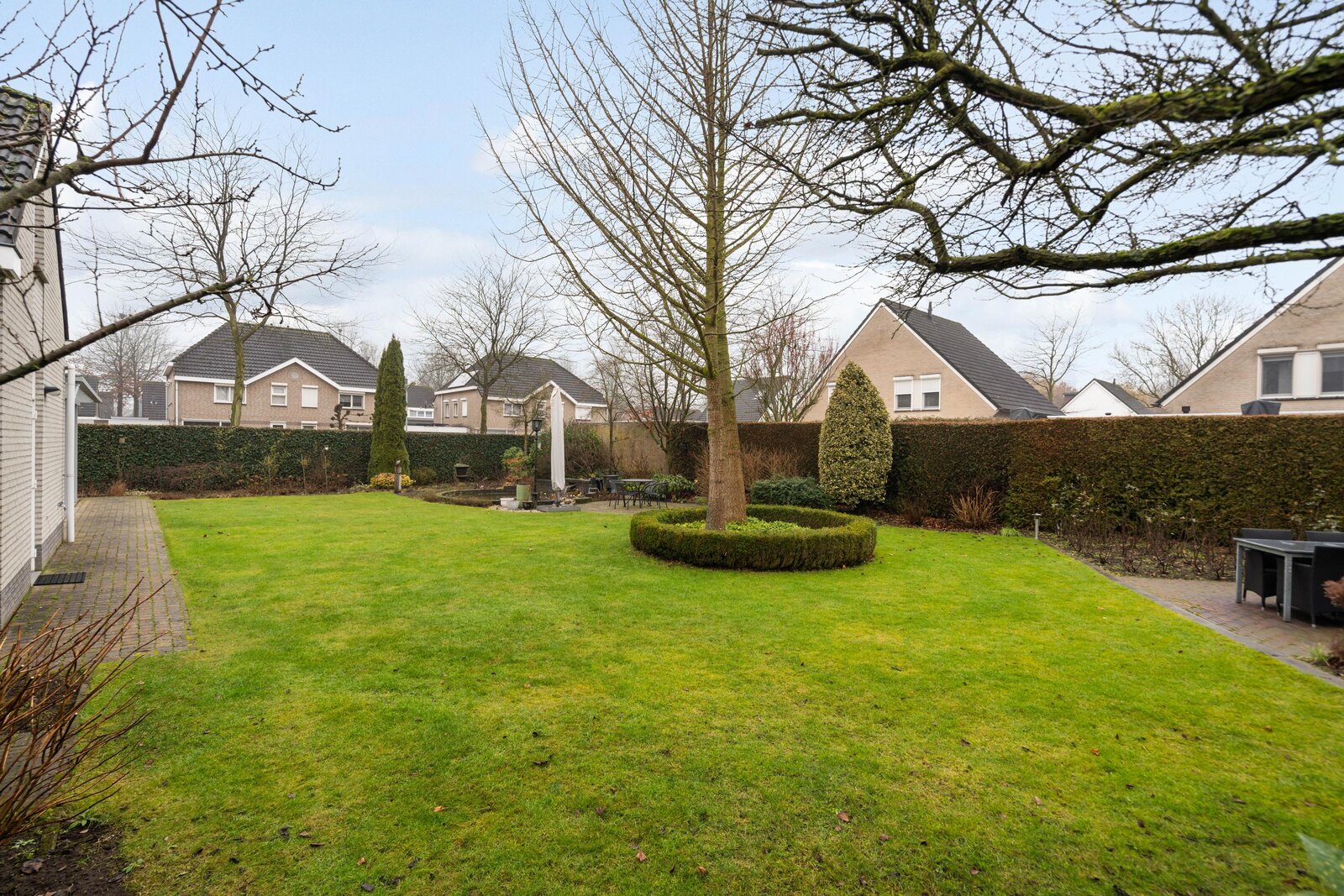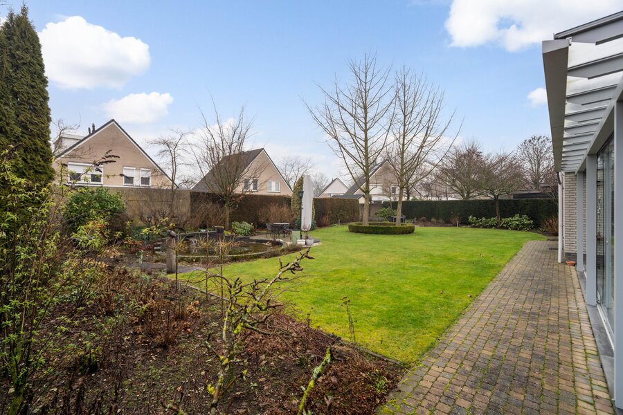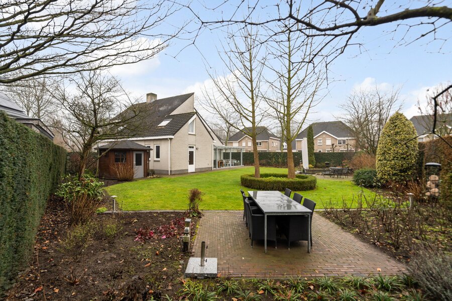 De tuin bestaat uit een bestraat looppad, een riant gazon, vijverpartij en diverse borders met volwassen bomen, planten, hagen en struiken. Aan de achterzijde bevindt zich nog een extra terras met voldoende ruimte voor een loungeset of eethoek. Ook vanuit dit terras is er een fraai zicht op de tuin. De tuin is op diverse plaatsen voorzien van verlichting. Aan de zijkant van de woning bevindt zich een houten tuinhuis met veel praktische bergruimte. Via een afsluitbare looppoort is er toegang tot de oprit.