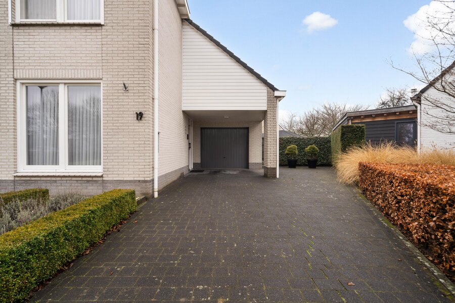 Aan de rechterzijde van de woning bevindt zich een ruime carport. De carport en voorliggende oprit bieden in totaal voldoende ruimte om meerdere auto's op eigen terrein te parkeren.