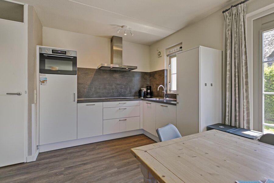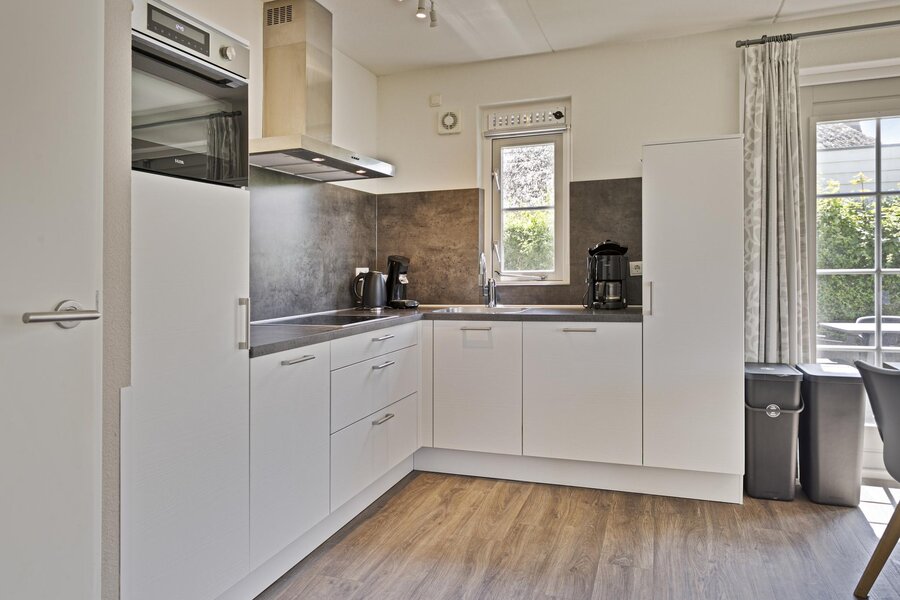 De slaapkamer op de begane grond ligt aan de achterzijde van de woning en heeft een eigen badkamer met douche en wastafel. Aan de voorzijde vindt u de woonkamer en de woonkeuken met inbouwapparatuur. De woonkeuken, in hoekopstelling, is uitgerust met een keramische kookplaat, afzuigkap, vaatwasser, koelkast met vriesvak en een combi-oven. Vanuit de keuken heeft u toegang tot de tuin met zonneterras.