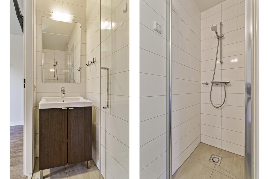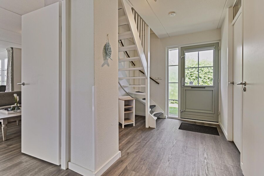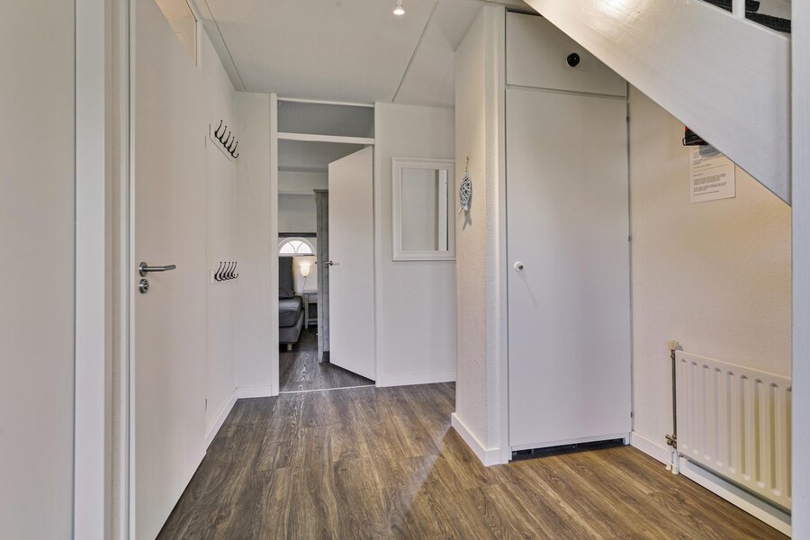 Bij binnenkomst treft u een ruime entree met meterkast, toilet, toegang naar de inpandige berging, de slaapkamer met badkamer op de begane grond, en de woonkamer met woonkeuken. In de inpandige berging bevinden zich de CV-ketel en de wasmachineaansluiting.
