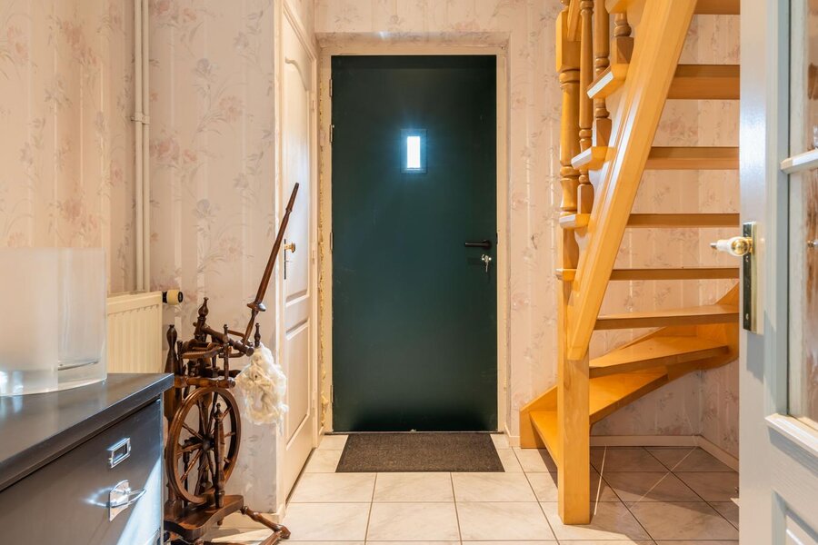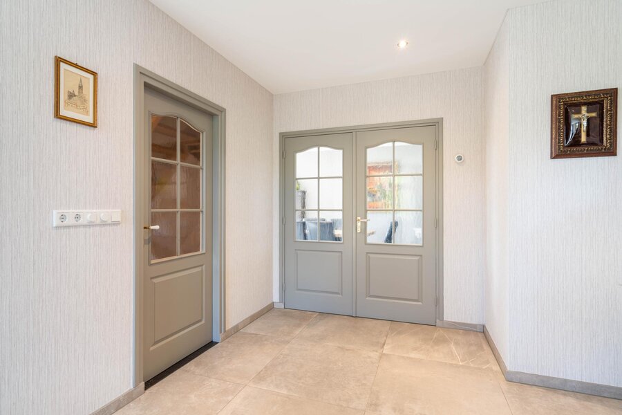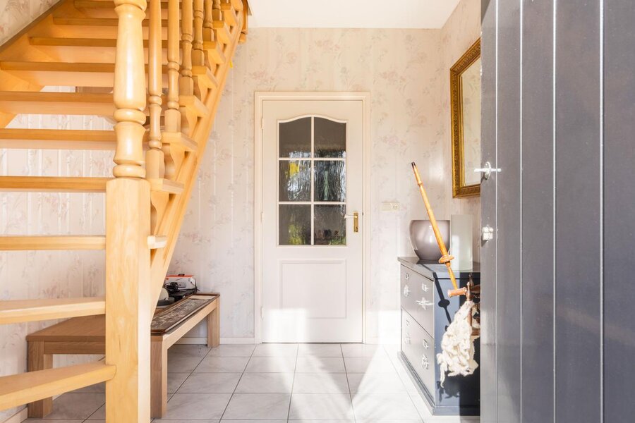 De ontvangsthal biedt plaats aan de meterkast, is afgewerkt met een lichte tegelvloer en voorzien van een spanplafond met inbouwspots. Vanuit de hal zijn de woonkamer en de trapopgang naar de verdieping toegankelijk. De woonkamer is toegankelijk via een deur met glas.