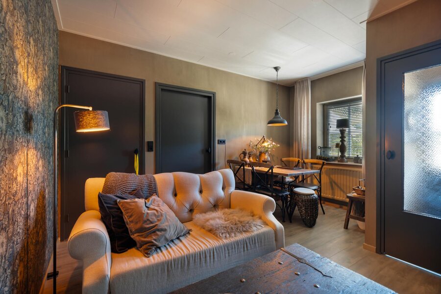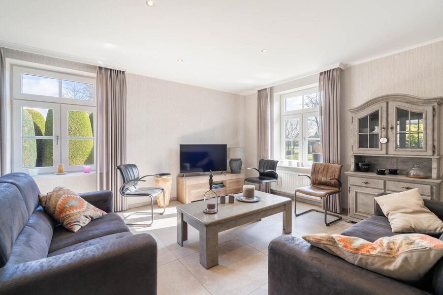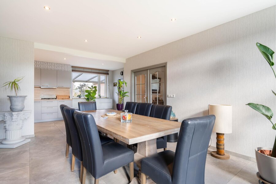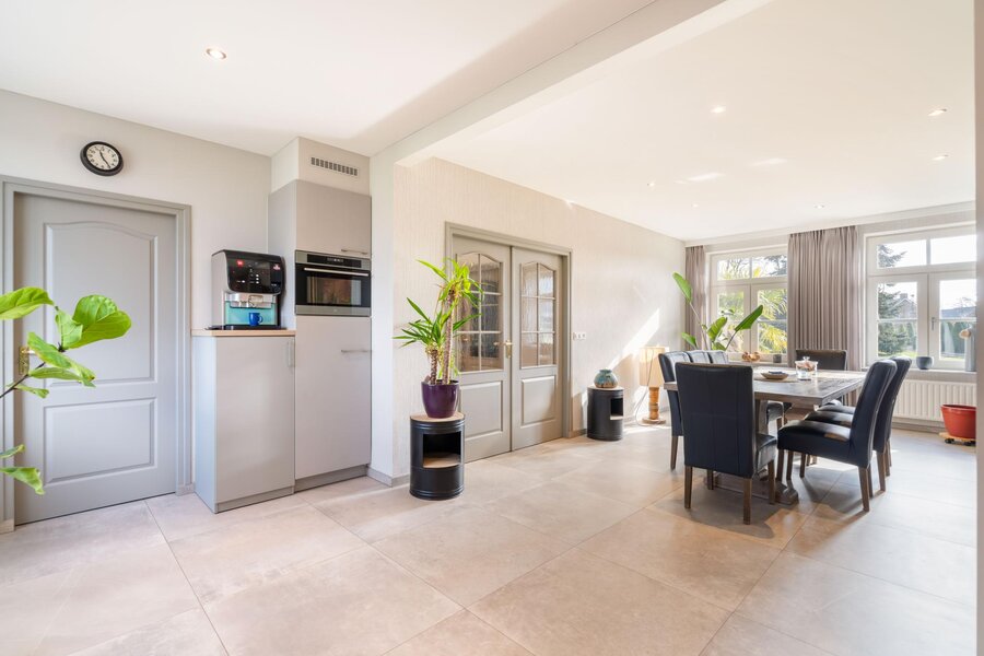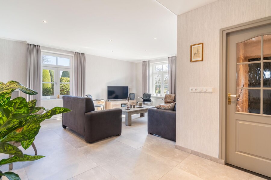 De woonkamer bestaat uit een ruim TV- en zitgedeelte. De grote raampartijen zorgen voor veel lichtinval en een aangenaam contact met buiten. Vanuit de woonkamer is er tevens via openslaande deuren toegang tot de leefkeuken. De woonkamer en de leefkeuken zijn recent (2020) afgewerkt met een tegelvloer (voorzien van vloerverwarming) en voorzien van een spanplafond met inbouwspots.