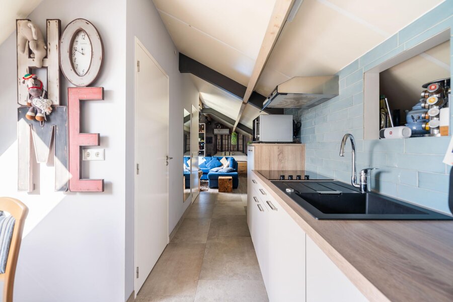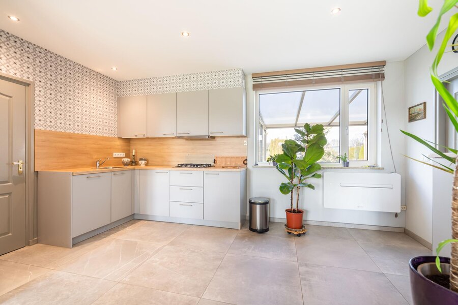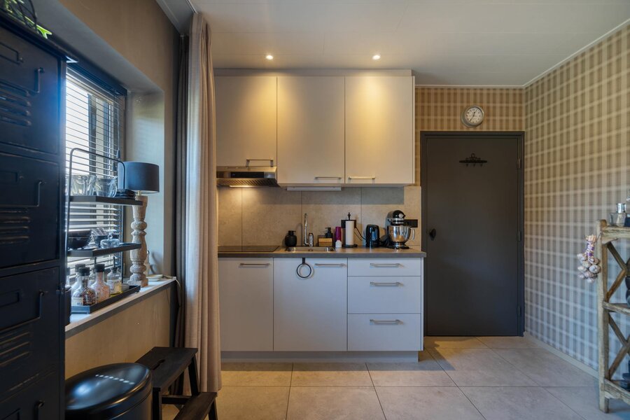 De leefkeuken biedt voldoende ruimte voor een grote eethoek en is voorzien van een moderne hoekopstelling en een wandopstelling. De wandopstelling bestaat uit diverse bergkasten, lades en een werkblad met spoelbak en 4-pits gaskookplaat. De hoekopstelling is tevens voorzien van een afzuigkap en een vaatwasser. De wandopstelling is voorzien van een koelkast en een combi-oven. Hier bevinden zich tevens een 'koffiecorner' en extra bergkast. De keuken is tevens recent (2024) voorzien van airconditioning om te verwarmen en te koelen. Vanuit de leefkeuken zijn het portaal naar de tuin en de gang naar de slaapkamer, bijkeuken, badkamer en toiletruimte toegankelijk. Het portaal naar de tuin is voorzien van een ruime muurkast.