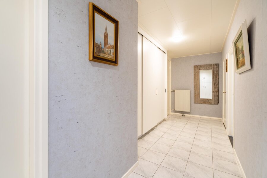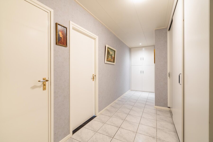 De gang is afgewerkt met een tegelvloer en is voorzien van diverse inbouwspots. Vanuit de gang zijn de bijkeuken, (hoofd)slaapkamer, badkamer en de toiletruimte toegankelijk. In de gang bevindt zich tevens een ruime maatwerk schuifkastenwand met veel praktische bergruimte. Met een eenvoudige ingreep is de oorspronkelijk doorgang (ter plaatse van de muurkast) naar het aparte woongedeelte weer open te maken waardoor er weer een geheel ontstaat met meerdere levensloopbestendige (slaap)kamers en badkamers op de begane grond.