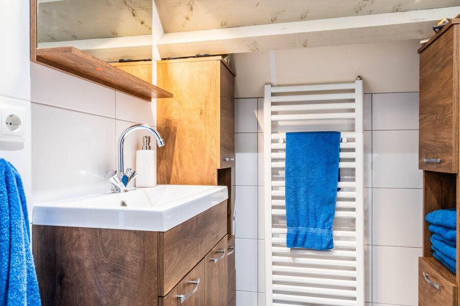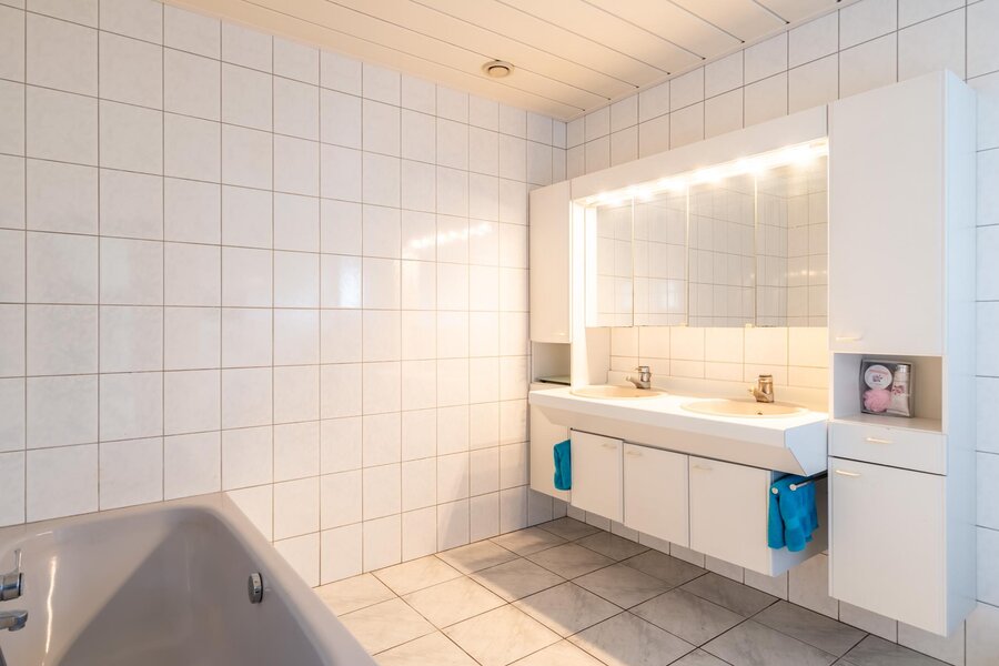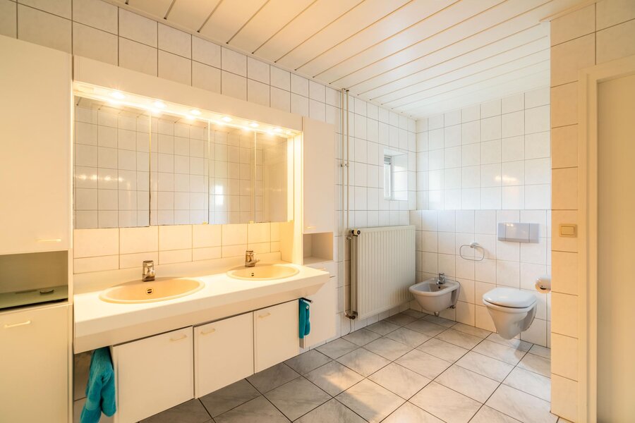 De badkamer is geheel betegeld en voorzien van een ligbad/douche, een extra toilet, bidet en een dubbele wastafel met een groot bijbehorend wastafelmeubel, bestaande uit diverse bergkasten, spiegelkasten en verlichting. Het raampje zorgt voor een aangename daglichttoetreding en is voorzien van een ventilatieschuif.